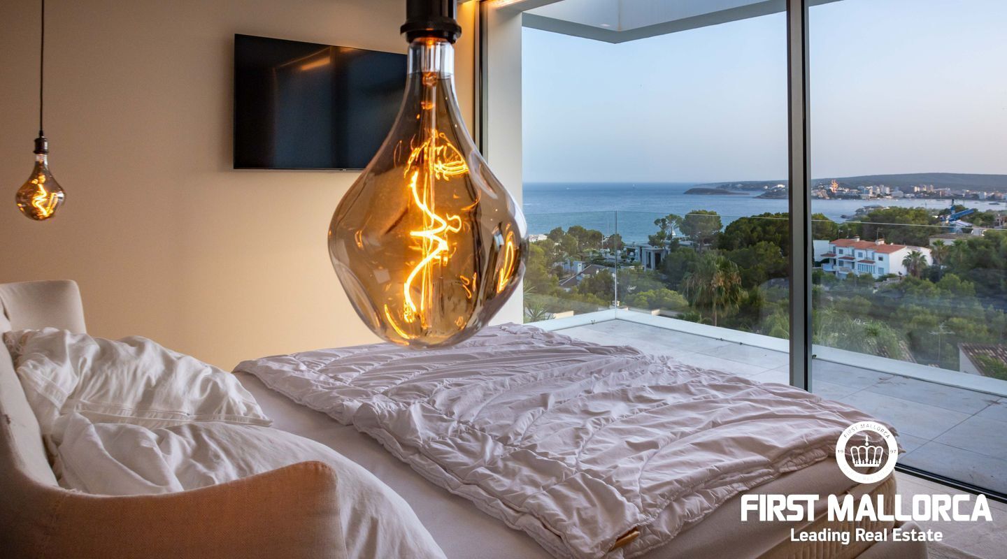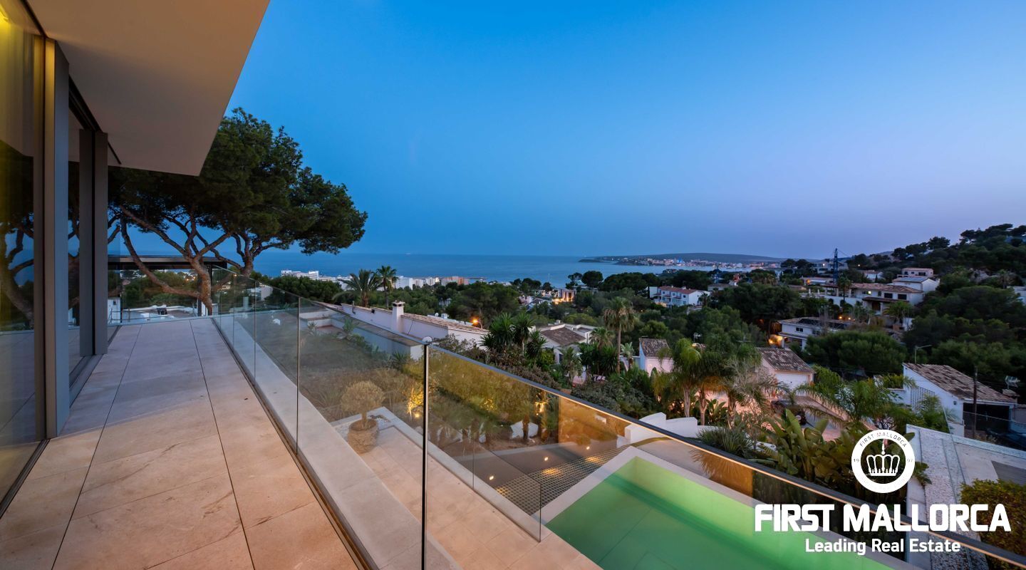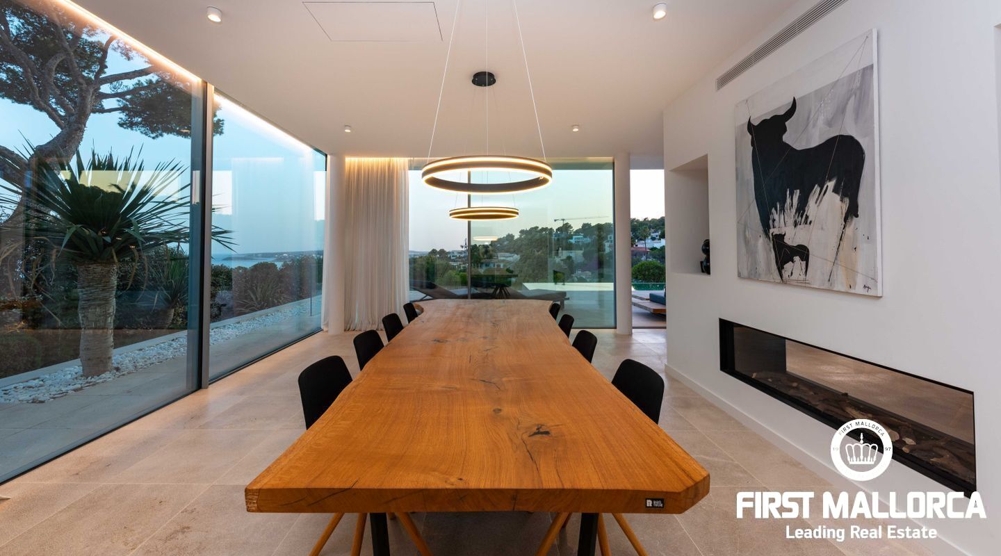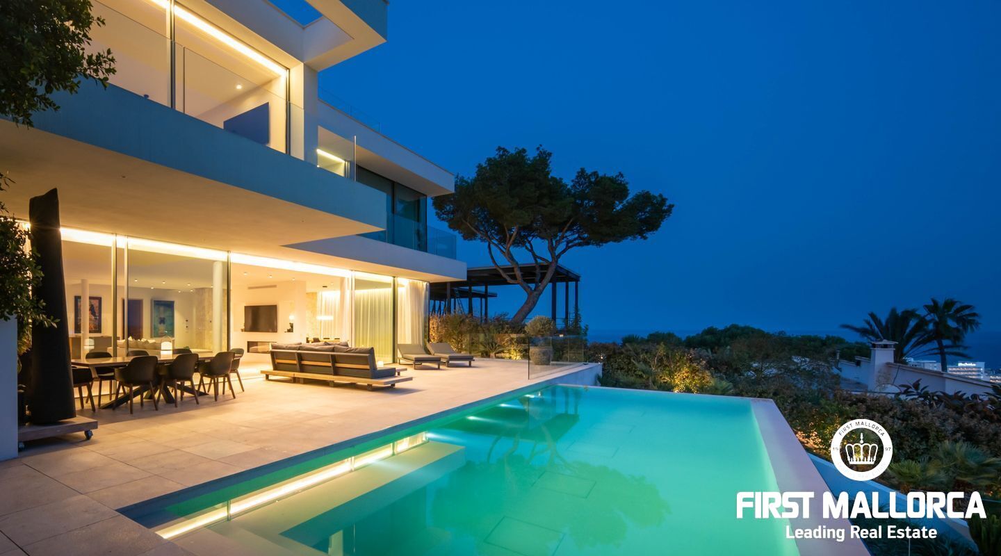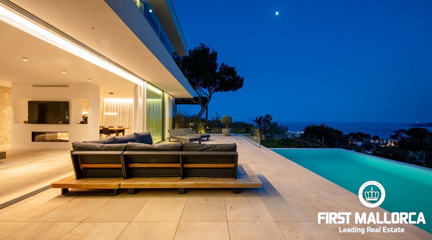 Diese moderne und lichtdurchflutete Villa in Costa d’en Blanes bietet atemberaubende Ausblicke auf das Meer und den Hafen von Puerto Portals aus allen Räumen sowie unvergessliche Sonnenuntergänge dank der Süd-/Südwest-Ausrichtung.