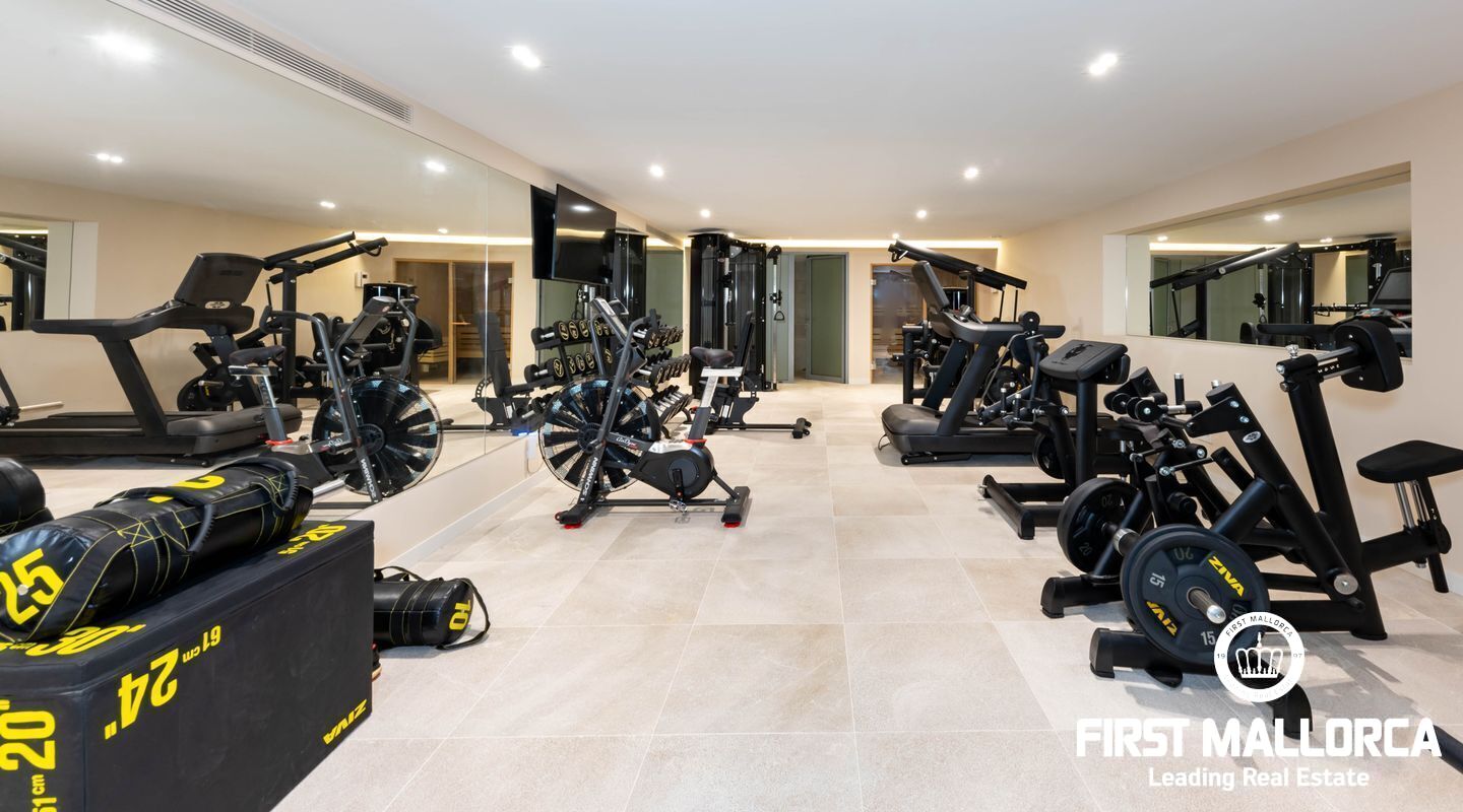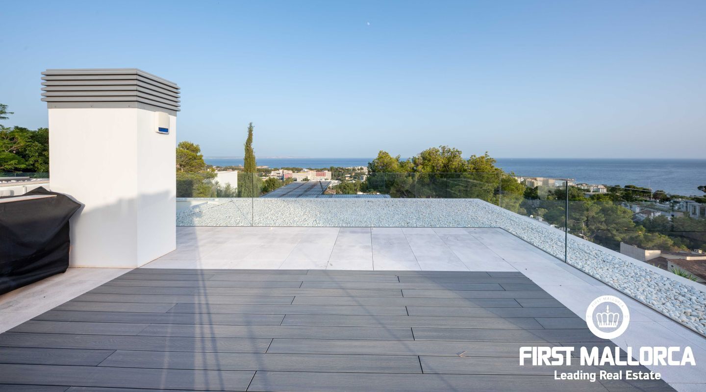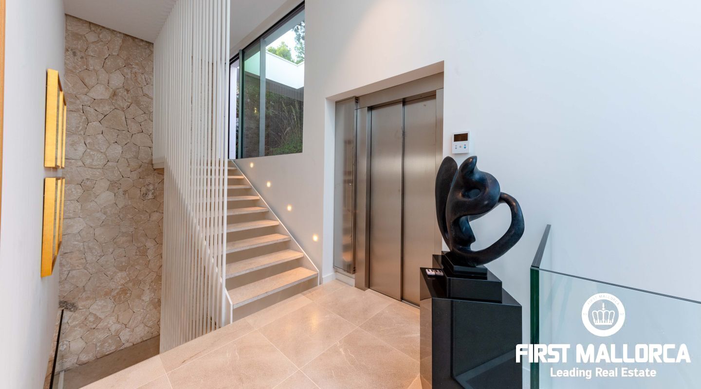 Im Obergeschoss befinden sich vier elegante Schlafzimmer-Suiten – alle mit Meerblick, Ankleide oder Einbauschränken und teilweise mit Terrassen. Im Untergeschoss gibt es eine Garage für 3–4 Autos, ein Fitnessstudio, eine Sauna, ein Bad, einen Hauswirtschaftsraum und einen Mehrzweckraum, der als Heimkino oder Spielzimmer genutzt werden kann. Ein Aufzug verbindet alle Etagen und führt zur spektakulären Dachterrasse mit Chill-out-Lounge, Außenküche und atemberaubendem Panoramablick auf das Meer.