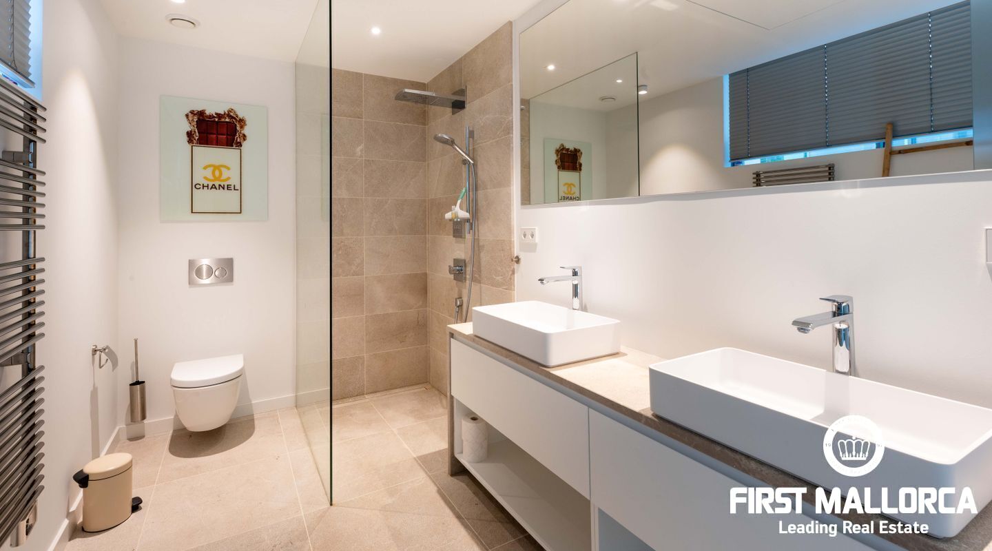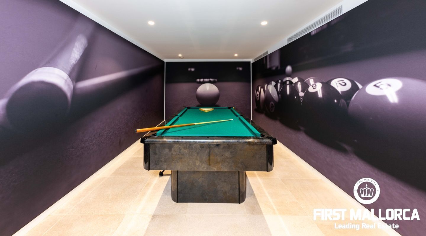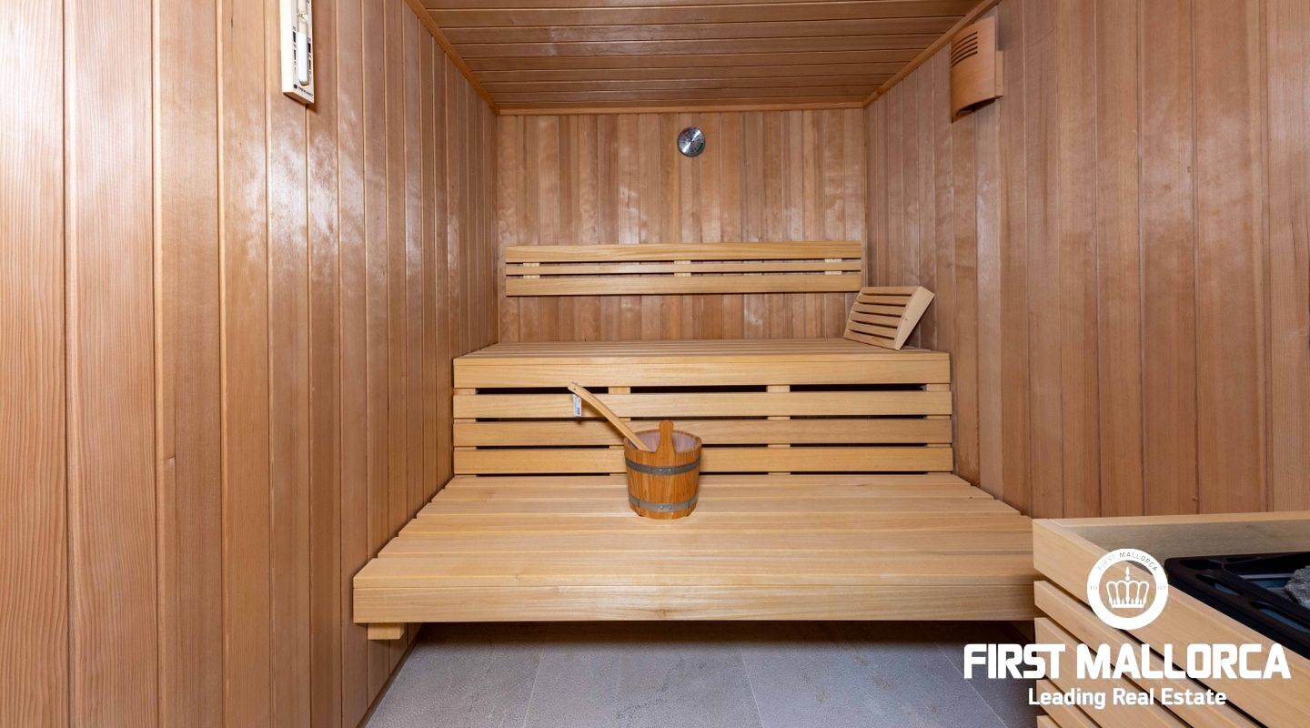 Im Obergeschoss befinden sich vier elegante Schlafzimmer-Suiten – alle mit Meerblick, Ankleide oder Einbauschränken und teilweise mit Terrassen. Im Untergeschoss gibt es eine Garage für 3–4 Autos, ein Fitnessstudio, eine Sauna, ein Bad, einen Hauswirtschaftsraum und einen Mehrzweckraum, der als Heimkino oder Spielzimmer genutzt werden kann. Ein Aufzug verbindet alle Etagen und führt zur spektakulären Dachterrasse mit Chill-out-Lounge, Außenküche und atemberaubendem Panoramablick auf das Meer.
