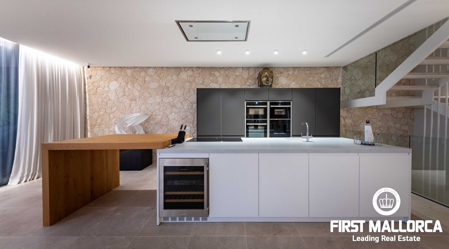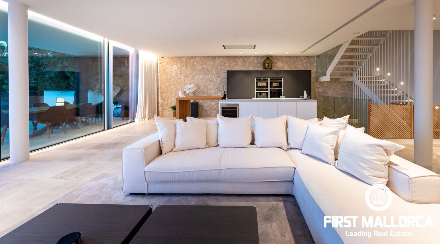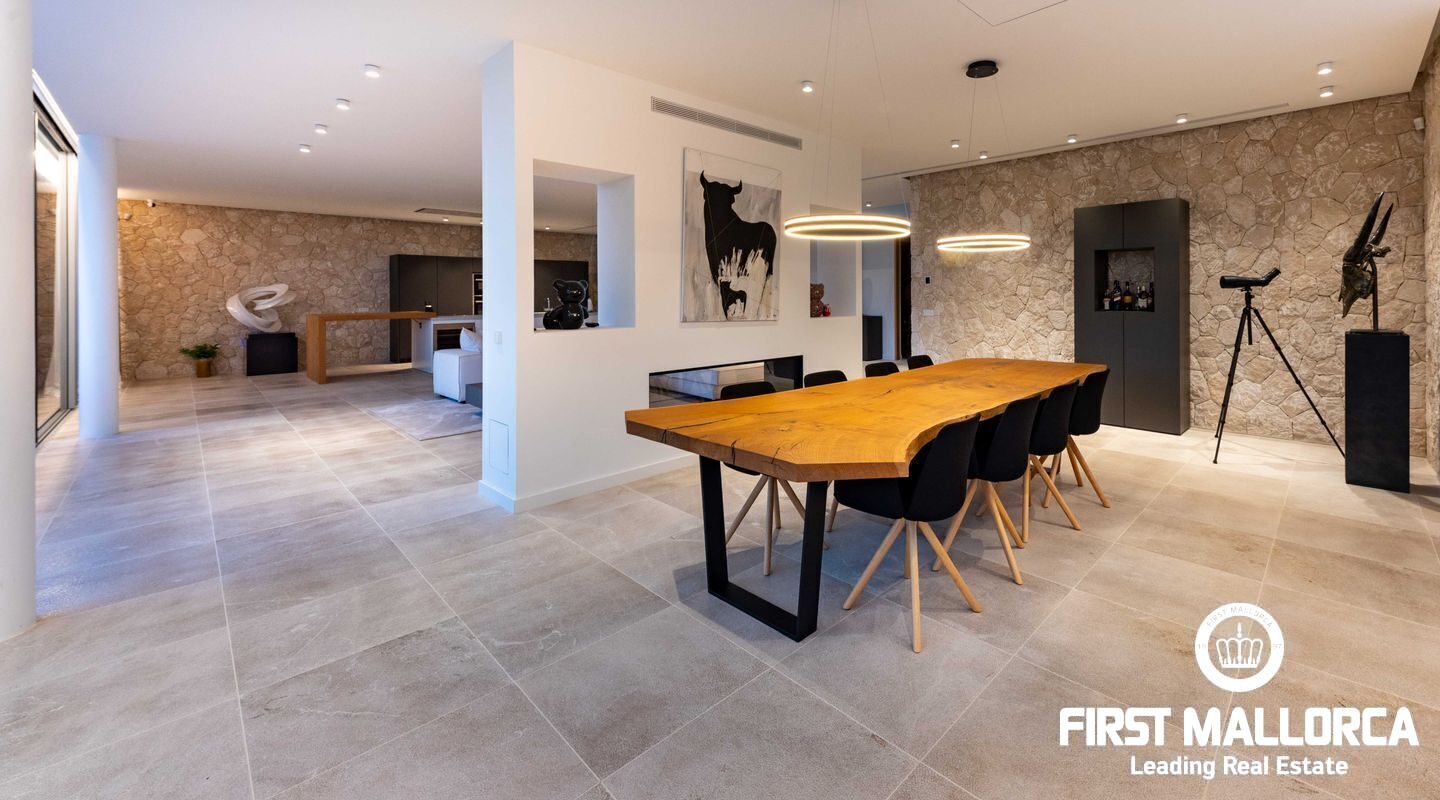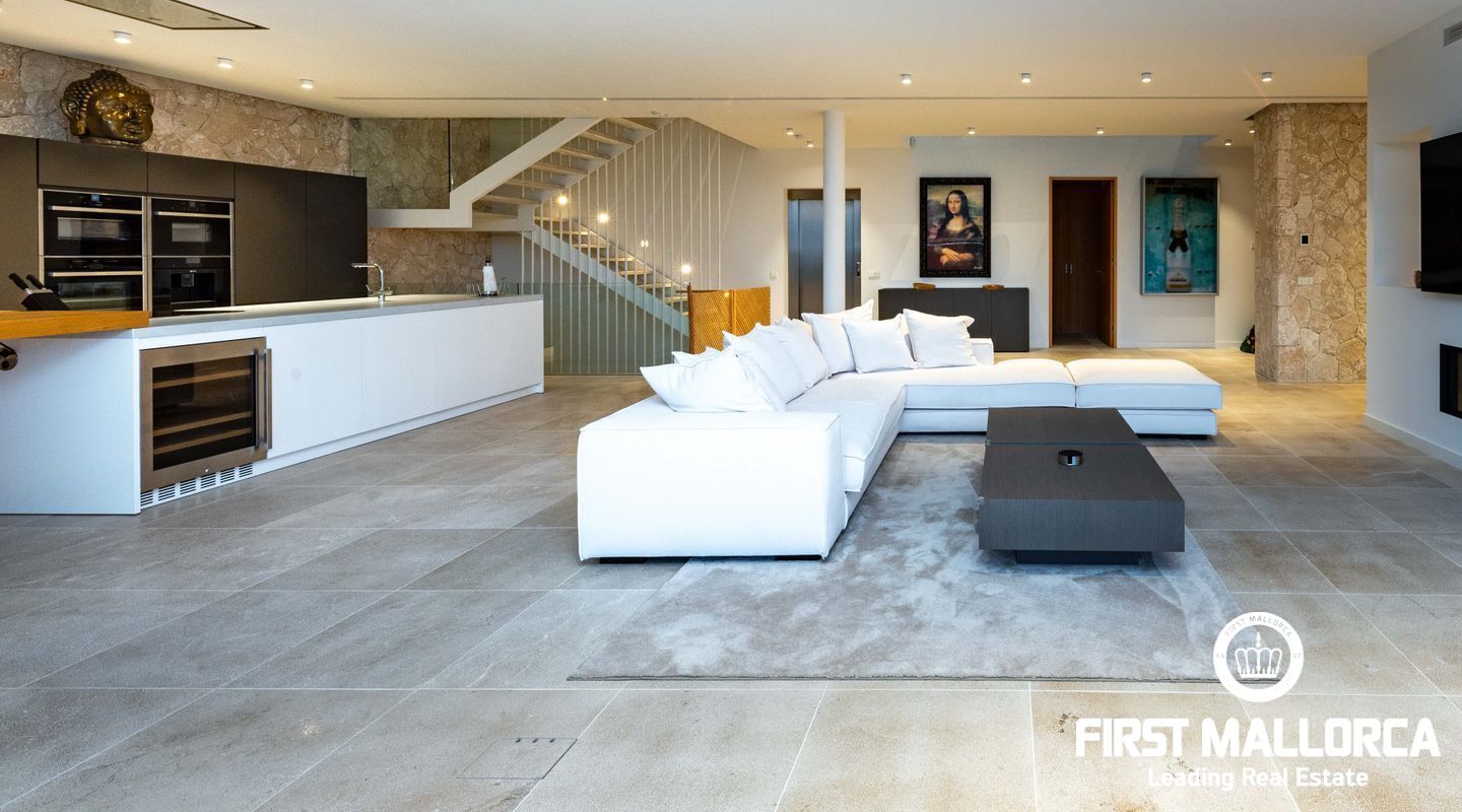Im Erdgeschoss befinden sich ein großzügiger Wohnbereich mit hohen Decken, eine offene Luxusküche und ein Essbereich, der durch eine stilvolle Kaminwand getrennt ist. Der Innenraum geht nahtlos in die Terrasse mit Infinity-Pool über, dessen Wasser scheinbar in das Blau des Mittelmeers übergeht.