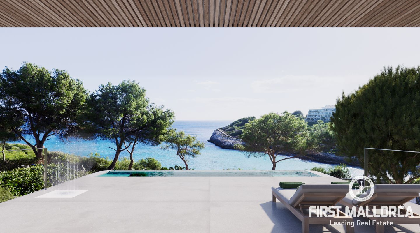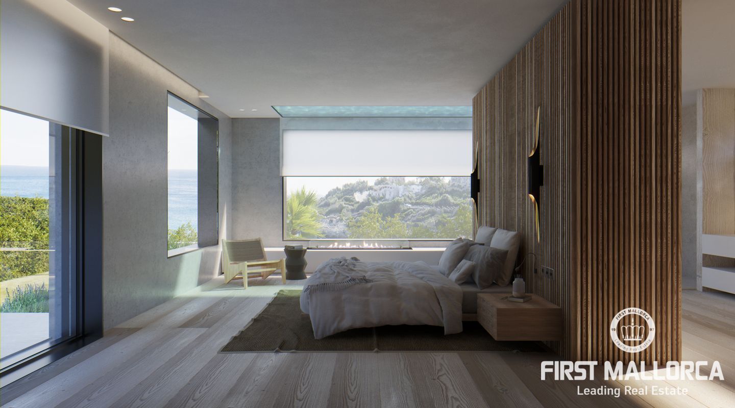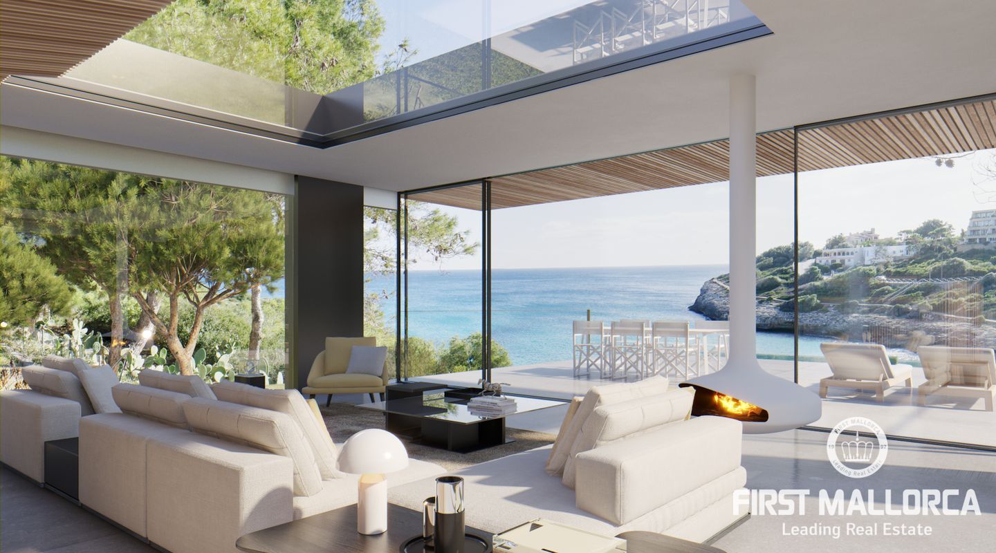 An der Vorderseite öffnet sich das Wohnzimmer mit dem Designer-Kamin mit einem traumhaften Blick auf das türkisblaue Wasser der Cala Mandia. Der Übergang ist sehr fließend und führt auf die 70 m2 große Terrasse und das Meer. Ein eleganter Wasserfall mit einem kleinen Infinity-Pool wurde in die Terrasse integriert. Durch die Fenster im Poolboden spiegelt sich das Wasser im Hauptschlafzimmer, von oben und durch den Überlauf des großen Fensters.
