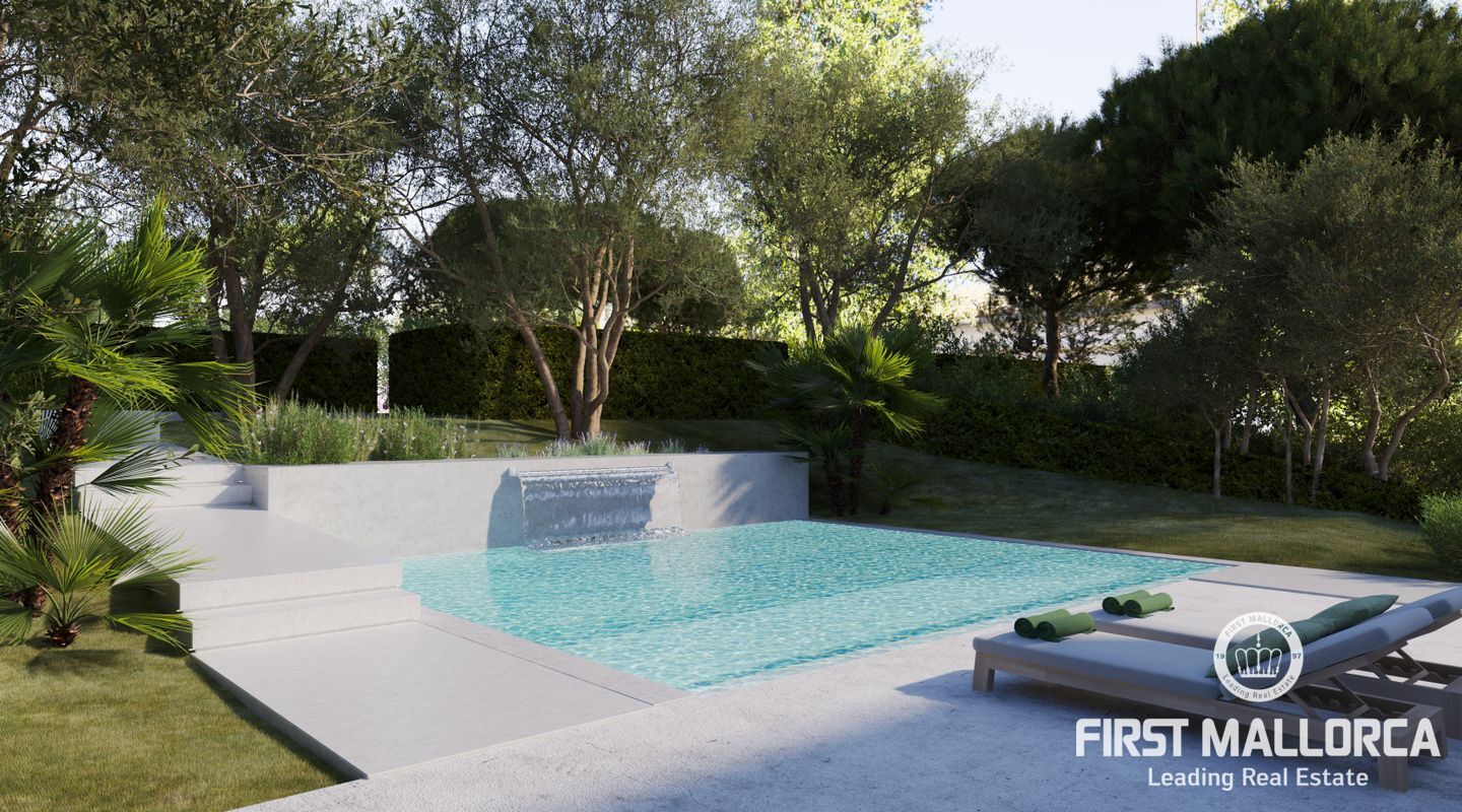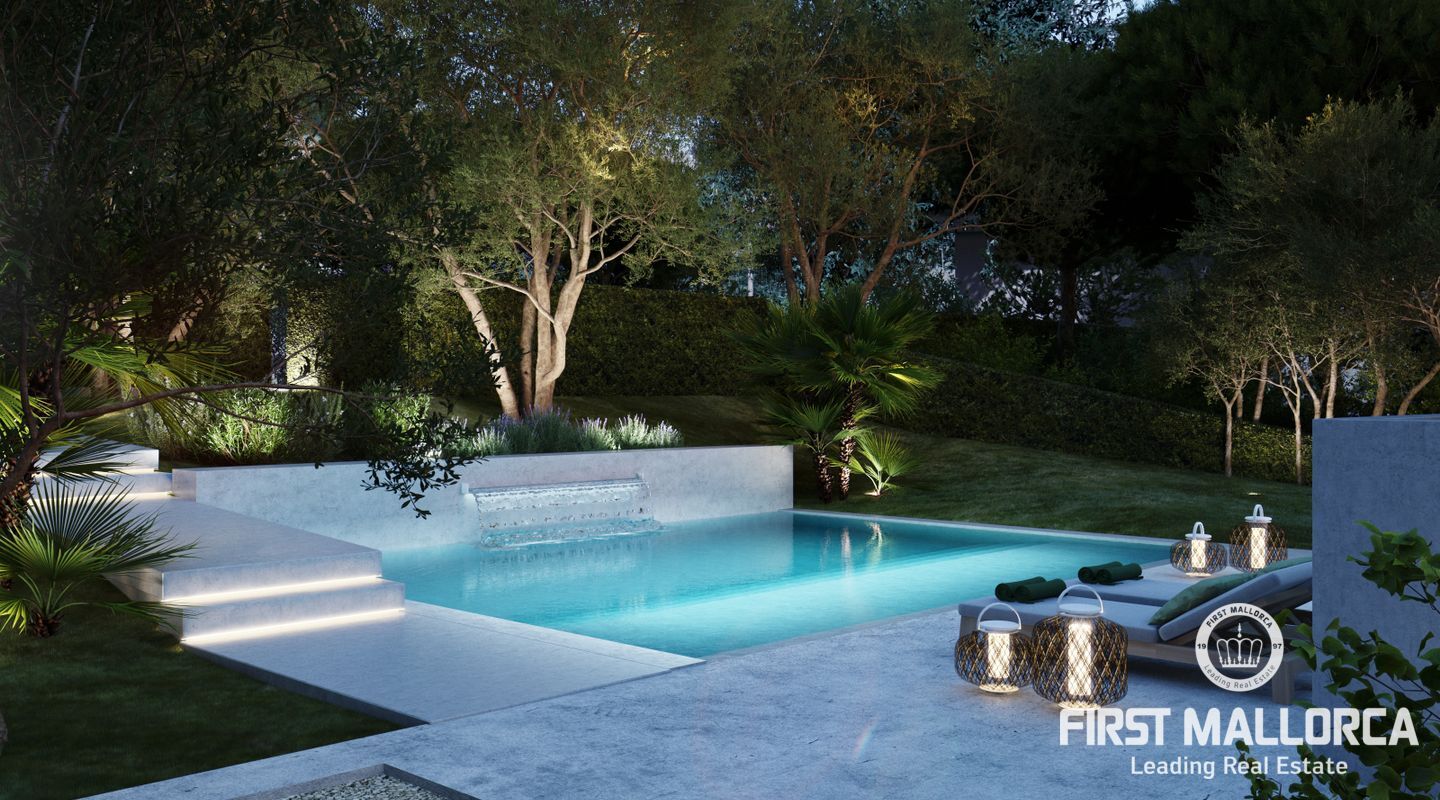 Im unteren Teil des Gartens, vor der Villa, wurde ein 45 m2 großer Swimmingpool mit einem Wasserfall angelegt. Es wurde nur die beste Technologie verwendet: domotische Steuerung der Fußbodenheizung mit Luft-/Wärmepumpe, iGlass, Klimaanlage, Beschattung der Terrassen... Es wurden auch Materialien aus der Welt der Schifffahrt verwendet, die besonders witterungsbeständig sind.