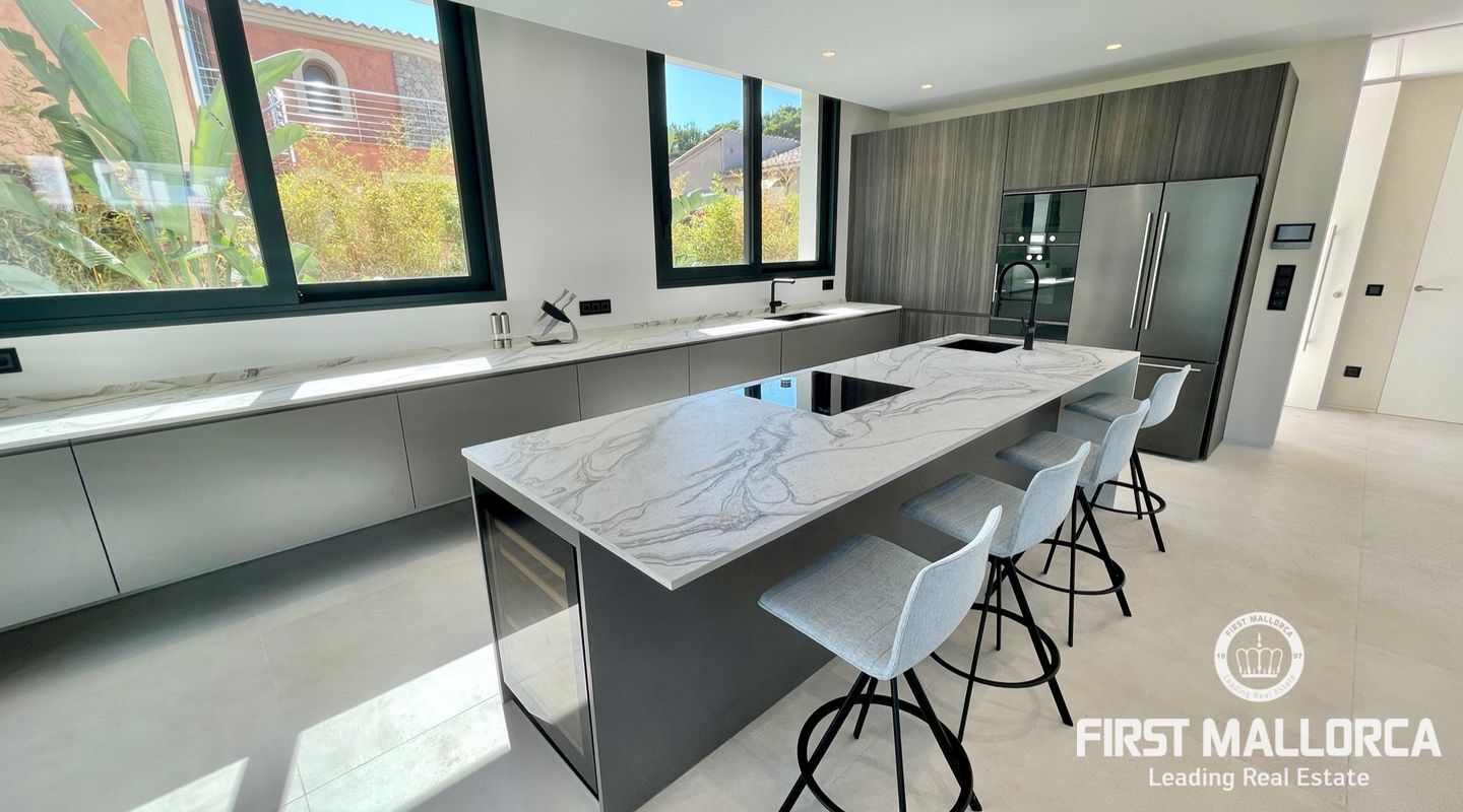 Diese helle Villa punktet nicht nur mit der Top-Lage, sondern bietet 338 qm bebaute Fläche, 3 Schlafzimmer jeweils mit Bad ensuite, sowie ein weiteres Gäste-WC. Sie verfügt über eine voll ausgestattete und hochwertige Küche, sowie einen offenen und hell gestalteten Wohn-Essbereich mit Zugang zum Außenbereich mit Sonnenterrasse und Pool.