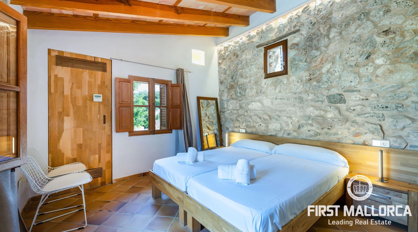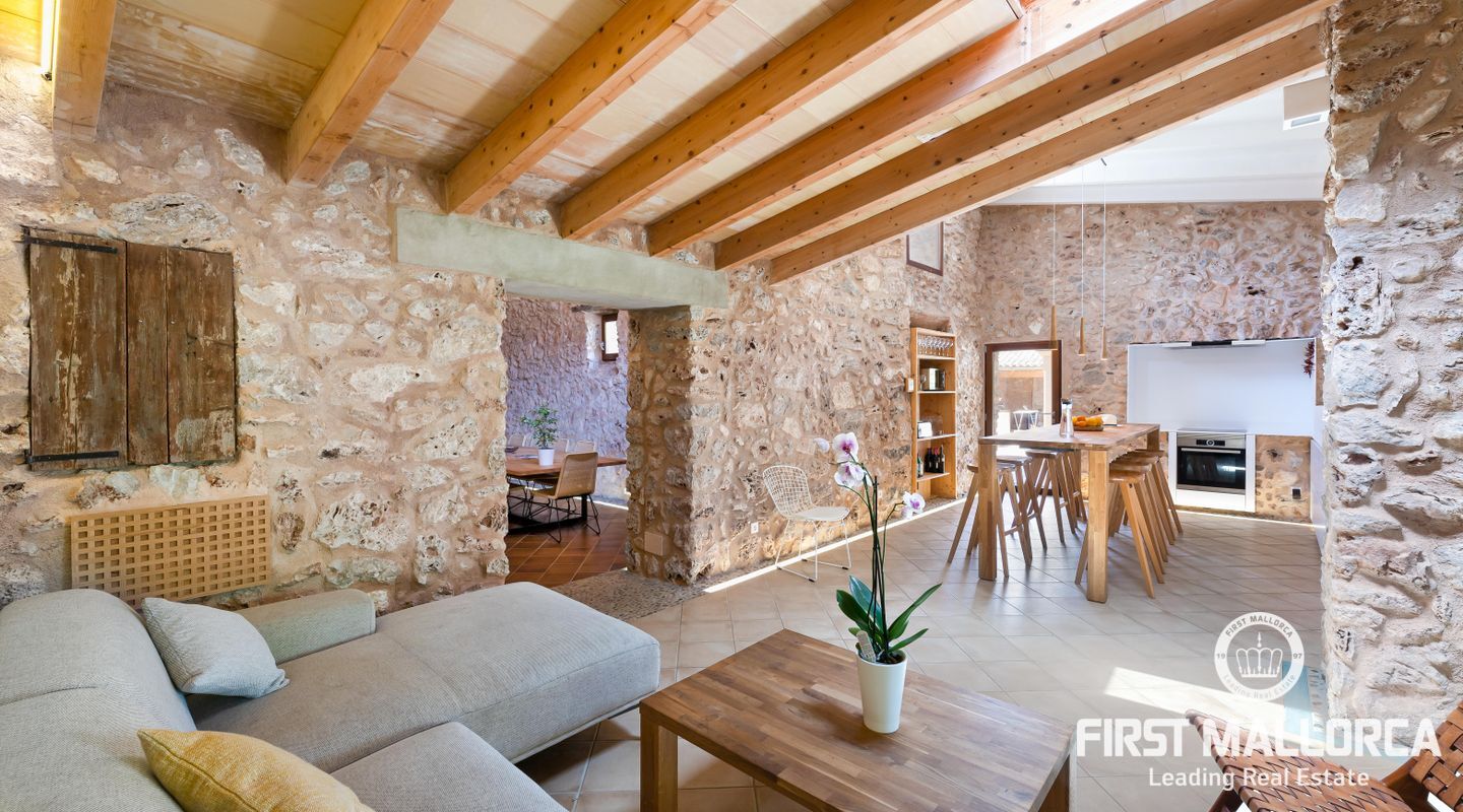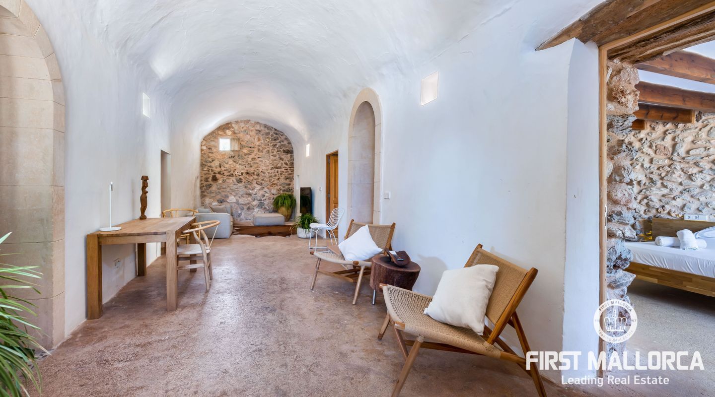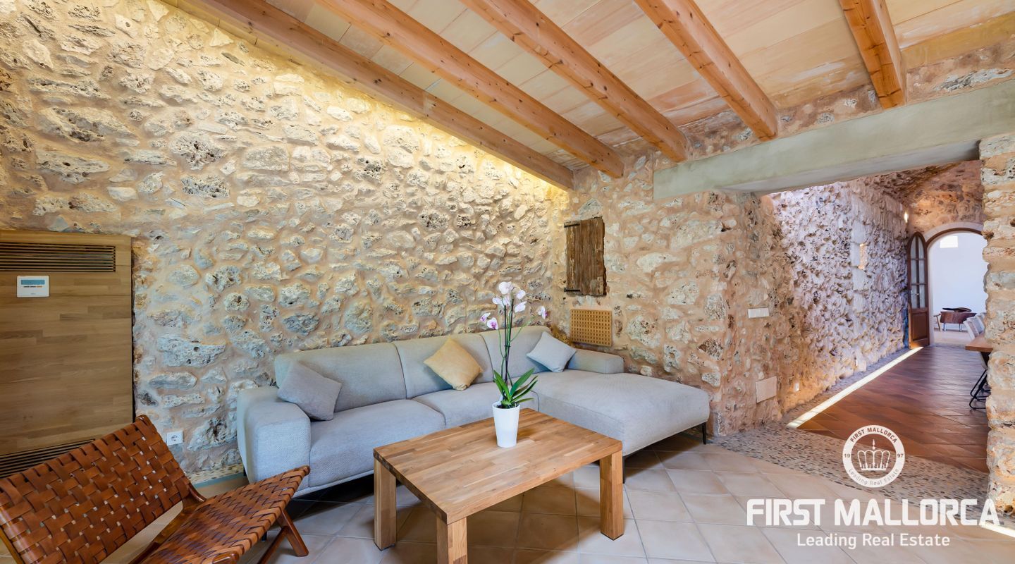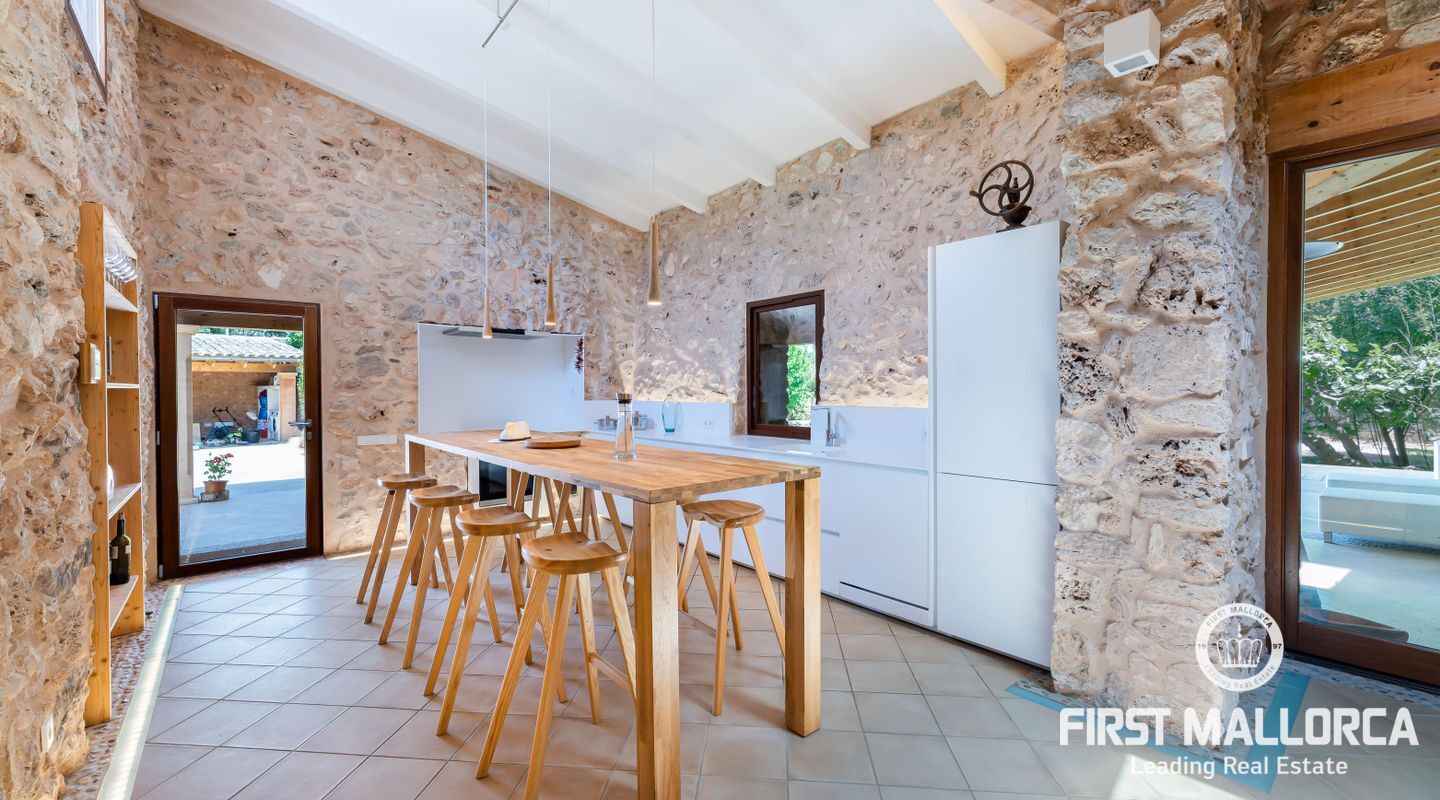 Beautiful villa only 300 m from the centre of Sencelles. The finca is situated in a natural and unique environment. In addition, it has the Majorcan character and a dreamlike style. Through the entrance area you enter the charming living room with natural stone walls and high ceilings. To the left is the spacious dining room with seating for about 12 guests and right next to it is the high quality fully fitted kitchen with cooking island and a chill-out area. From here there is access to the fantastic garden and the various terrace areas. On this floor there are two double bedrooms with bathrooms en suite. Two further double bedrooms, sharing a spacious bathroom, are located on the upper floor of the property.