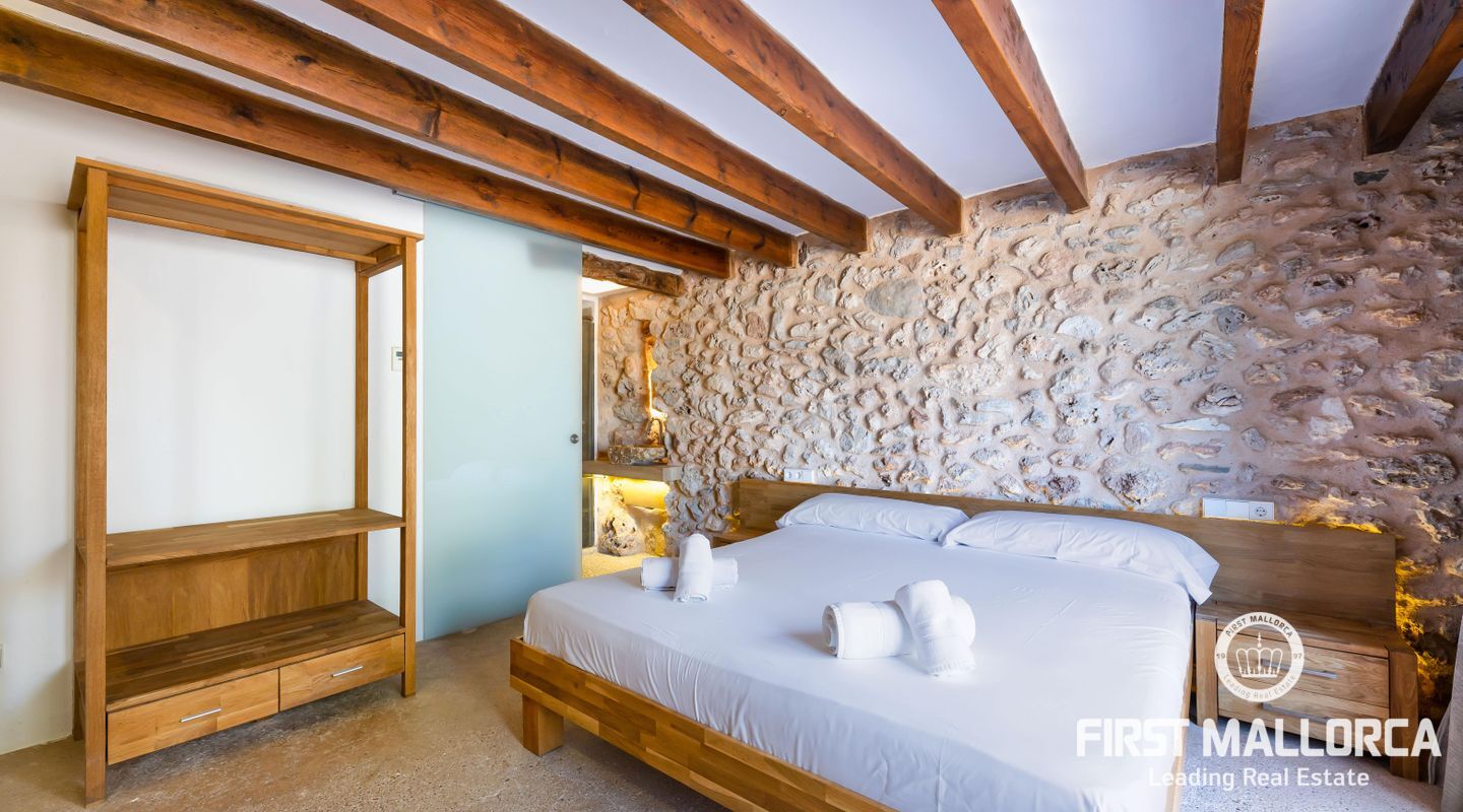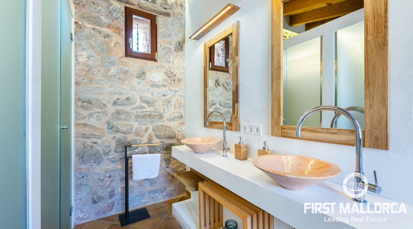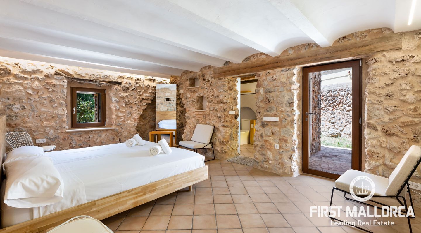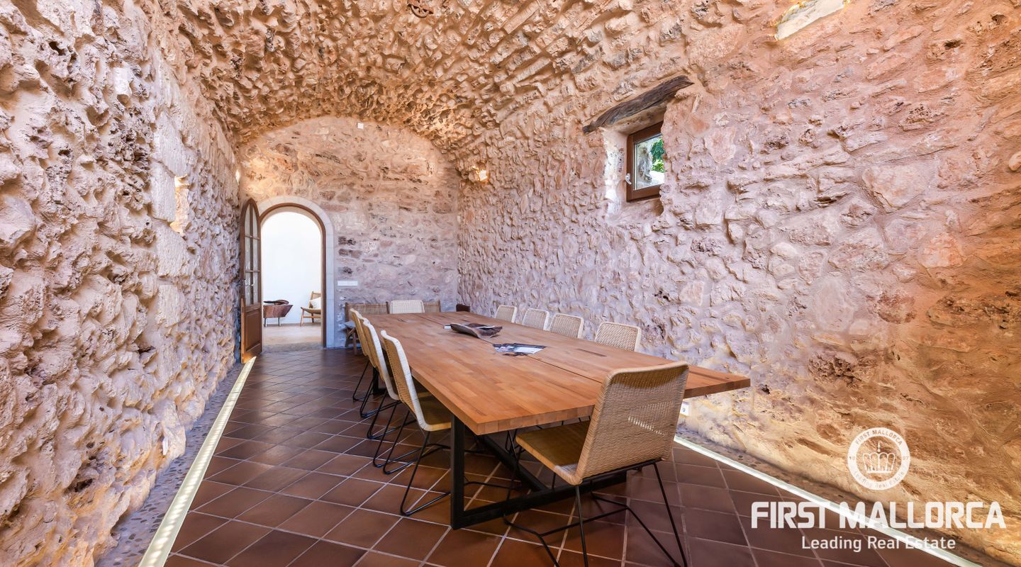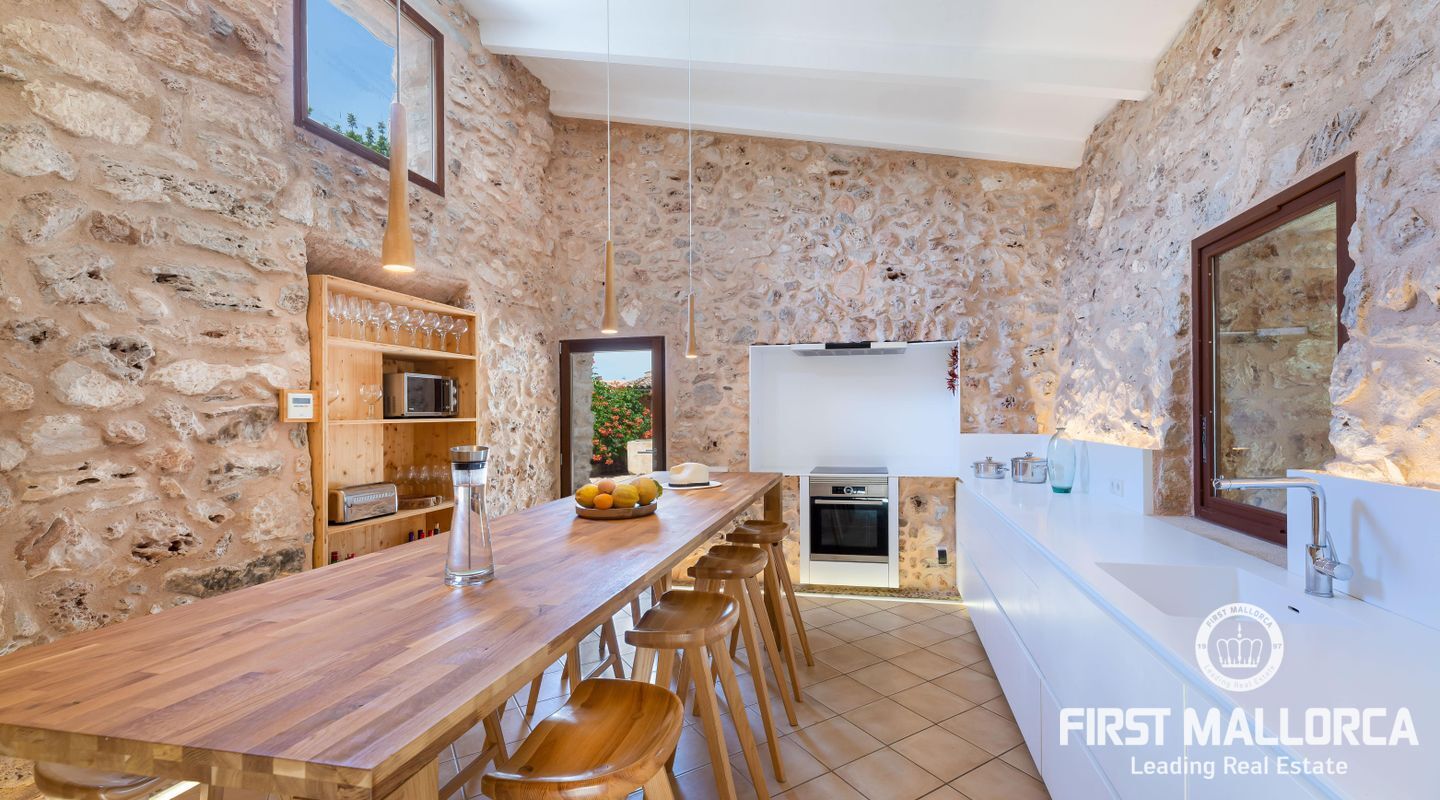Beautiful villa only 300 m from the centre of Sencelles. The finca is situated in a natural and unique environment. In addition, it has the Majorcan character and a dreamlike style. Through the entrance area you enter the charming living room with natural stone walls and high ceilings. To the left is the spacious dining room with seating for about 12 guests and right next to it is the high quality fully fitted kitchen with cooking island and a chill-out area. From here there is access to the fantastic garden and the various terrace areas. On this floor there are two double bedrooms with bathrooms en suite. Two further double bedrooms, sharing a spacious bathroom, are located on the upper floor of the property.