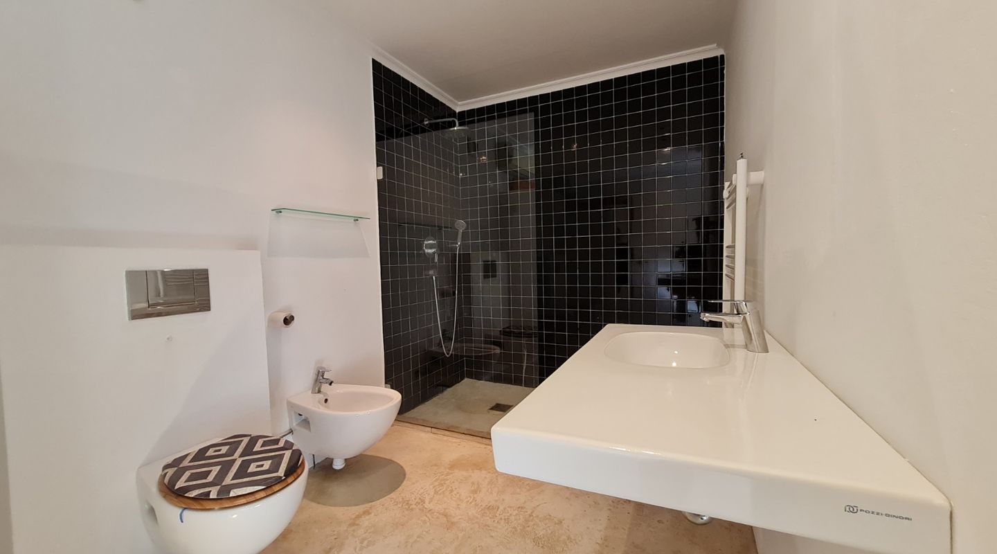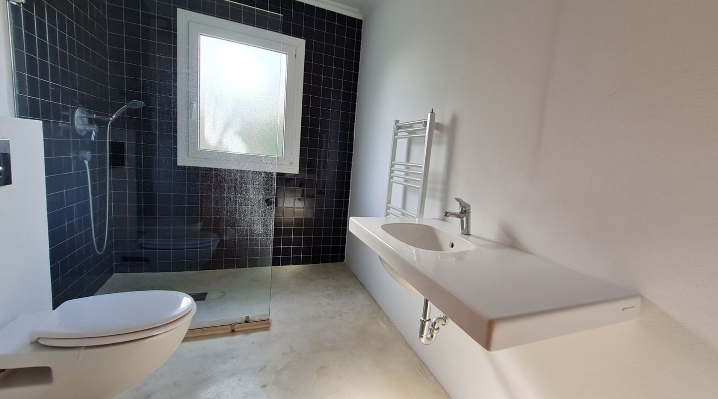 The house also includes a carport for one vehicle and additional space to park two more cars. It is equipped with air conditioning, oil-fired central heating, and microcement floors throughout.