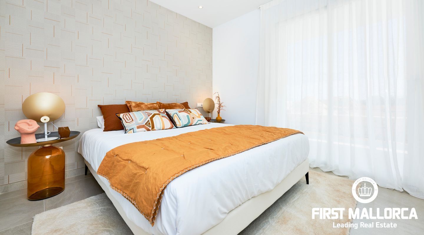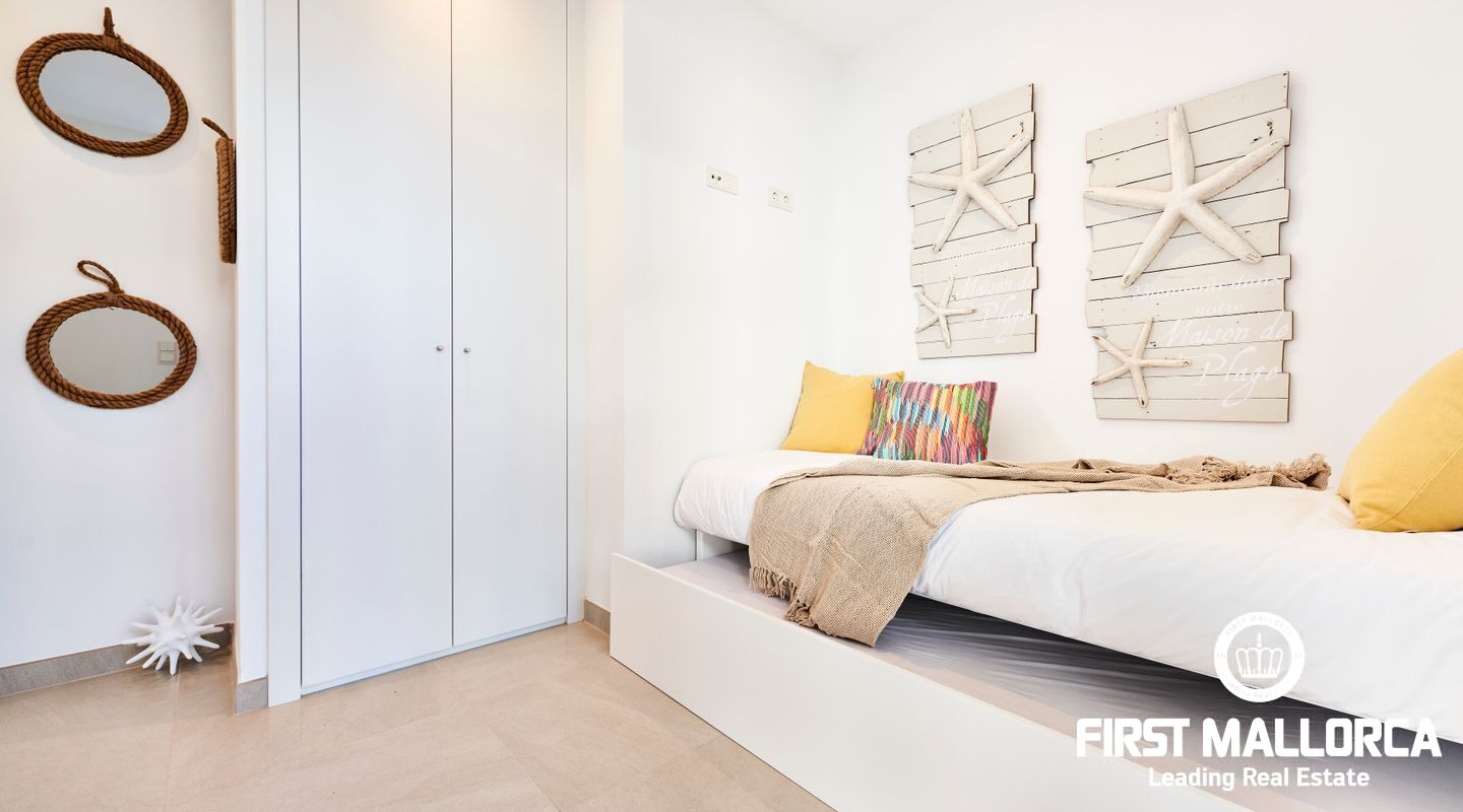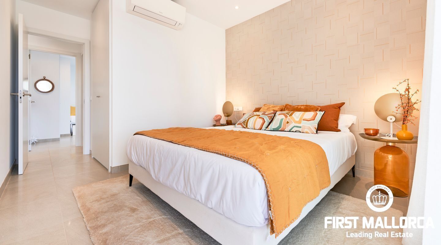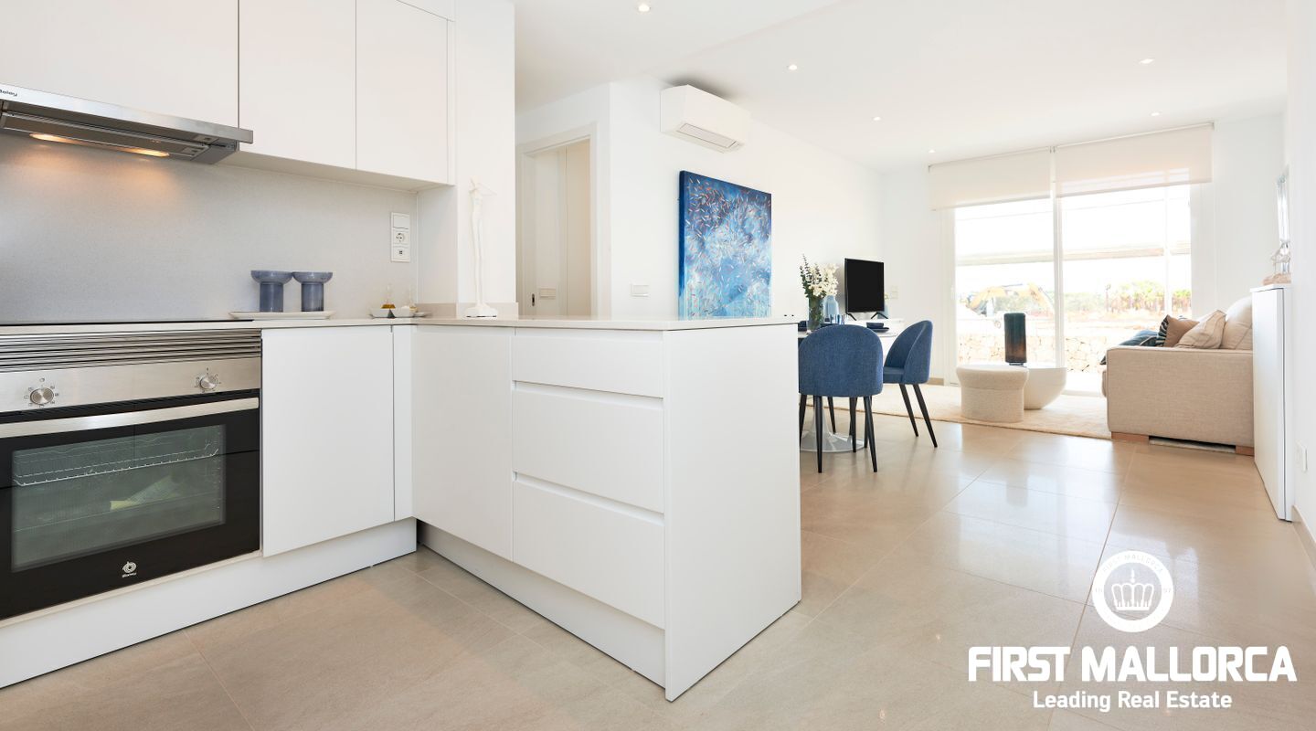 These modern Ibizan white apartments have very high quality furnishings. The distribution in the apartments inspire with plenty of space in 2 bedrooms with bathrooms, living room and large terraces or, on the ground floor apartments, verandas with own garden area. Spacious gardens surround the area and 2 large community pools invite you to enjoy Mediterranean life. A parking space also belongs to each apartment.