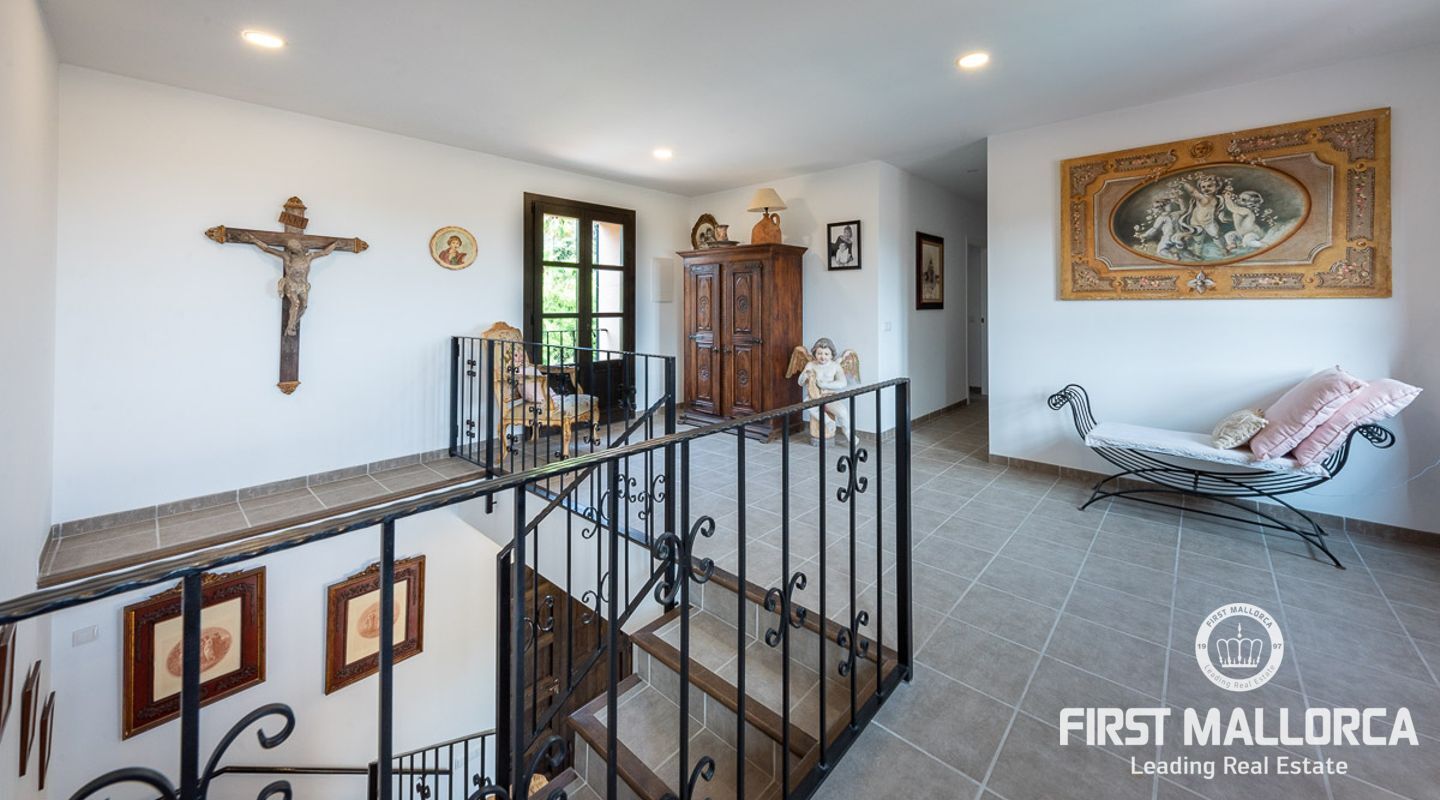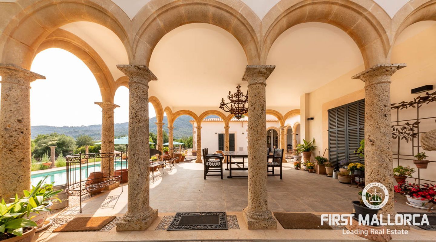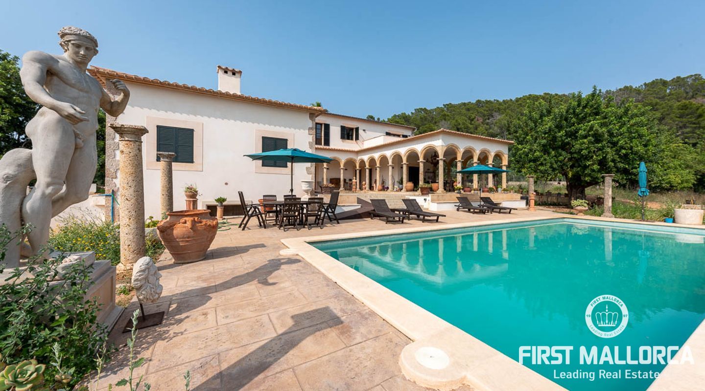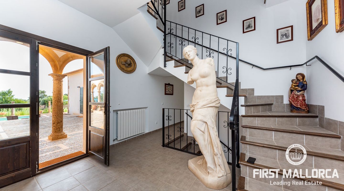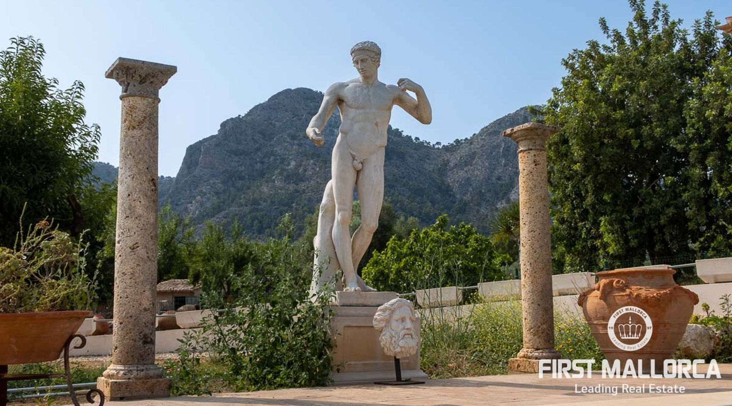 This beautiful villa near Bunyola is located at the beginning of the Serra de Tramuntana, surrounded by the tranquility of the countryside and the mountains. It was built by the current owners in 2017, on a plot of approximately 22,000m2 on which there was only a small construction, used as a warehouse. The elegant style of the owners has made it possible to create a house that almost transports us to a museum, among columns, capitels, reproductions of famous ancient statues and frescoes.