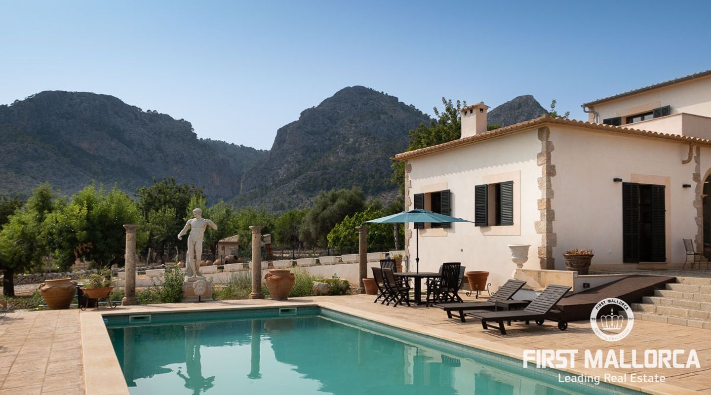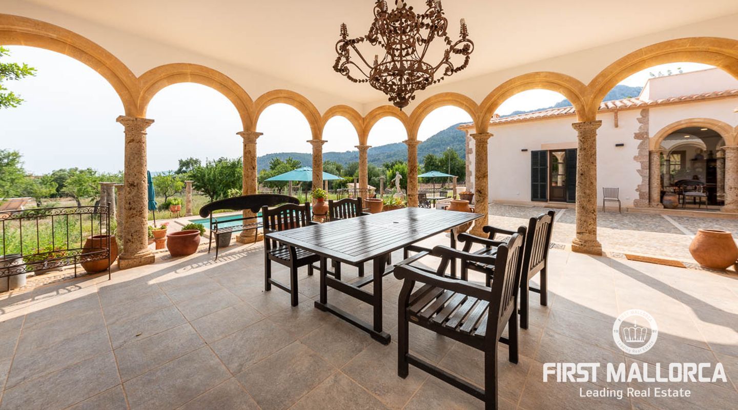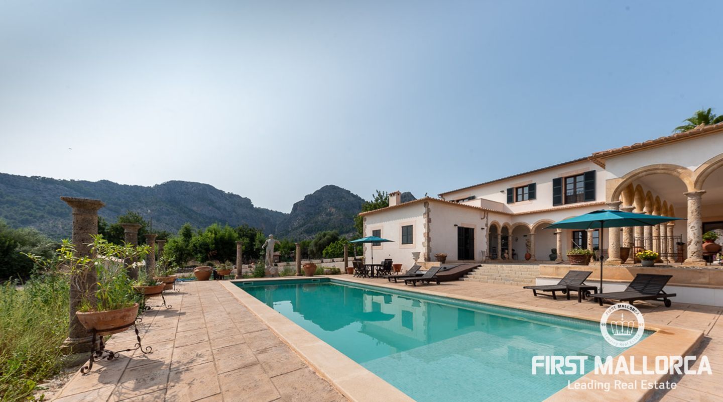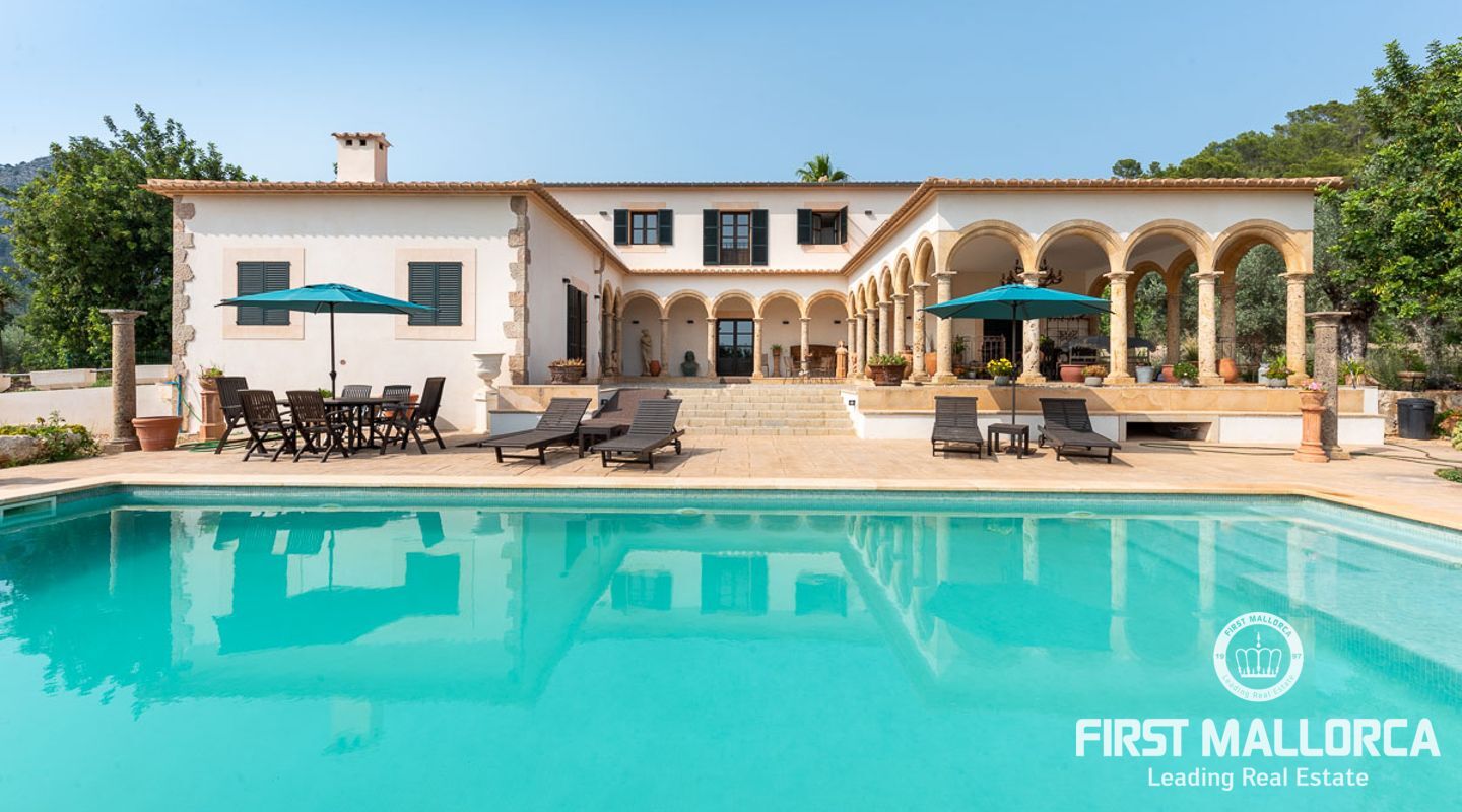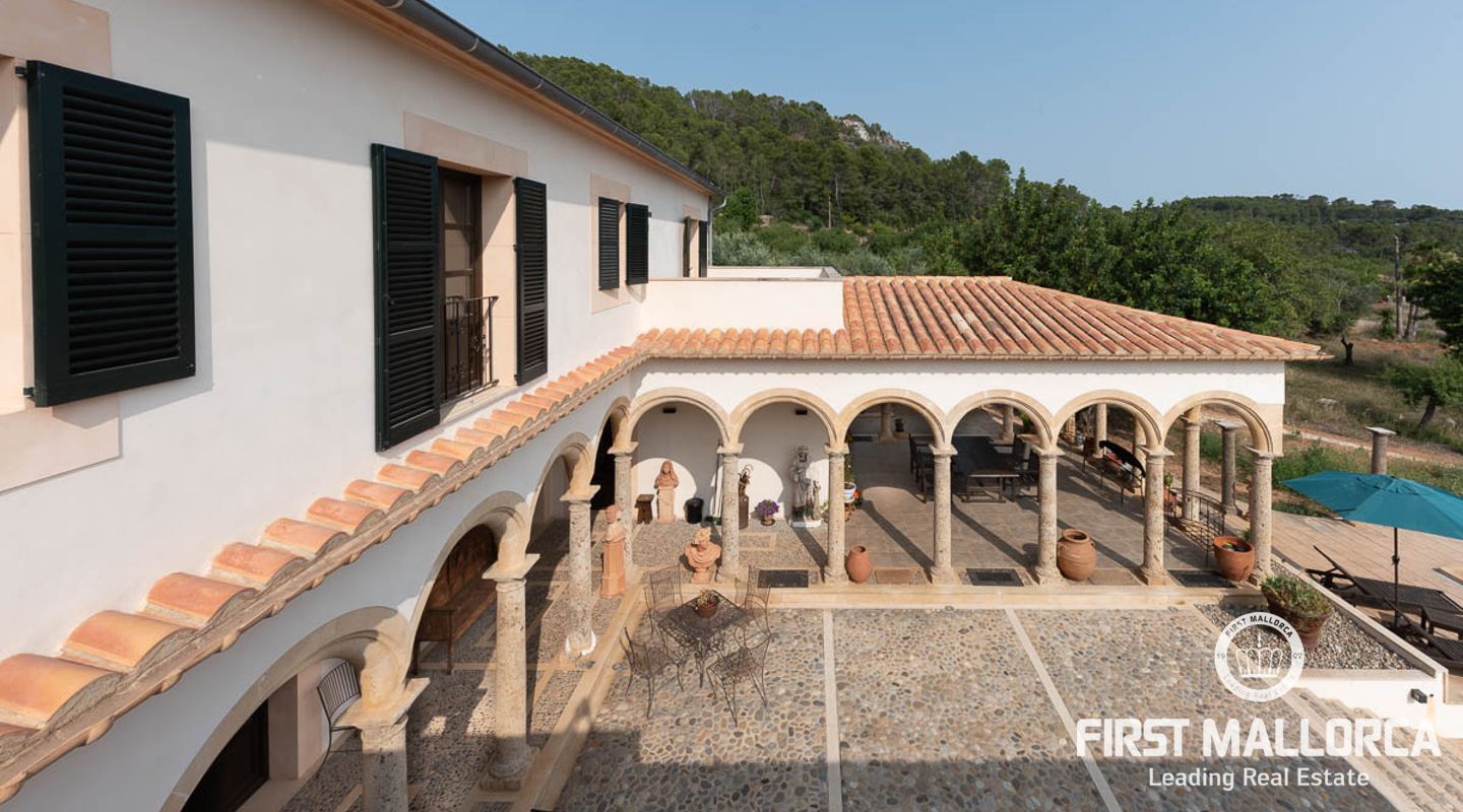 This beautiful villa near Bunyola is located at the beginning of the Serra de Tramuntana, surrounded by the tranquility of the countryside and the mountains. It was built by the current owners in 2017, on a plot of approximately 22,000m2 on which there was only a small construction, used as a warehouse. The elegant style of the owners has made it possible to create a house that almost transports us to a museum, among columns, capitels, reproductions of famous ancient statues and frescoes.