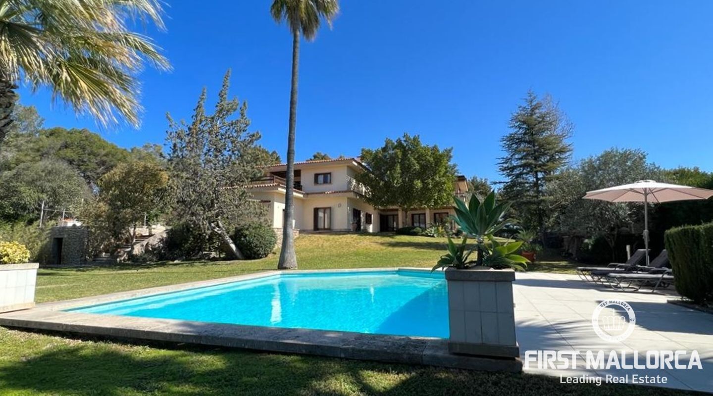 This rustic Finca in the heart of the island is located on a plot of 9,400 m2 with 6,500 m2 of buildings. This impressive complex consists of three buildings. The main residence has a spacious entrance hall, a guest toilet, four bedrooms (one of them with dressing room), five bathrooms (two of them en suite), a large living-dining room with a beautiful marble fireplace, kitchen, laundry room, garage with multiple parking spaces and a wine cellar. Several terraces offer panoramic and unobstructed views, complemented by various porches. An extensive garden with lawns, flowers and a variety of magnificent trees surrounds all the buildings, with two of them overlooking the swimming pool.