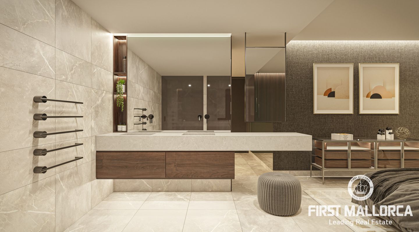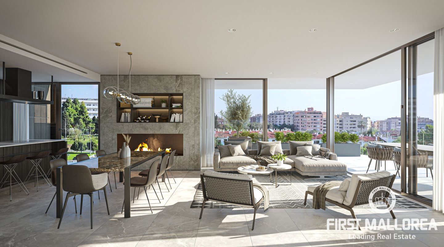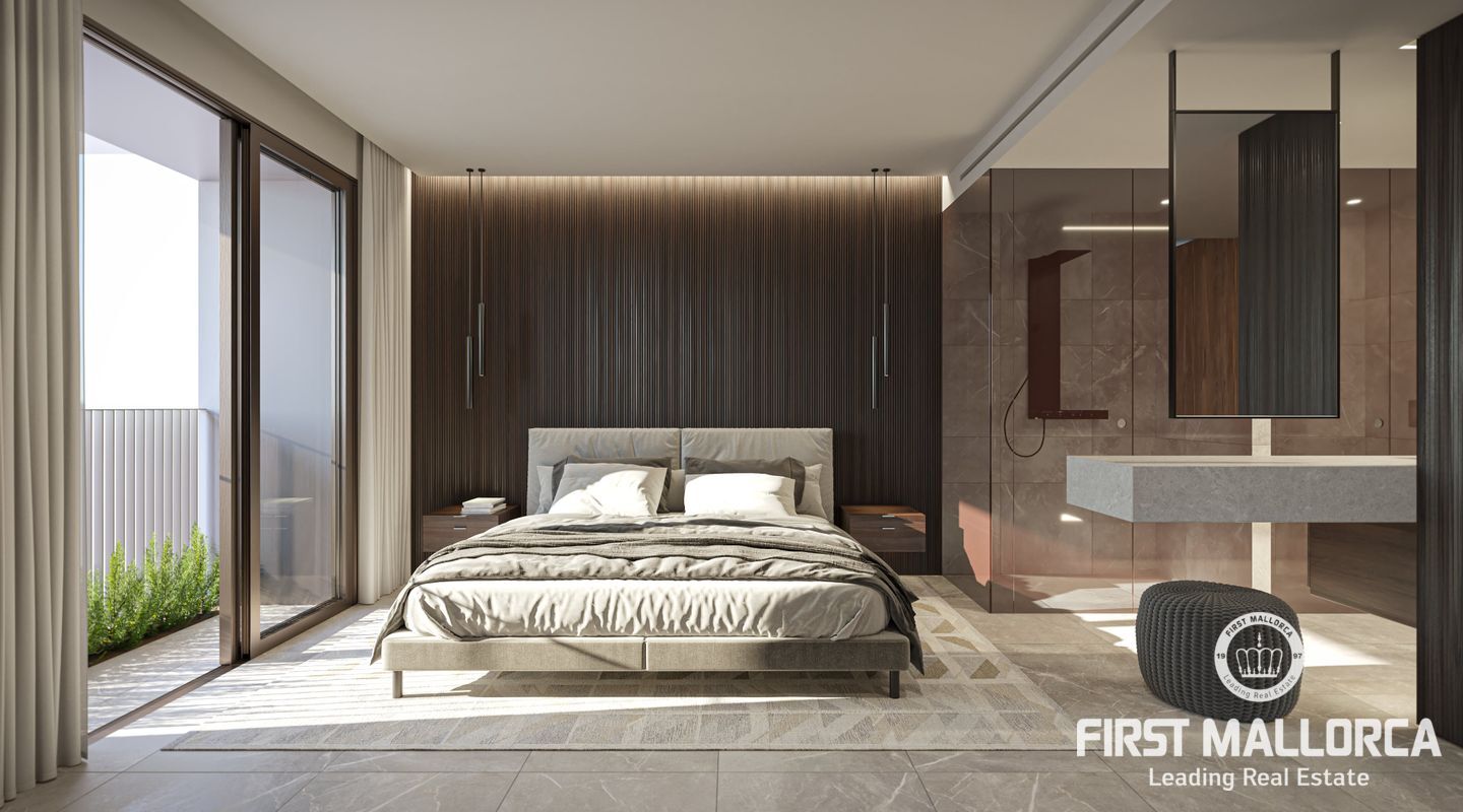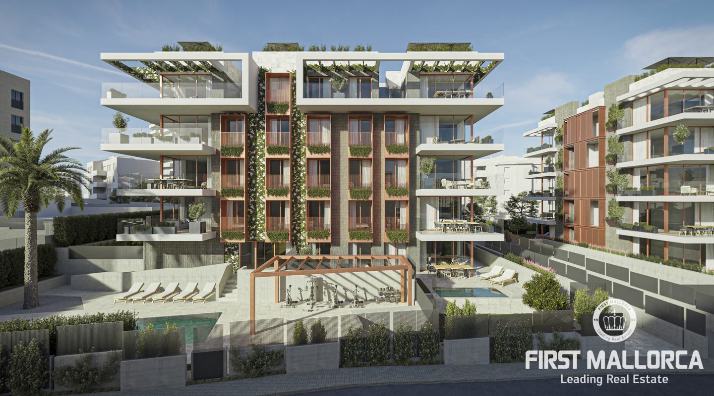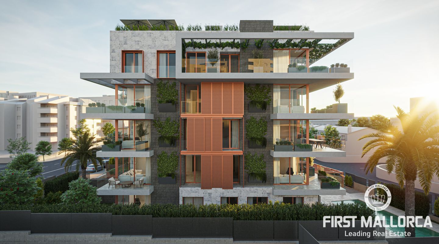 This new residential development is being built in the neighbourhood of Son Dameto. Within walking distance to the city centre and very well connected. The surrounding area is equipped with all services as well as a proximity to schools. The project has been designed with avant-garde architecture, as is part of its partially green façade. There is a communal swimming pool, solarium and outdoor gym perfect for enjoying the complex. For the design of the flats a successful combination of various high quality natural materials has been chosen: Stone and concrete give the interiors a noble character, while glass gives them a modern feel. Large floor-to-ceiling windows guarantee plenty of natural light in the open-plan living and dining area, creating a smooth transition between the large terraces and the spacious living areas with integrated kitchens (equipped with Bosch or similar appliances; penthouses Miele or similar). Air conditioning and underfloor heating (heat pump) guarantee a pleasant climate all year round. Furthermore, a parking space and a storage room in the underground garage are included in the price (penthouses and ground floor apartments 2 parking spaces). This is one of the few existing opportunities to acquire a quality property in the city of Palma de Mallorca. Do not hesitate to contact the First Mallorca team to arrange a viewing!
