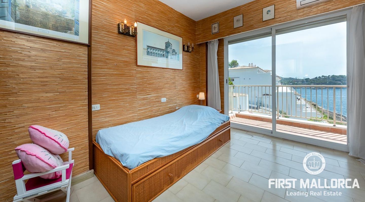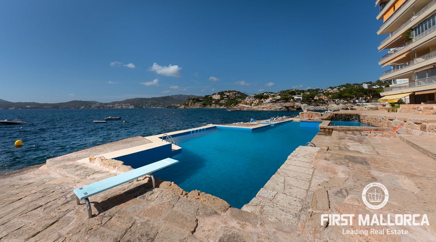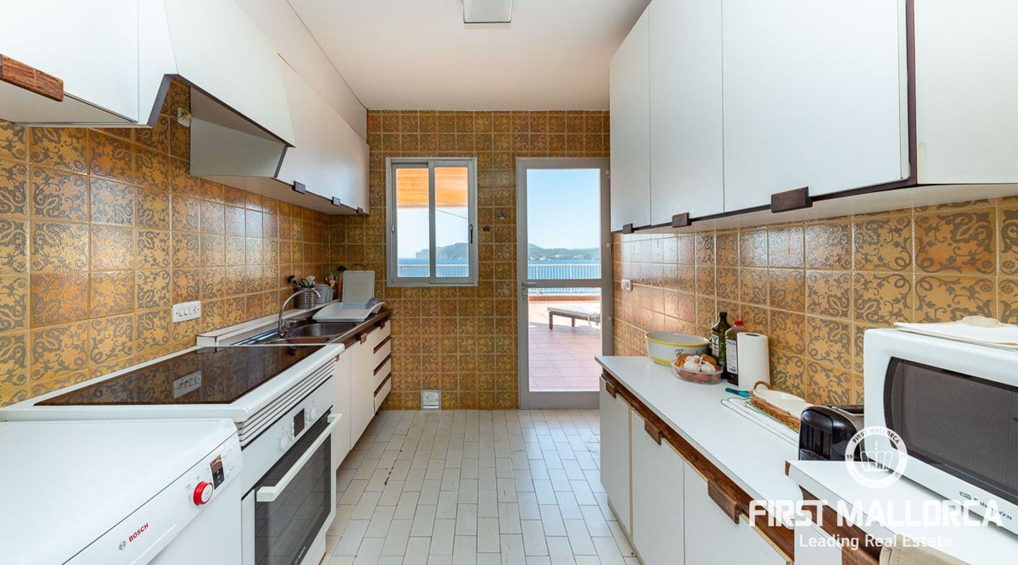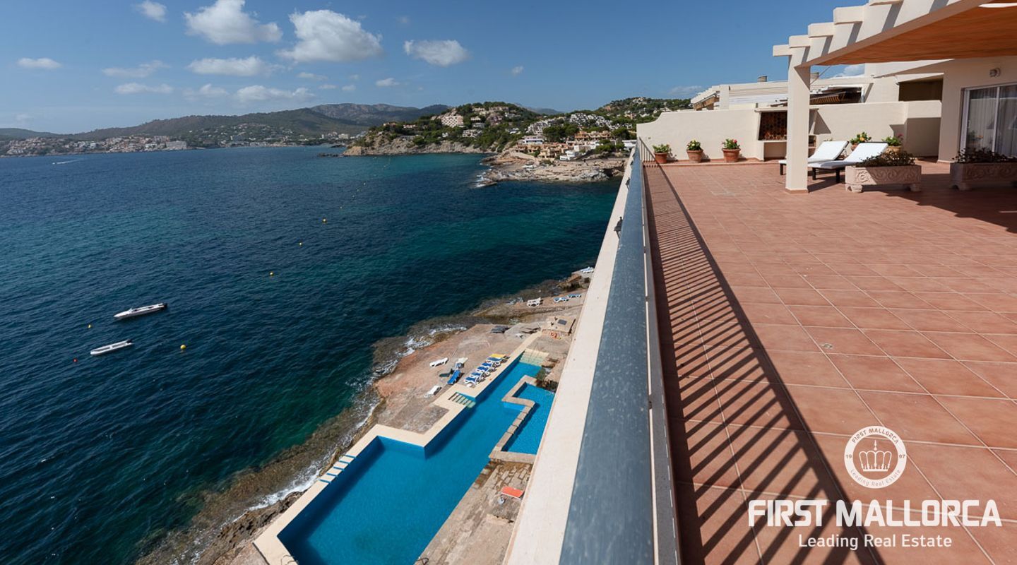 Stunning first line penthouse with endless sea views in a quiet area of Santa Ponsa near Costa de la Calma with private access to the sea and a natural dug out pool. The main entrance leads you to a large entrance hall with a beautiful handmade metal door, natural wood and reading area where there are two bedrooms at the back of the apartment sharing a bathroom. There is a guest toilet past the hallway, an enclosed kitchen still in the style of the 70's and the main living room which has a beautiful fireplace as well as the master suite on the other side, all sharing the stunning sea views.