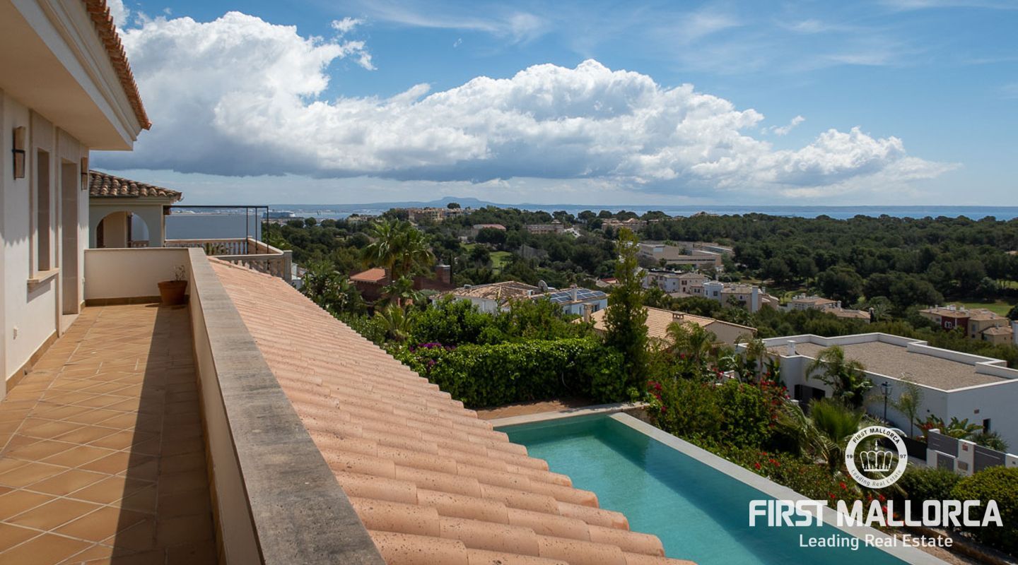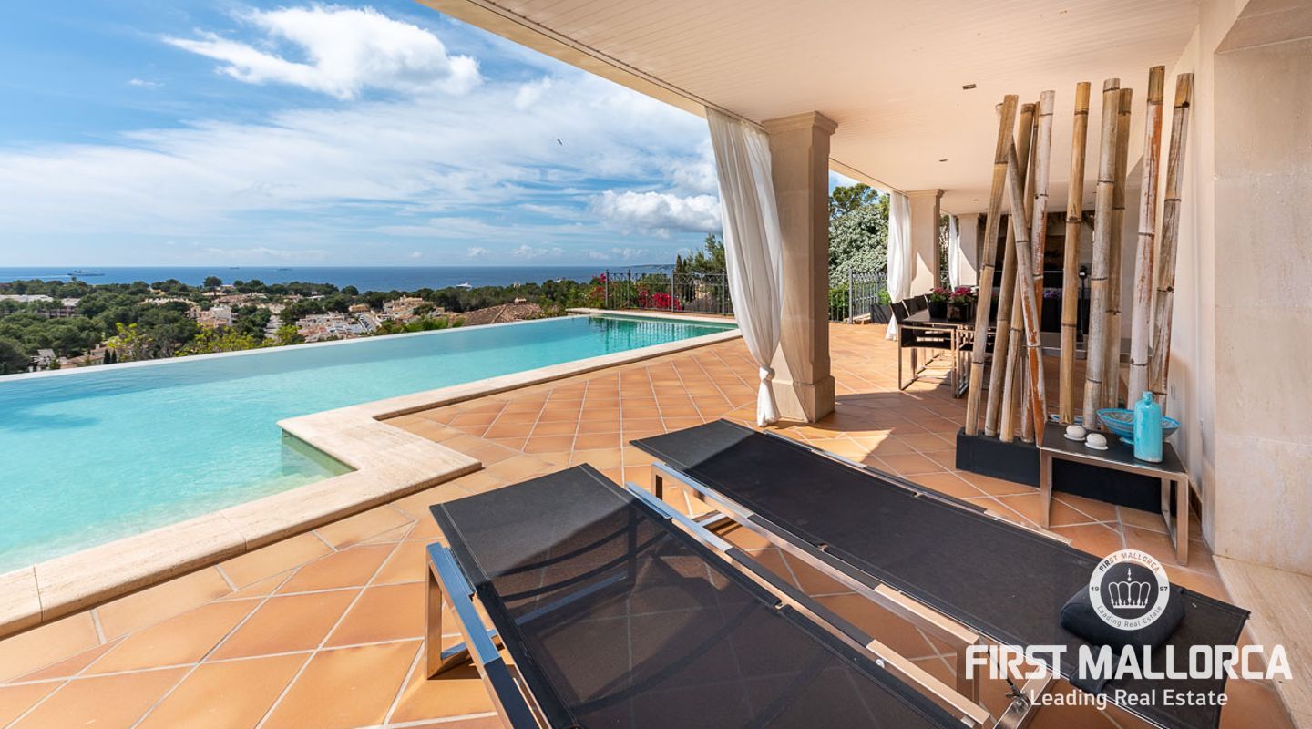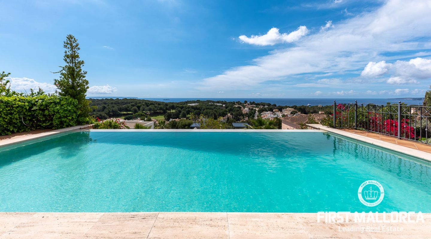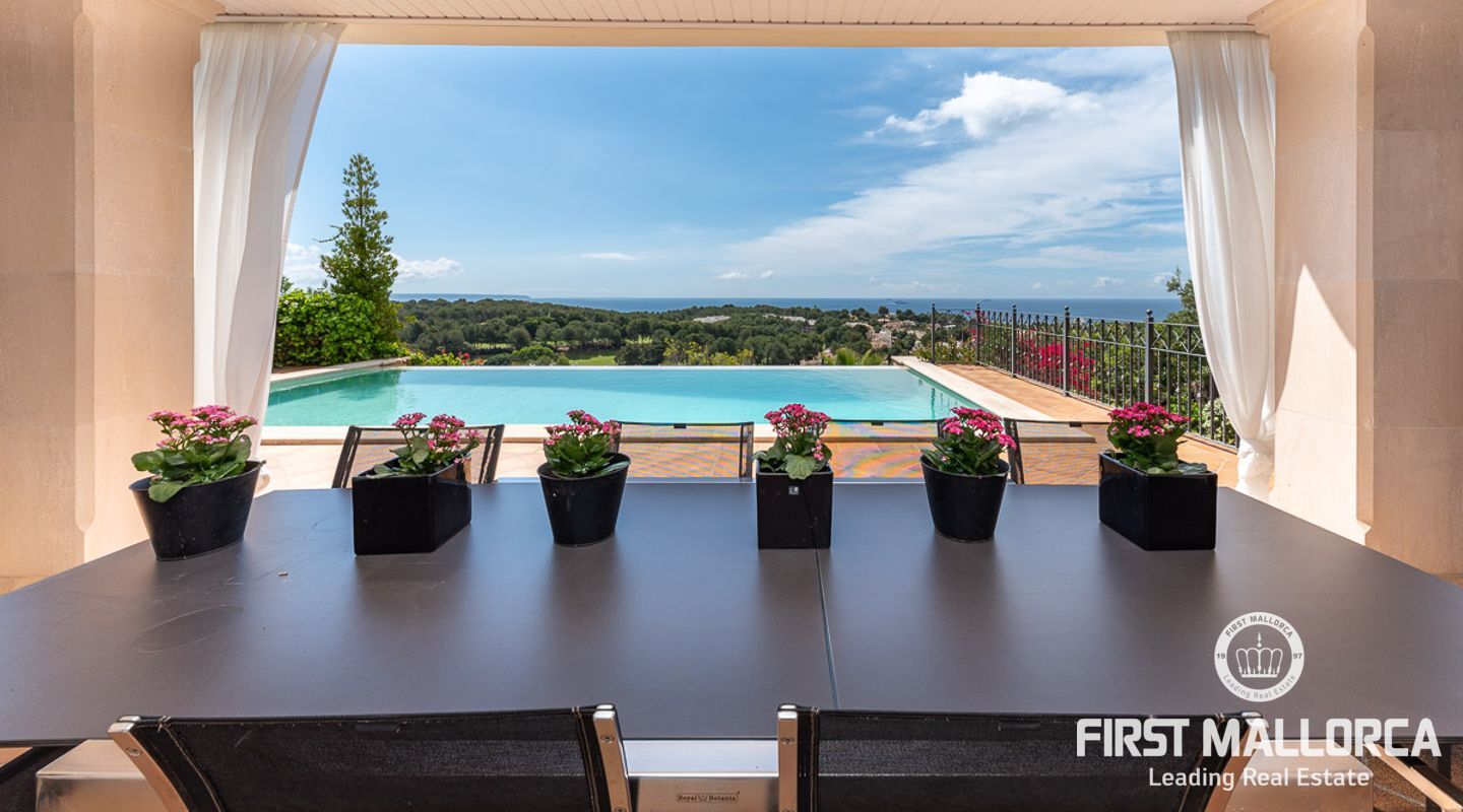 We are proud to present this sophisticated villa offering panoramic sea and golf views from its elevated position in the upmarket residential area of Anchorage Hill. It is easy to feel at home here immediately thanks to its spacious and bright interior which is totally connected to the generous covered and open terraces, allowing one to enjoy to the fullest the essence of Mediterranean living. Great care has been taken to create a comfortable and practical but yet very elegant family home which is also prepared for entertaining with family and friends at its highest level. Unqiue features of this fine piece of Mallorca real estate include: hot & cold AC, marble flooring, lift, barbecue, extensive storage and private garaging for 4 vehicles. The extensive sea views and enjoyed from all rooms and bedrooms as well as from the stunning pool area. Anchorage Hill in Bendinat is one of the island's absolut top residential areas, allowing easy access to virtually everything - the elegent Marina of Puerto Portals, the Royal Bendinat Golf Course, the extraordinary beaches of the southwest coast and still only 10 minutes into the city centre of Palma de Mallorca.