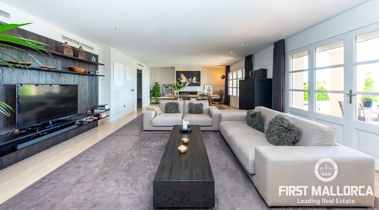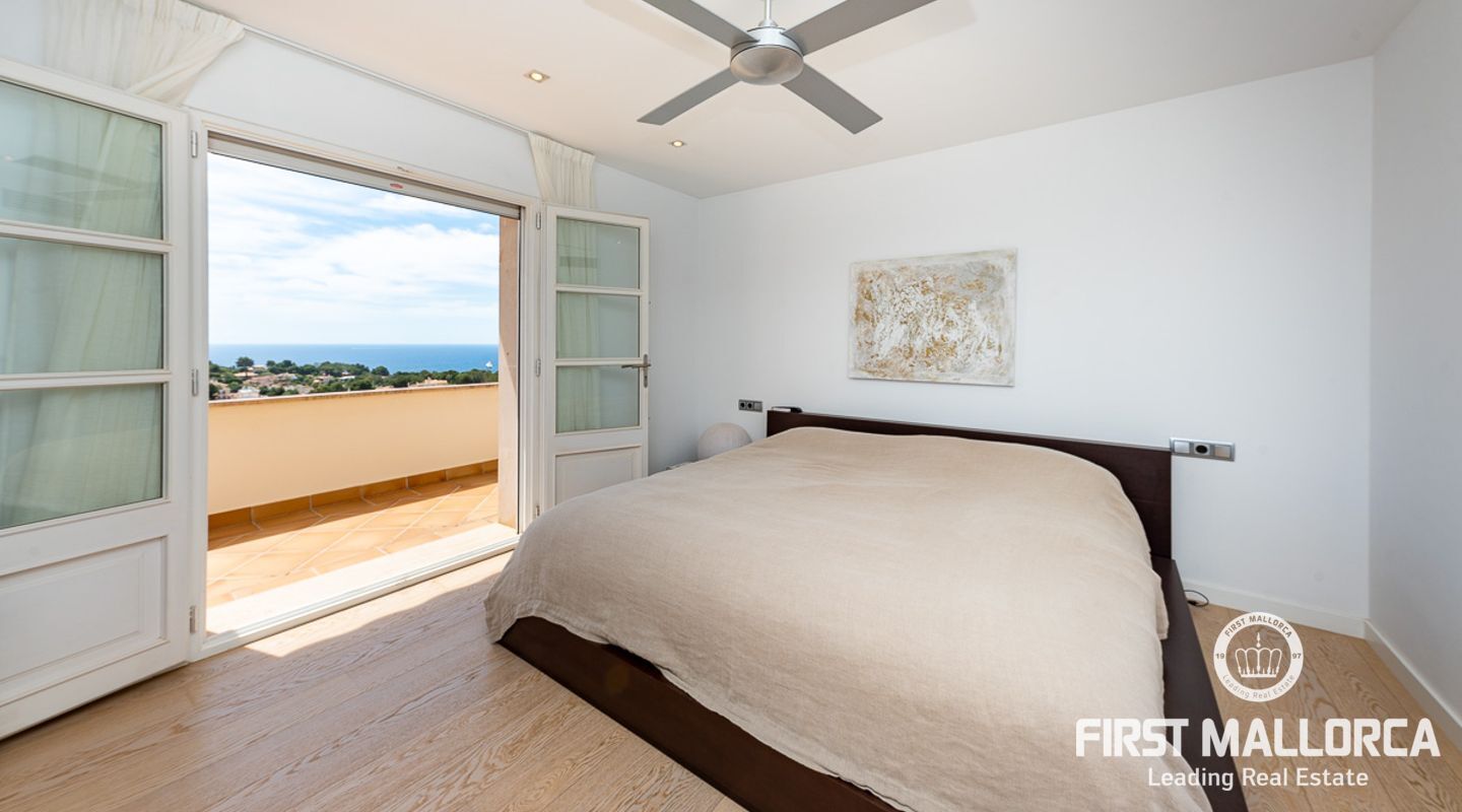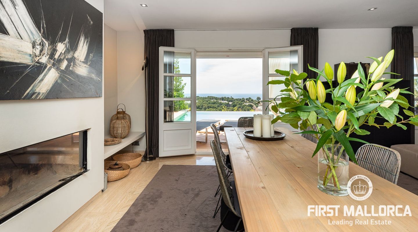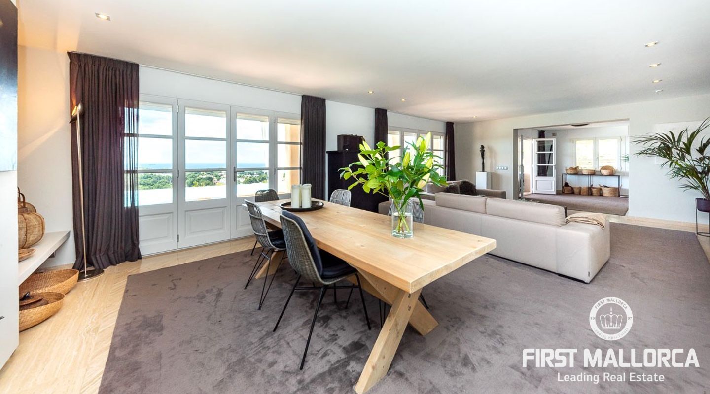 We are proud to present this sophisticated villa offering panoramic sea and golf views from its elevated position in the upmarket residential area of Anchorage Hill. It is easy to feel at home here immediately thanks to its spacious and bright interior which is totally connected to the generous covered and open terraces, allowing one to enjoy to the fullest the essence of Mediterranean living. Great care has been taken to create a comfortable and practical but yet very elegant family home which is also prepared for entertaining with family and friends at its highest level. Unqiue features of this fine piece of Mallorca real estate include: hot & cold AC, marble flooring, lift, barbecue, extensive storage and private garaging for 4 vehicles. The extensive sea views and enjoyed from all rooms and bedrooms as well as from the stunning pool area. Anchorage Hill in Bendinat is one of the island's absolut top residential areas, allowing easy access to virtually everything - the elegent Marina of Puerto Portals, the Royal Bendinat Golf Course, the extraordinary beaches of the southwest coast and still only 10 minutes into the city centre of Palma de Mallorca.
