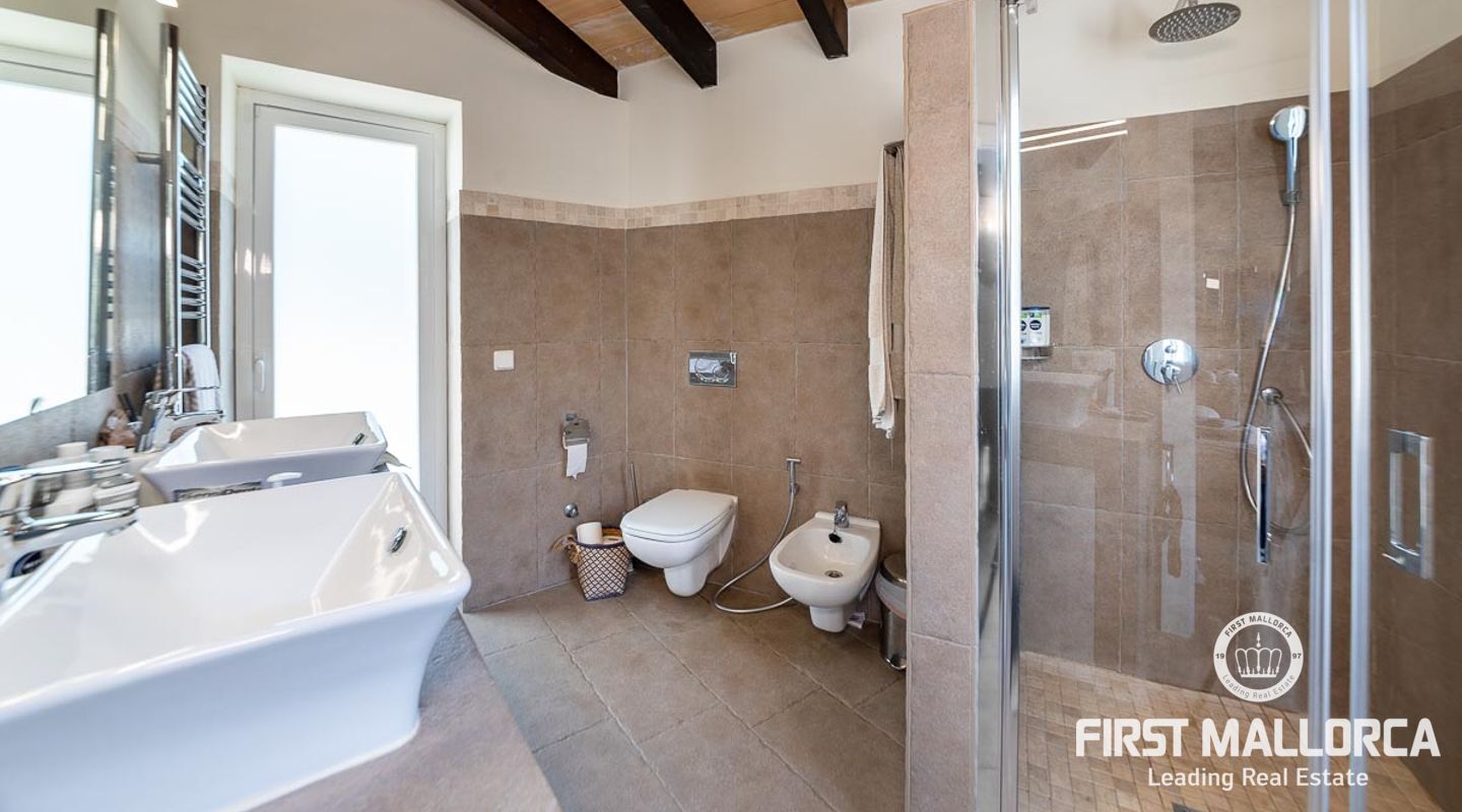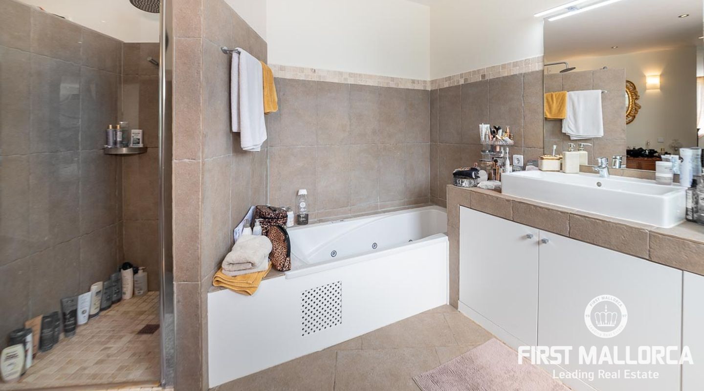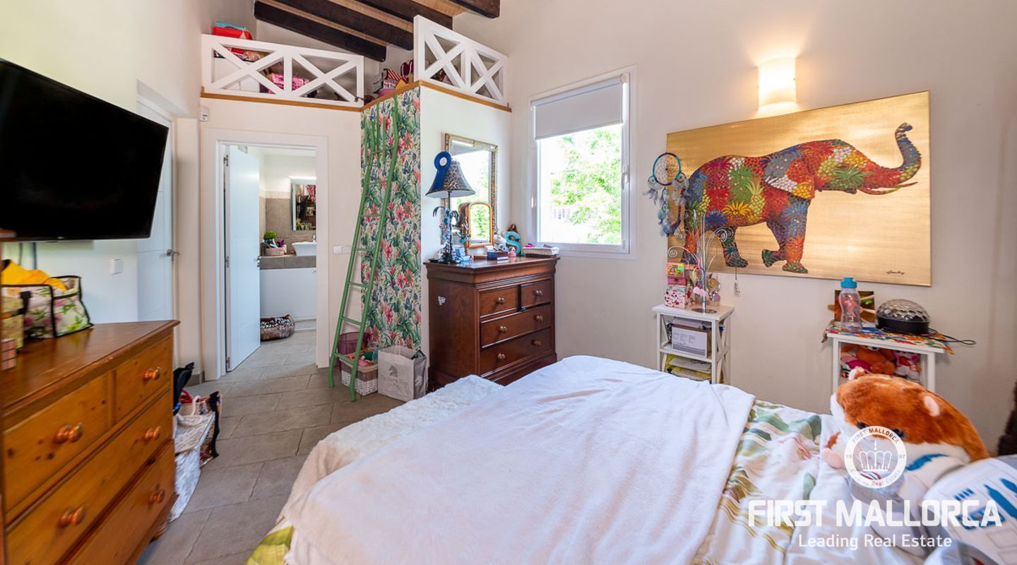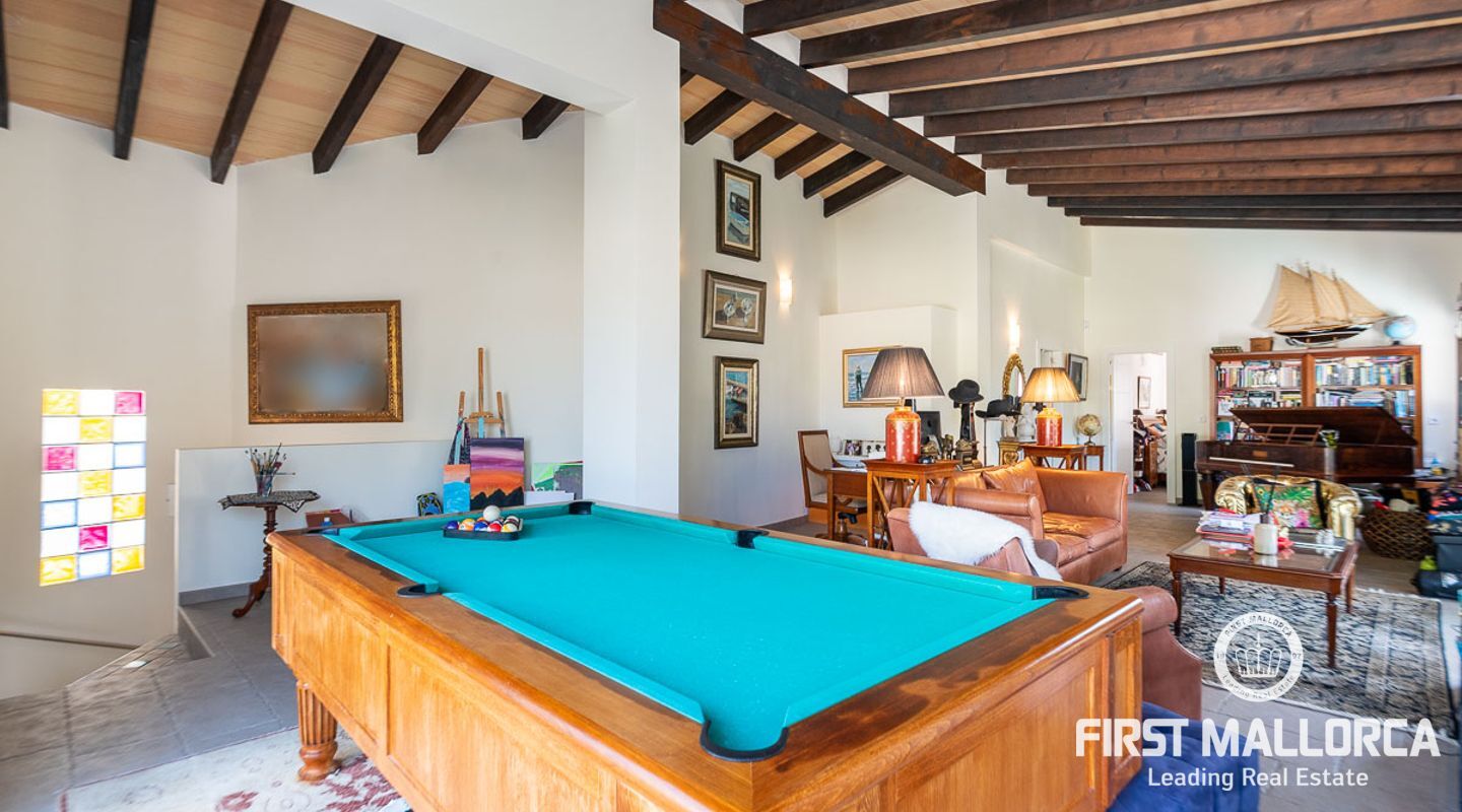 The ground floor is open plan and offers a bright living room with patio doors overlooking the garden and pool, a dining area and kitchen with island. There is also a double bedroom with en-suite bathroom, a guest bedroom with separate bathroom, and a laundry room. The first floor has a second living area / games room with 3.9m high wood-beamed ceilings, and direct access to both covered and sunny terraces and two double bedrooms, each with an en-suite bathroom and balcony.