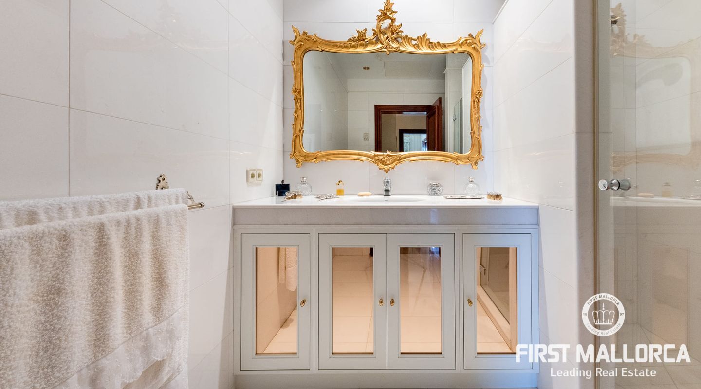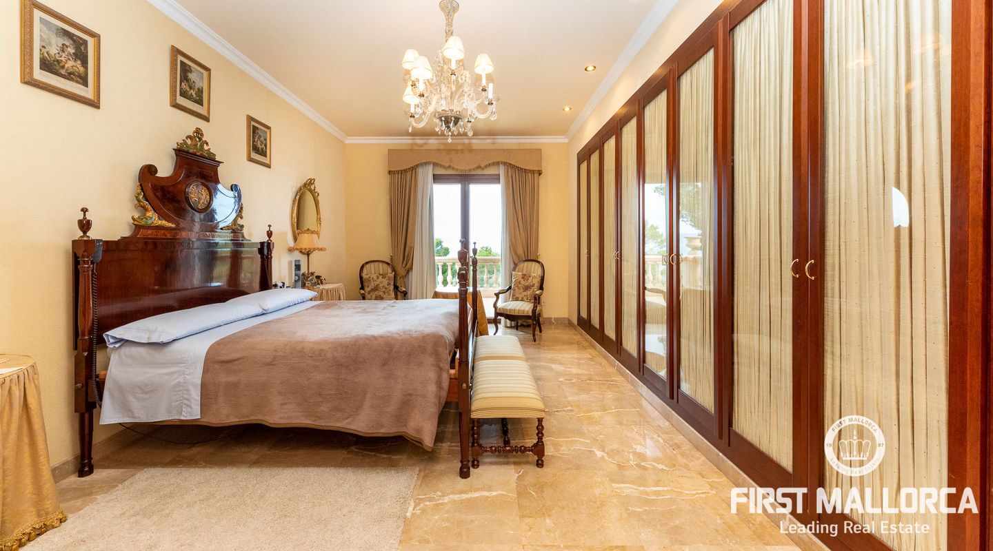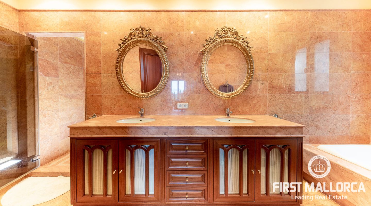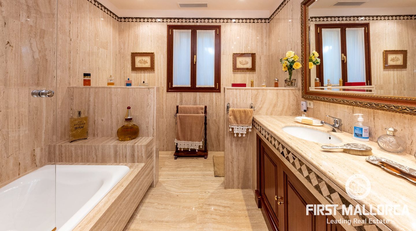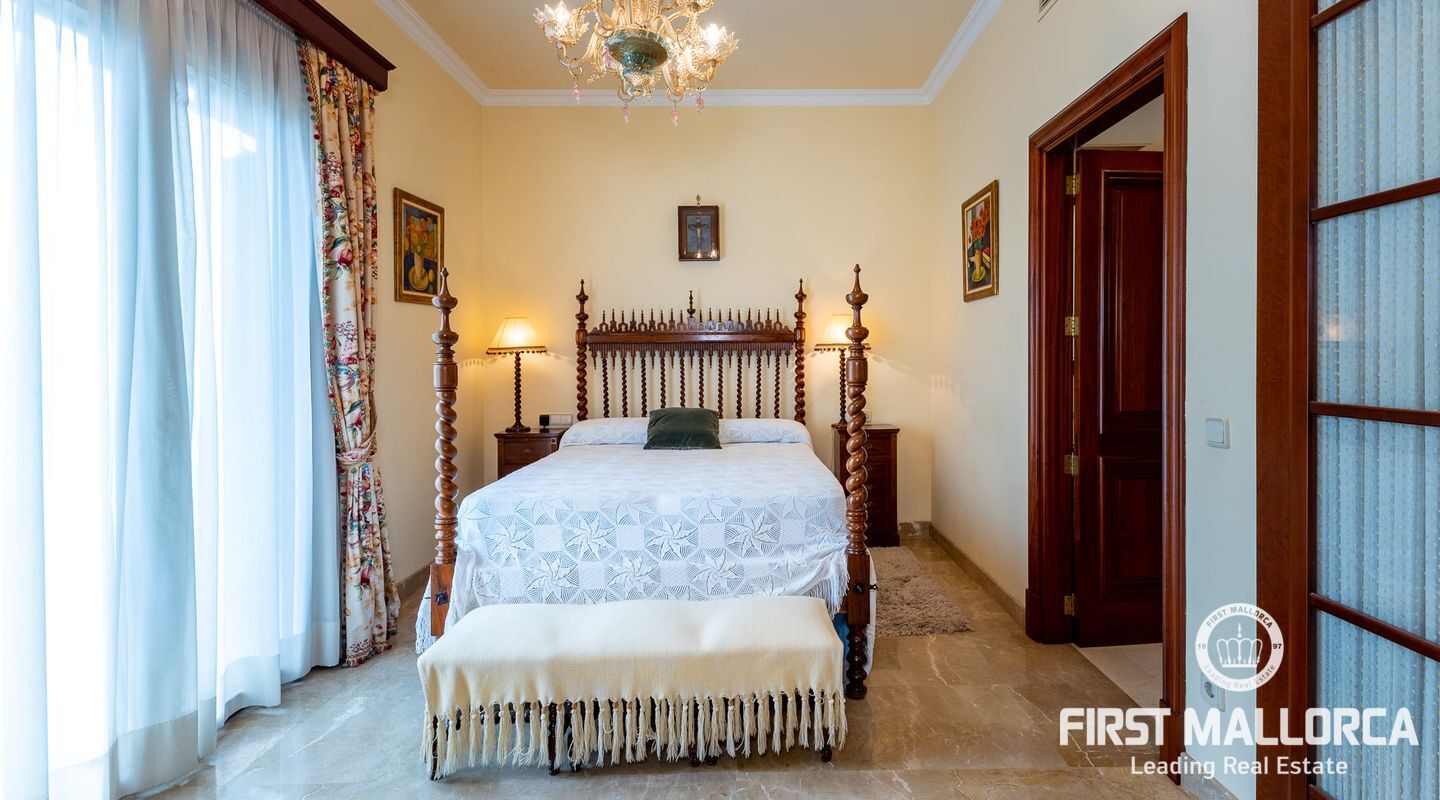 On the upper floor there is another living room with fireplace and access to another terrace, which offers marvellous sea views to the bay of Palma. From the gallery there are 4 further bedrooms, each with a bathroom en suite.