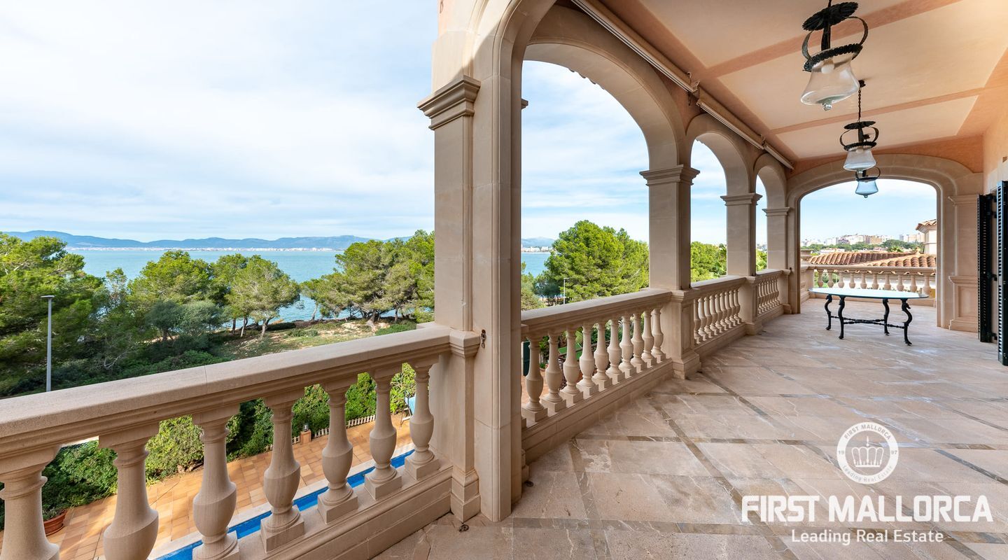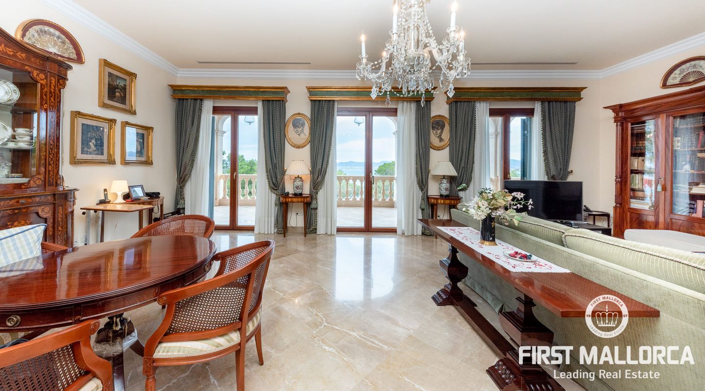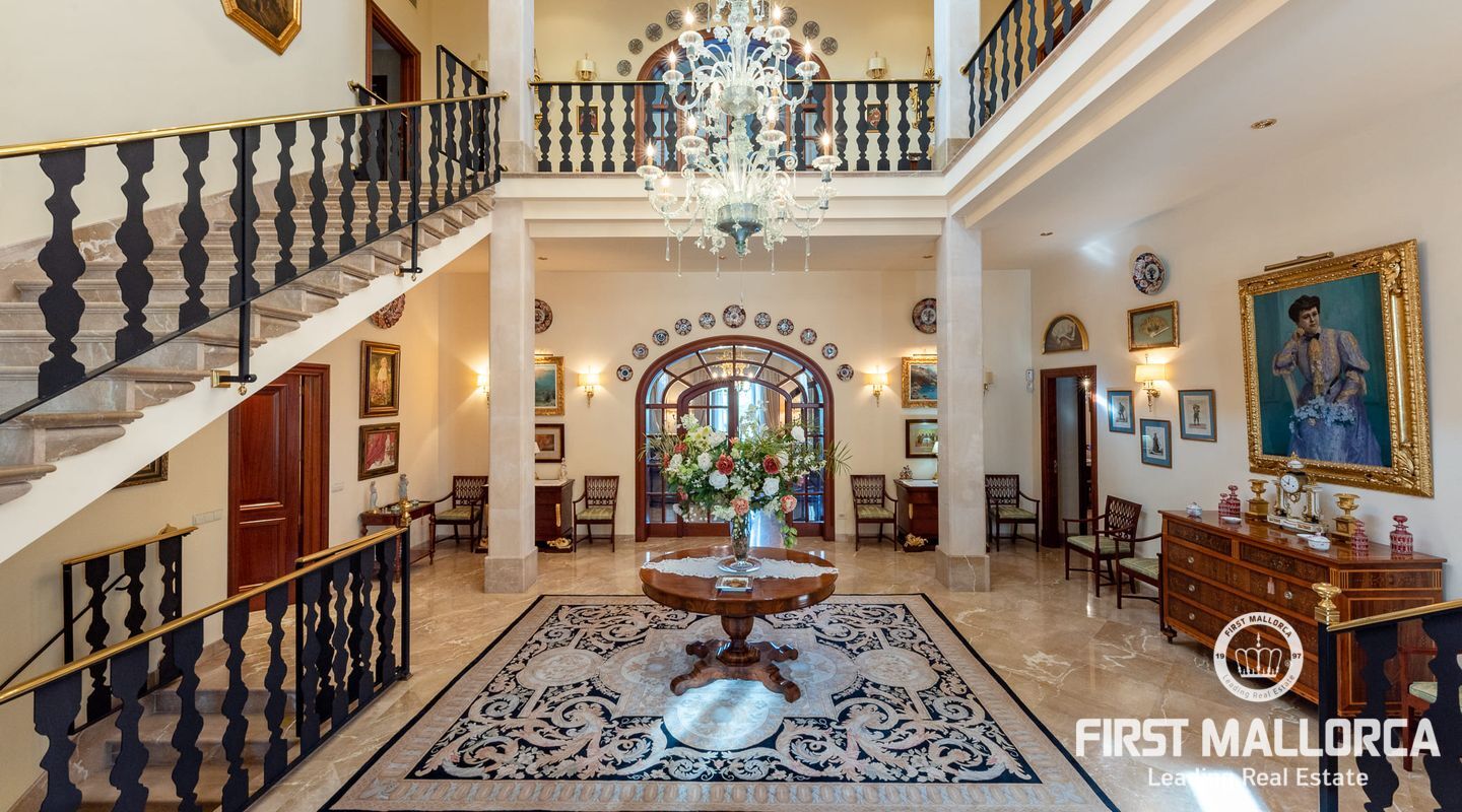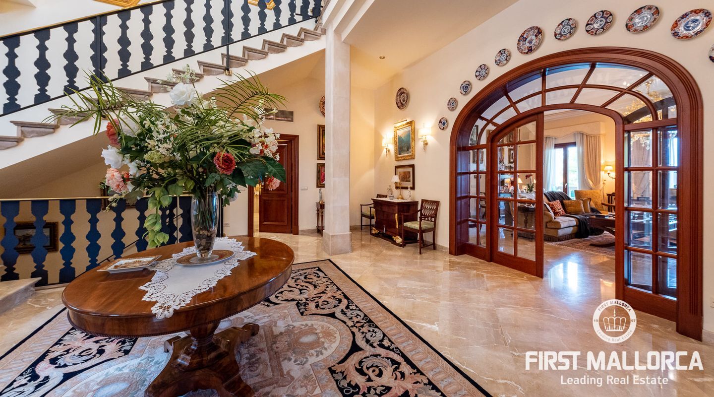 Classic Mediterranean villa on the seafront. You will be enchanted by the large reception room, its majestic staircase and the gallery. The chandelier, the columns, the marble floor and the iron railing underline the atmosphere. It is flooded with light thanks to the windows in the ceiling. At the front of the entrance you reach the living room with a library and fireplace as well as the dining room with access to the kitchen. There is also a bedroom with bathroom en suite on this floor and the large terrace gives access to the pool area.