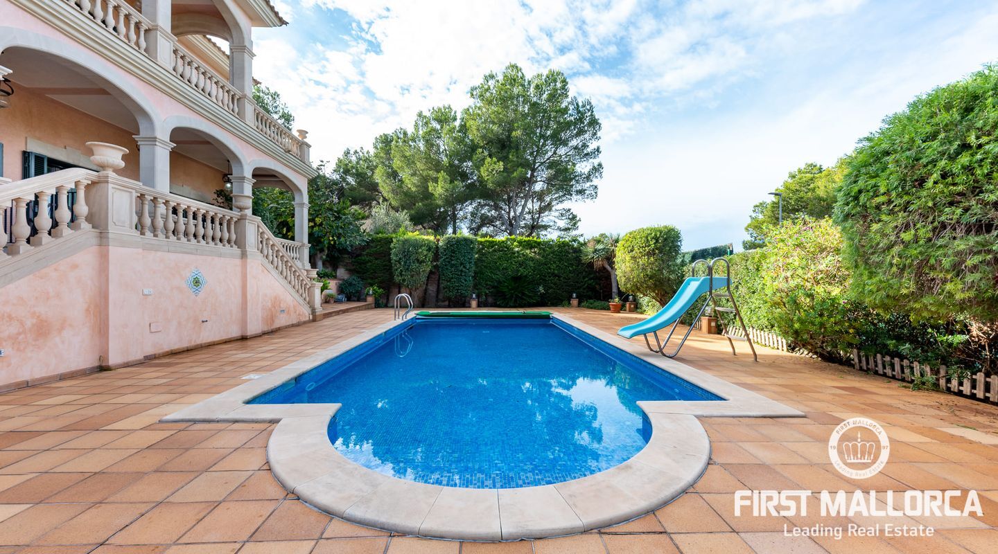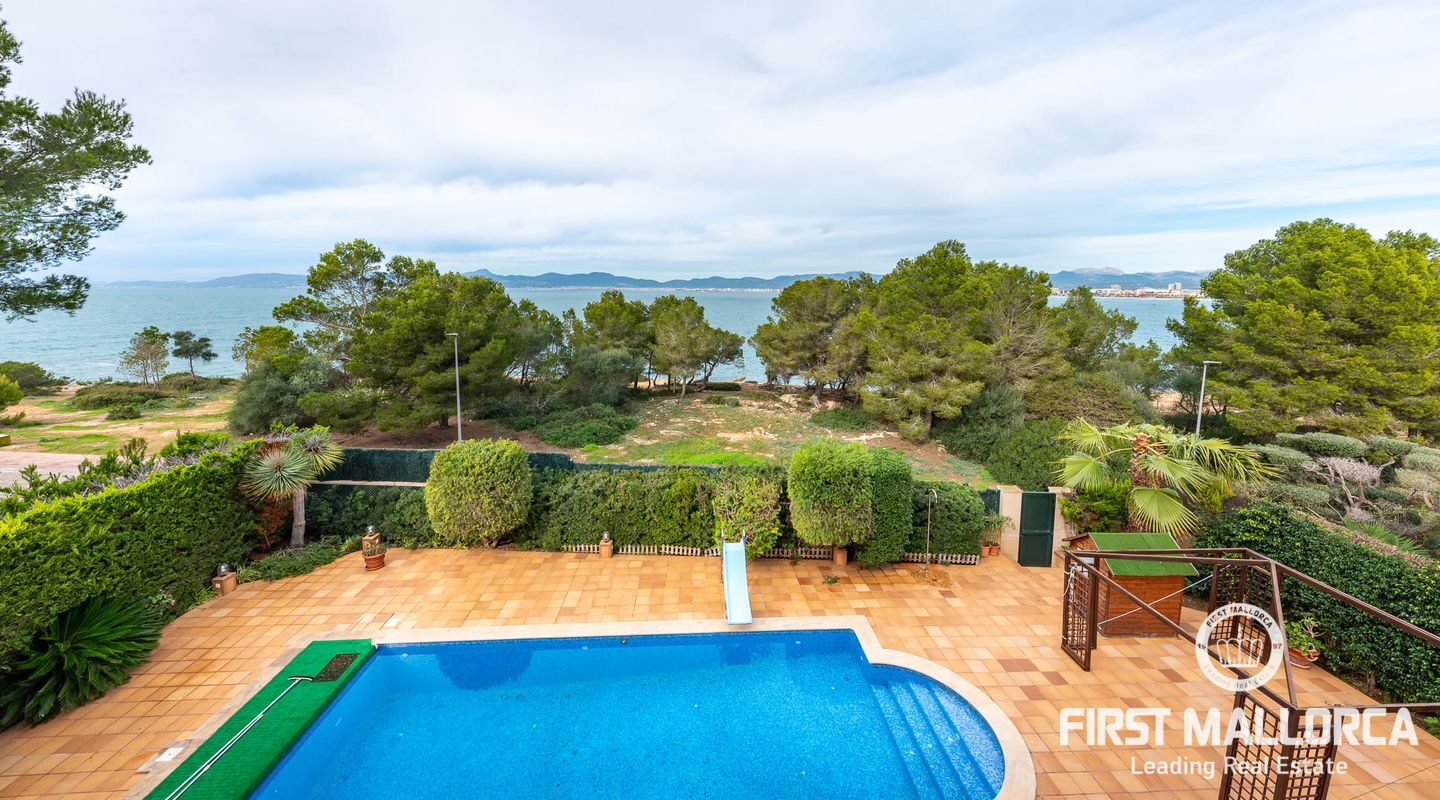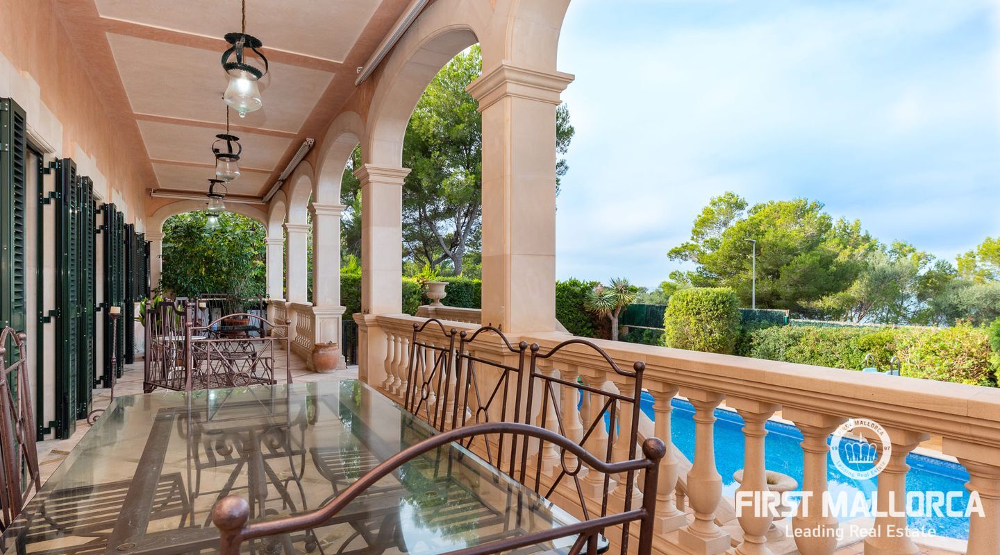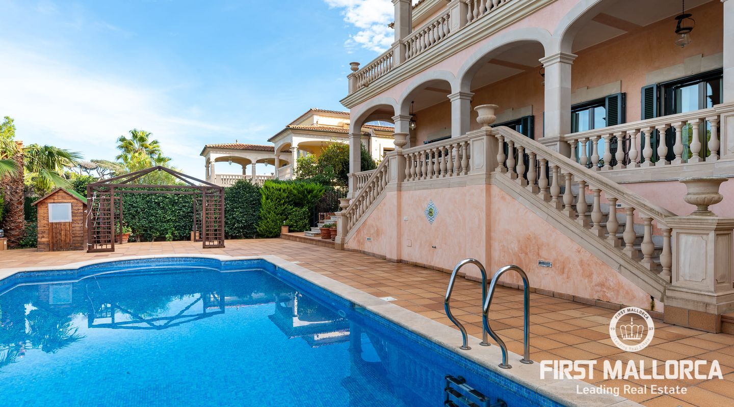 Classic Mediterranean villa on the seafront. You will be enchanted by the large reception room, its majestic staircase and the gallery. The chandelier, the columns, the marble floor and the iron railing underline the atmosphere. It is flooded with light thanks to the windows in the ceiling. At the front of the entrance you reach the living room with a library and fireplace as well as the dining room with access to the kitchen. There is also a bedroom with bathroom en suite on this floor and the large terrace gives access to the pool area.