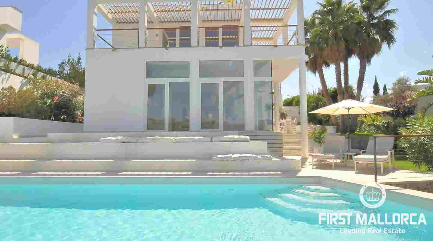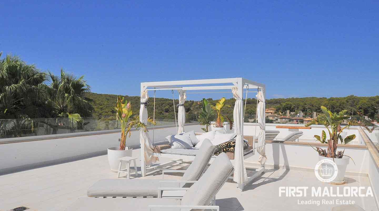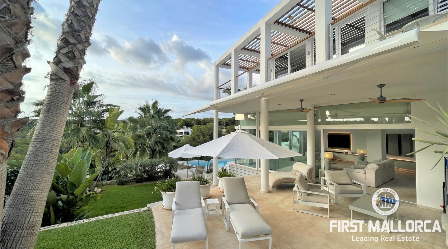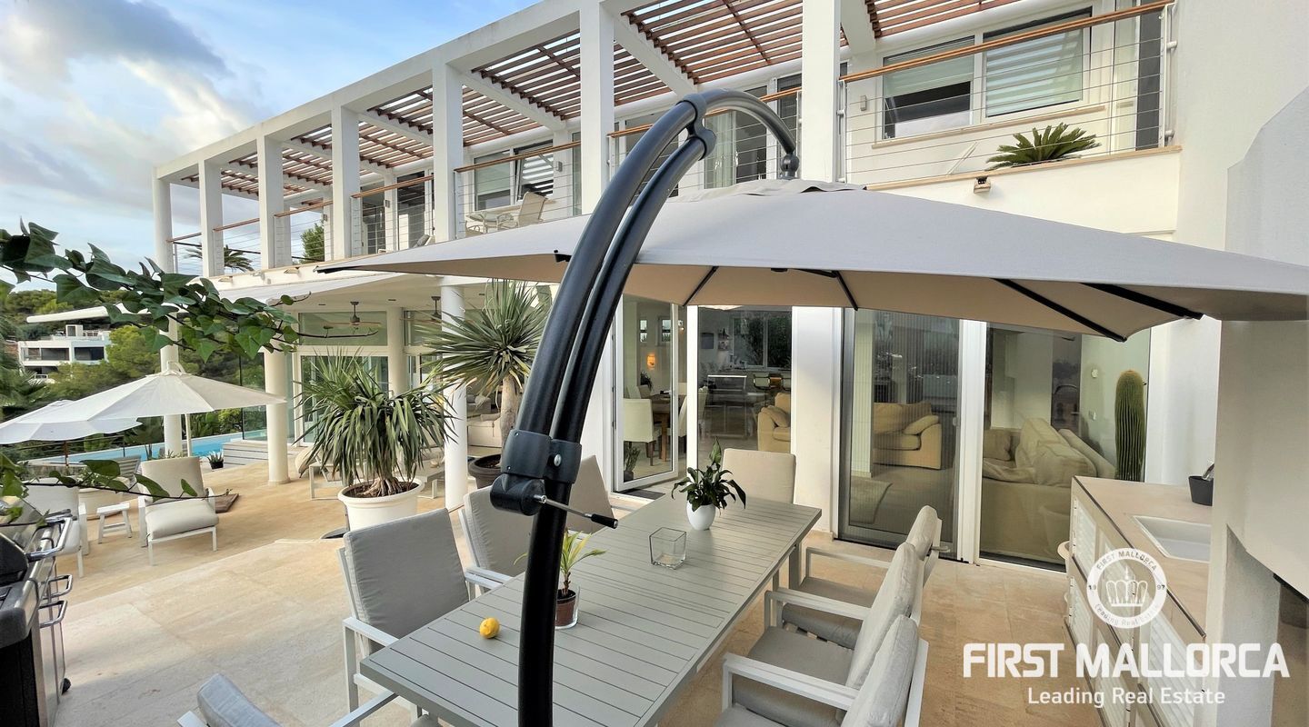 An attractive and spacious contemporary design villa in a peaceful residential area of Sol de Mallorca. The exclusive property is located only a few minutes by car from the fashionable marina of Port Adriano with its cafés, restaurants and boutiques. The 4 bedroom, 4 bathroom villa sits in a garden plot of 1,310 m2. It has a constructed area of 426 m2 including approximately 20 m2 of covered terraces. In addition there are 100 m2 of open terraces and a roof terrace of approximately 85 m2 with excellent views to the sea, the landscape and the mountains. Additional features include an open fireplace, a bar, high quality materials and a storeroom. Within a few minutes walking one finds some of the island's most spectacular beaches as well as a vast protected natural reserve, ideal for hiking.