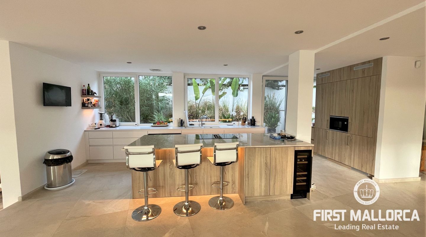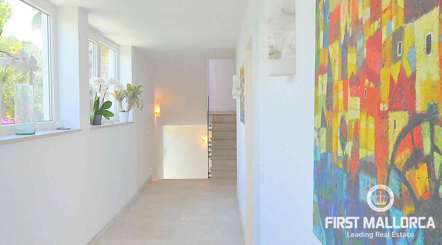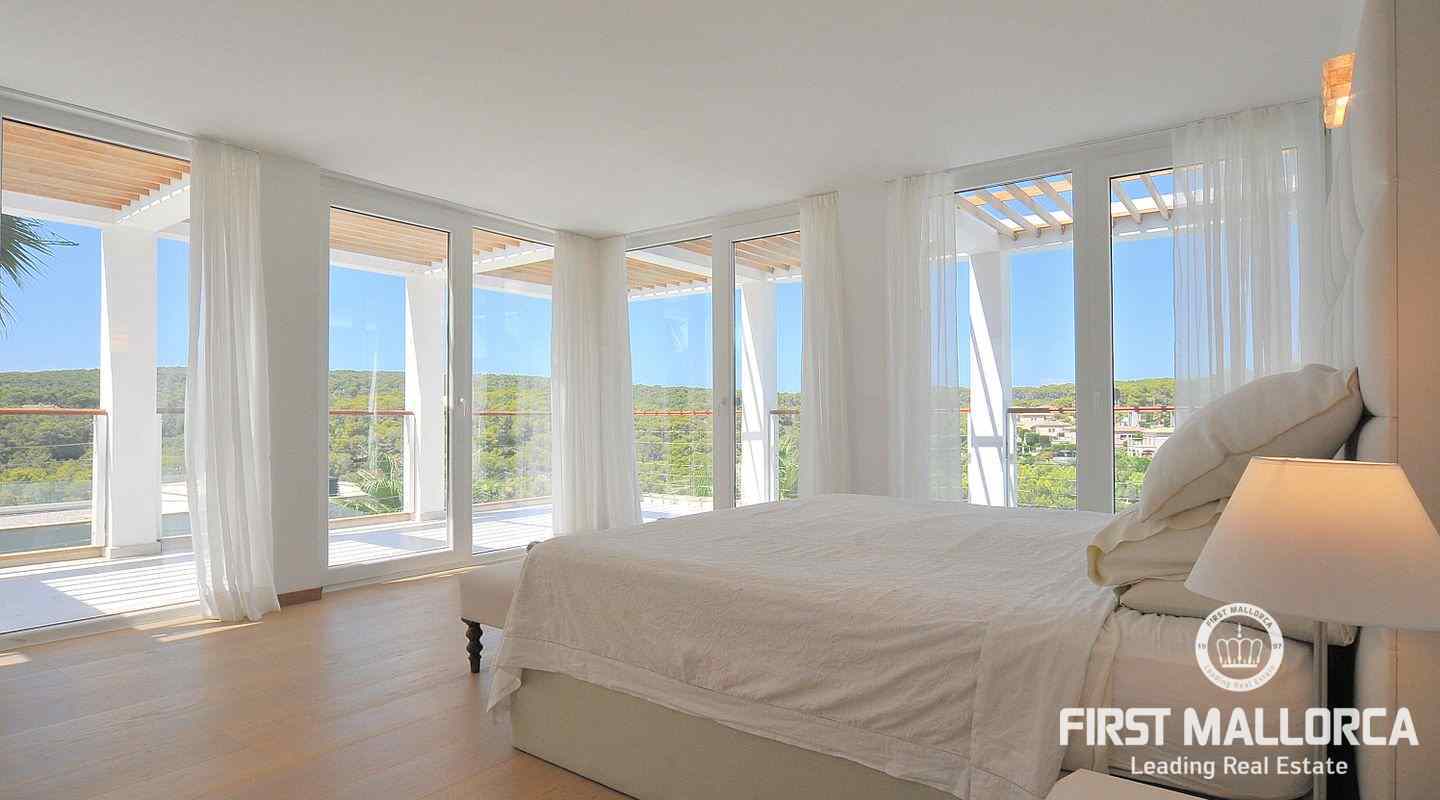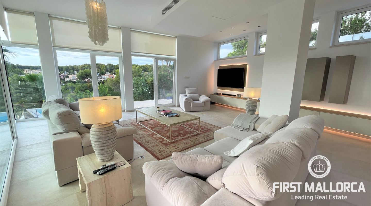 An attractive and spacious contemporary design villa in a peaceful residential area of Sol de Mallorca. The exclusive property is located only a few minutes by car from the fashionable marina of Port Adriano with its cafés, restaurants and boutiques. The 4 bedroom, 4 bathroom villa sits in a garden plot of 1,310 m2. It has a constructed area of 426 m2 including approximately 20 m2 of covered terraces. In addition there are 100 m2 of open terraces and a roof terrace of approximately 85 m2 with excellent views to the sea, the landscape and the mountains. Additional features include an open fireplace, a bar, high quality materials and a storeroom. Within a few minutes walking one finds some of the island's most spectacular beaches as well as a vast protected natural reserve, ideal for hiking.