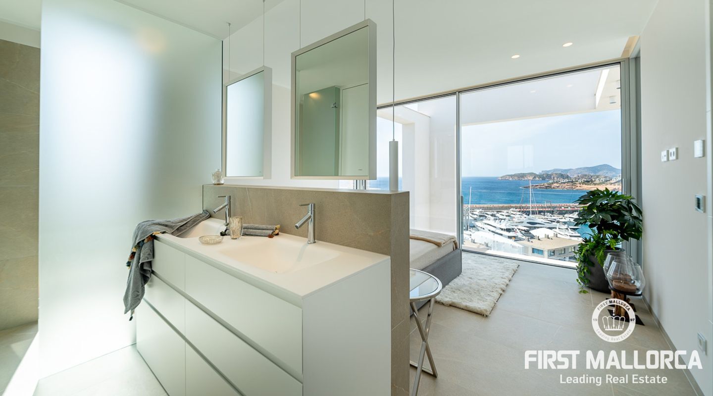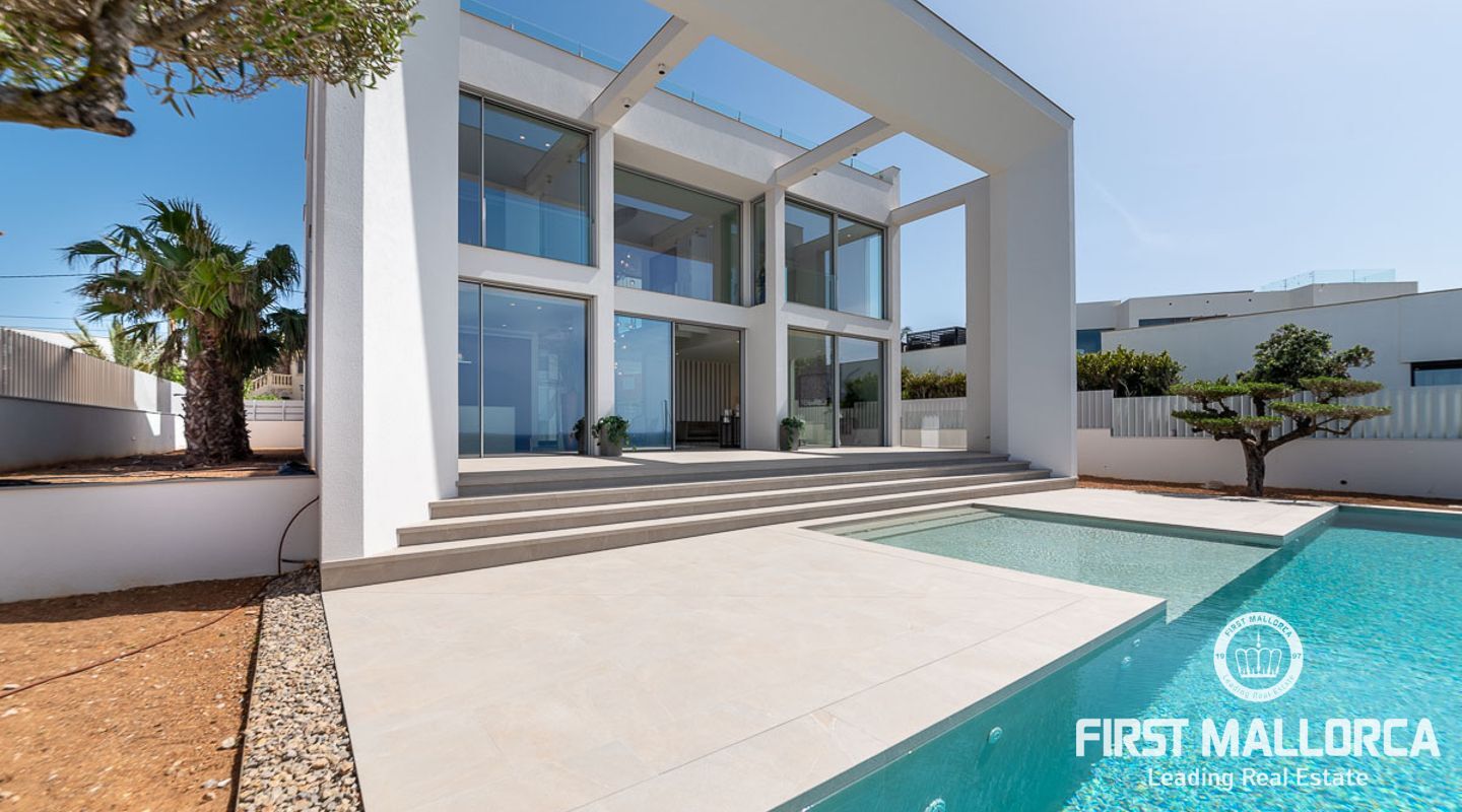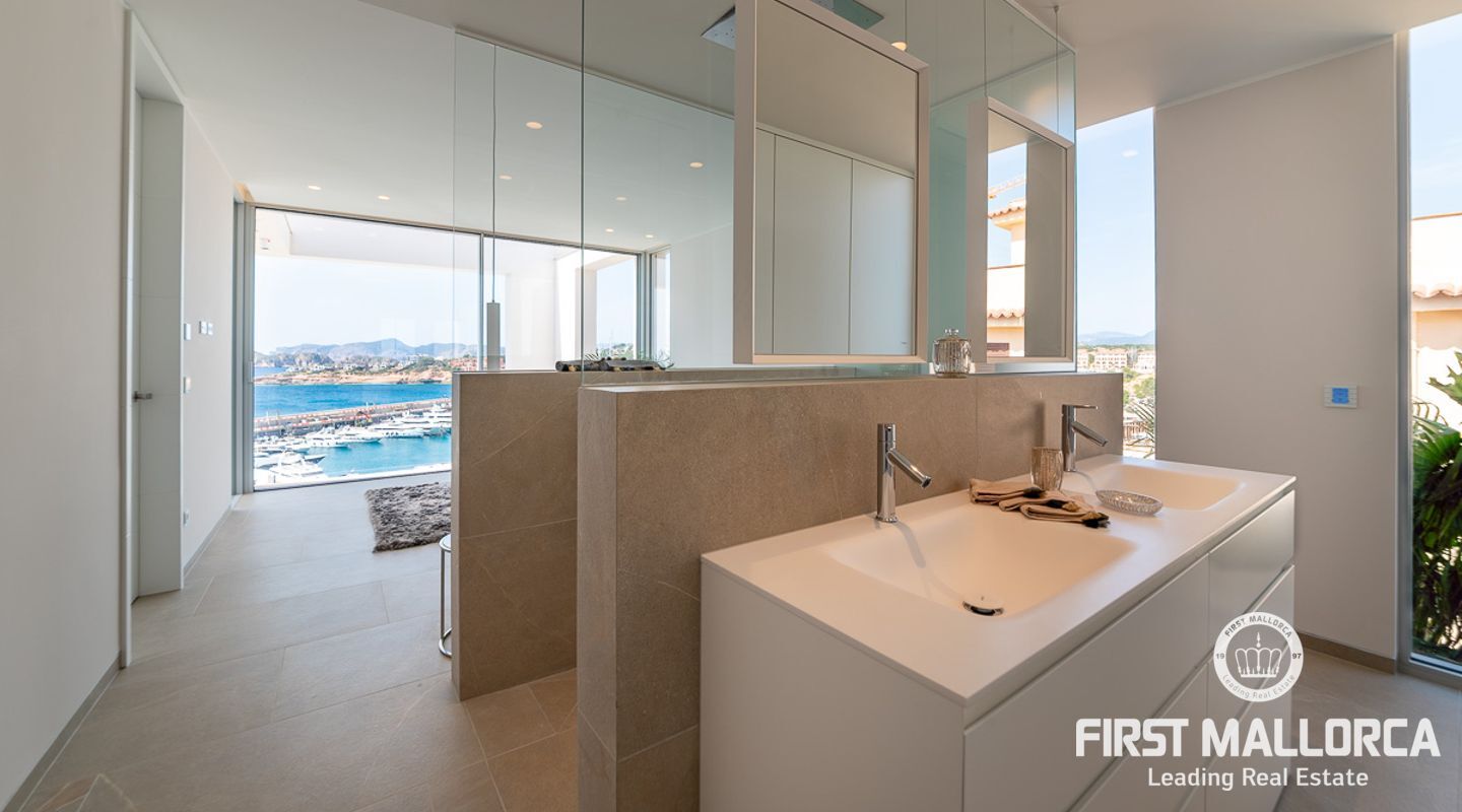 Modern designer villa with fantastic view in Port Adriano. The modern villa which offers fantastic views over the bay of Port Adriano. Port Adriano in the south-west of Mallorca is one of the most beautiful harbours in the Mediterranean, with crystalline waters and fantastic views. This project of a modern villa is realized on an 890 m2 plot, a full constructed area of 612,27 m2 plus a terrace of 100 m2 and a rooftop of 121 m2 with pool. The villa offers fantastic views of the port and the Mediterranean Sea. One of the specials of this villa is the designed entrance door and the glass lift. In total there are 4 bedrooms, 4 bathrooms, a guest bath, an open plan living/dining area with an adjoining luxury fitted kitchen, a cinema, a gym and a wardrobe. Spacious open and covered terraces and the large pool guarantee a comfortable relaxing area for several people.