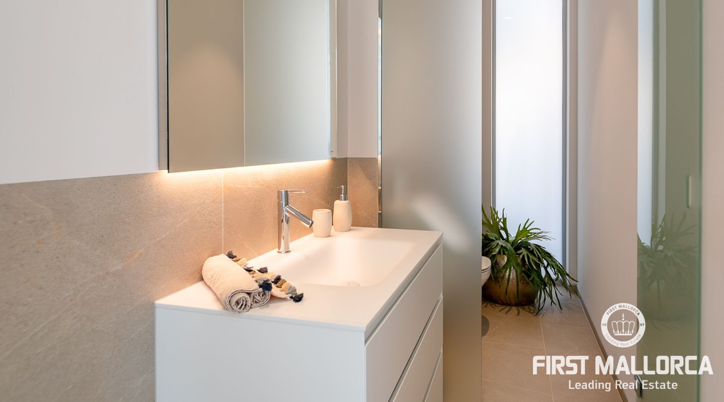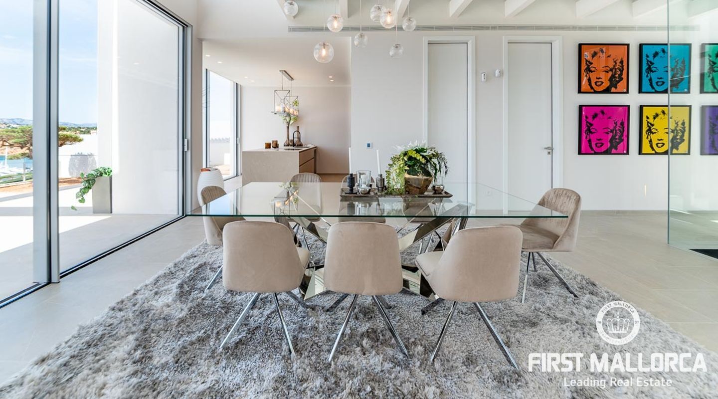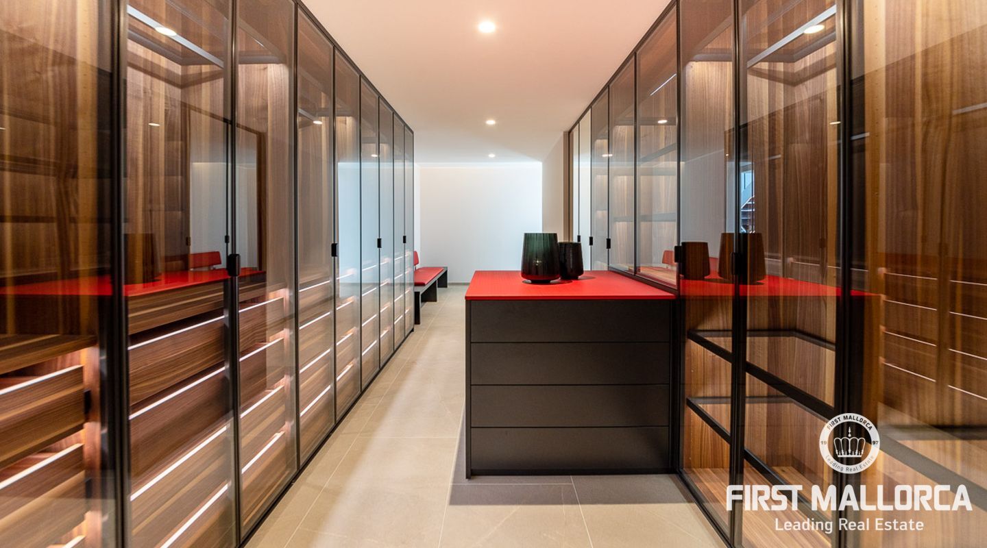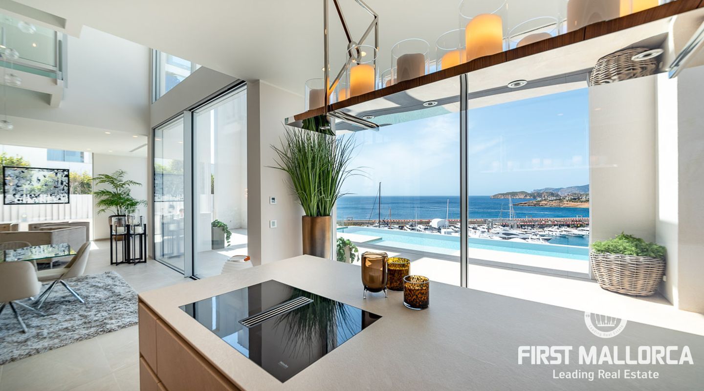Modern designer villa with fantastic view in Port Adriano. The modern villa which offers fantastic views over the bay of Port Adriano. Port Adriano in the south-west of Mallorca is one of the most beautiful harbours in the Mediterranean, with crystalline waters and fantastic views. This project of a modern villa is realized on an 890 m2 plot, a full constructed area of 612,27 m2 plus a terrace of 100 m2 and a rooftop of 121 m2 with pool. The villa offers fantastic views of the port and the Mediterranean Sea. One of the specials of this villa is the designed entrance door and the glass lift. In total there are 4 bedrooms, 4 bathrooms, a guest bath, an open plan living/dining area with an adjoining luxury fitted kitchen, a cinema, a gym and a wardrobe. Spacious open and covered terraces and the large pool guarantee a comfortable relaxing area for several people.