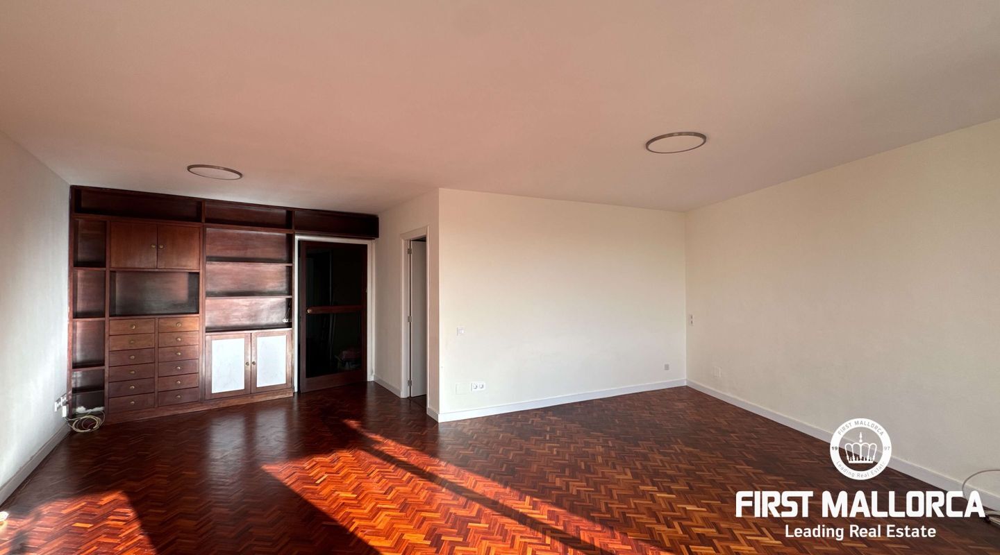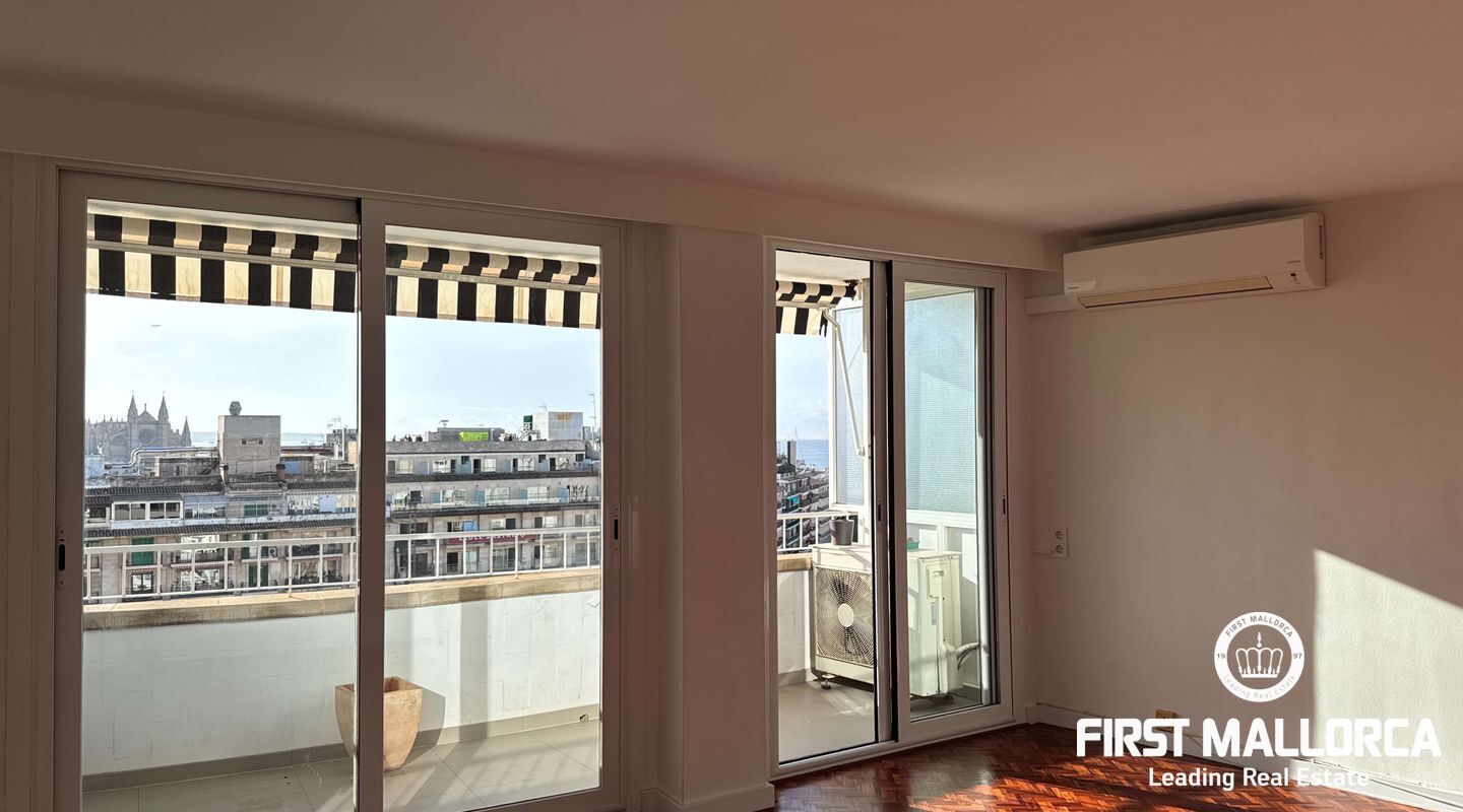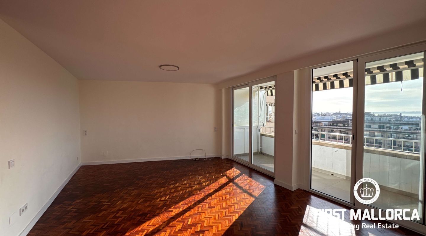 Este apartamento en la décima planta del prestigioso Paseo de Mallorca ofrece impresionantes vistas de la catedral, el mar Mediterráneo y el "Torrente". El soleado salón recibe la luz de la mañana a través de sus amplios ventanales.