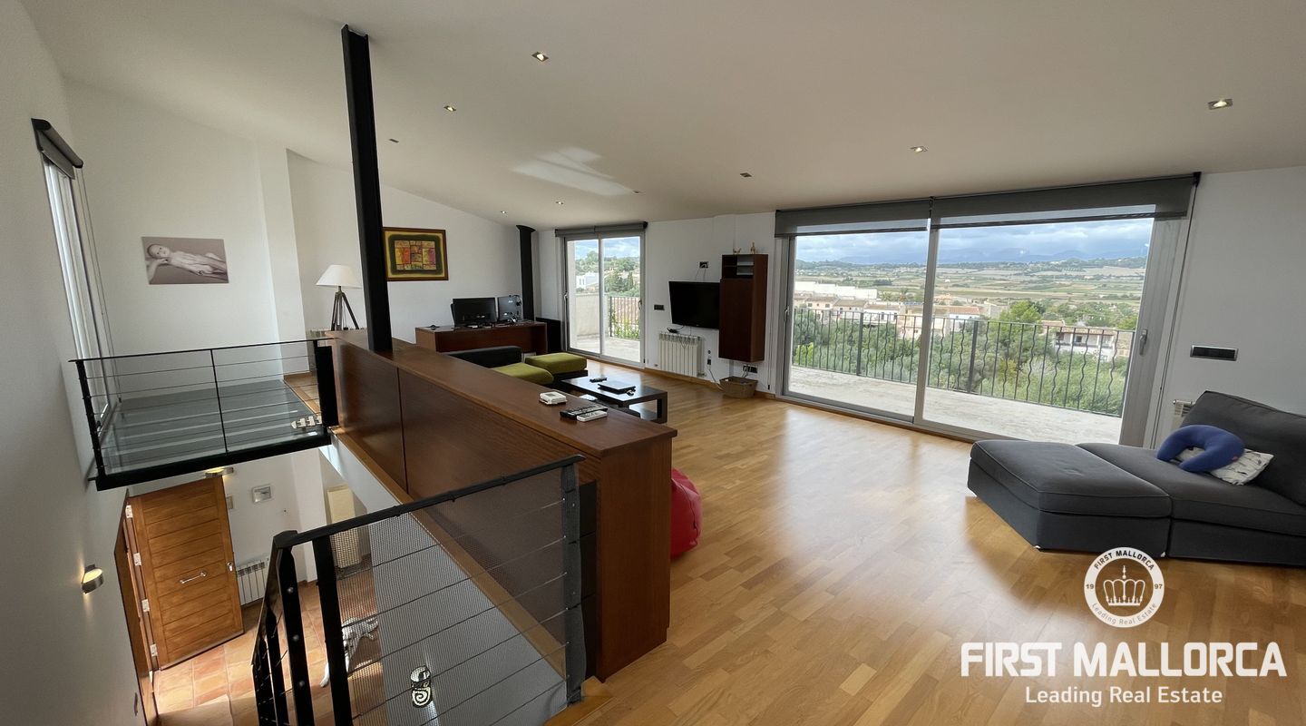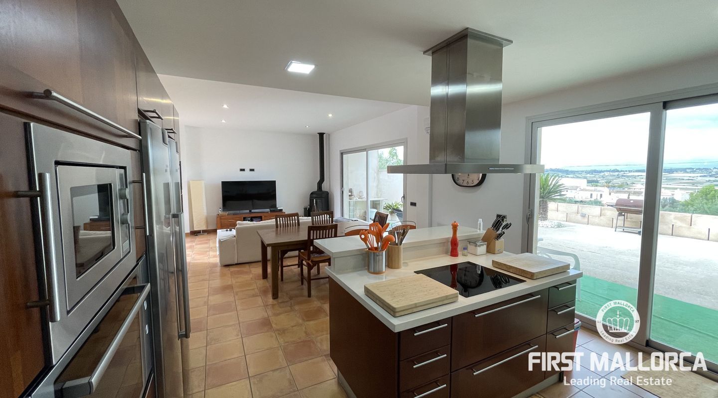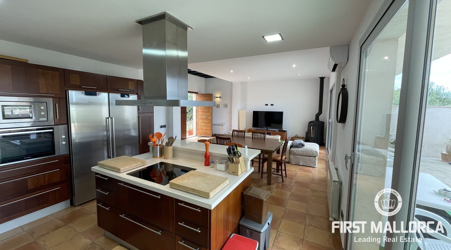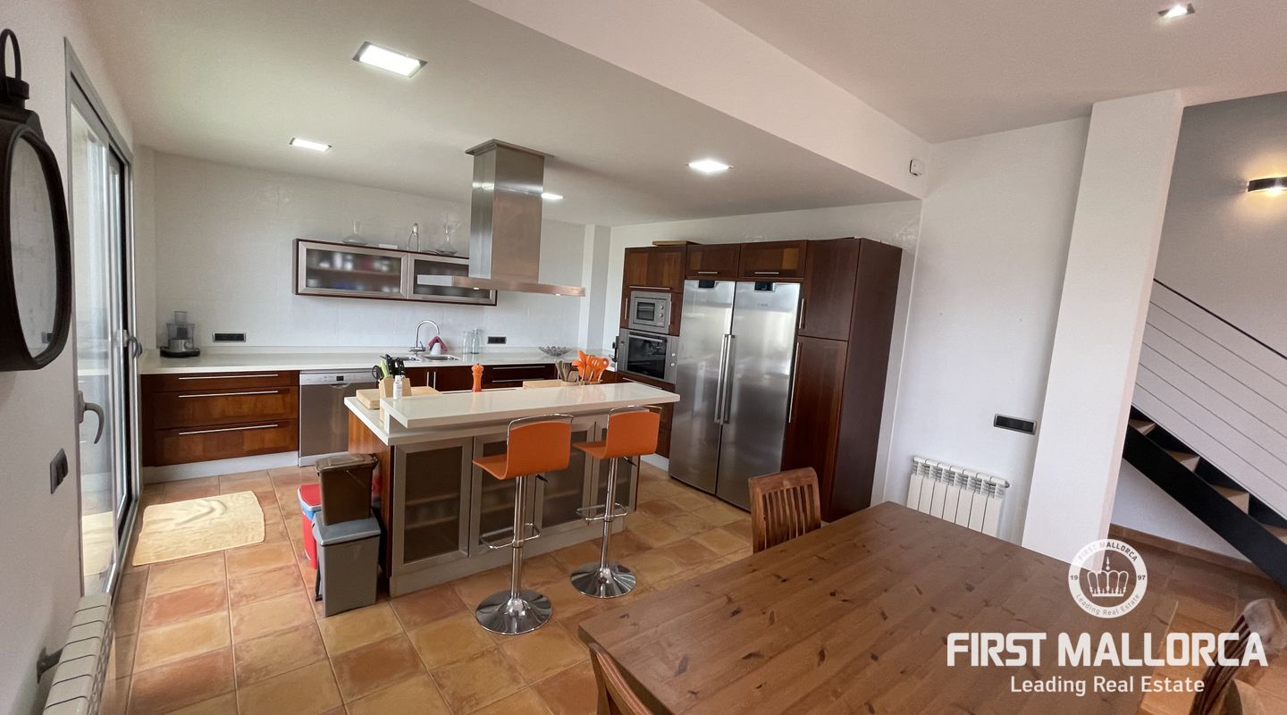 Al entrar le recibe un amplio y luminoso salón con cocina de concepto abierto e isla con zona de cocción por inducción, todo ello con vistas a las montañas del interior de Mallorca.