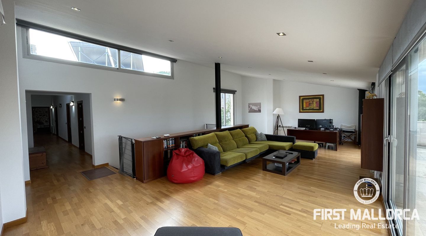 Subiendo a la primera planta encontramos un segundo salón con un estudio, grandes puertas correderas conducen a un espacioso balcón con vistas. La luz natural es la protagonista.