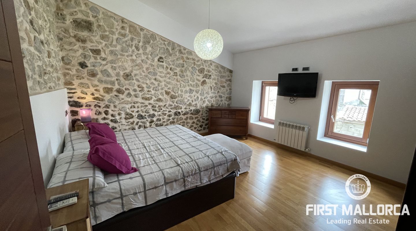 Desde el salón superior el pasillo nos conduce a la zona de noche con tres dormitorios y un cuarto de baño con bañera y ducha. El carácter del dormitorio principal se ve acentuado por las dos paredes con piedra natural vista.