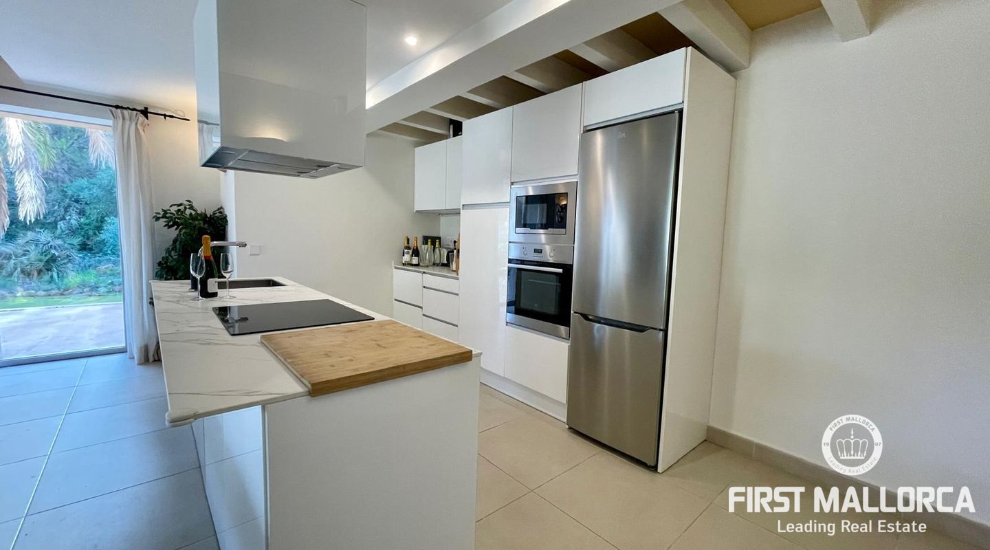 En la planta baja, todas las estancias tienen acceso directo al precioso jardín, ajardinado con plantas autóctonas, que además cuenta con una piscina de agua salada y magníficas vistas.