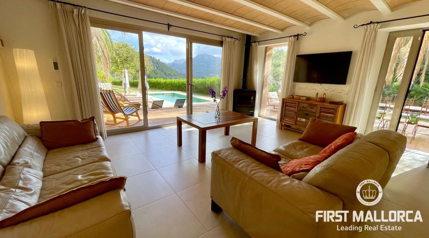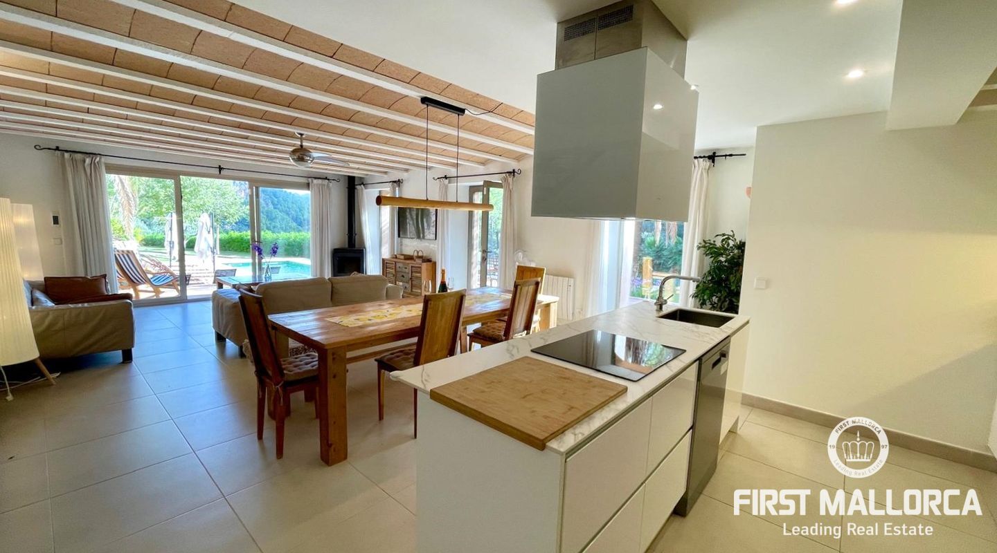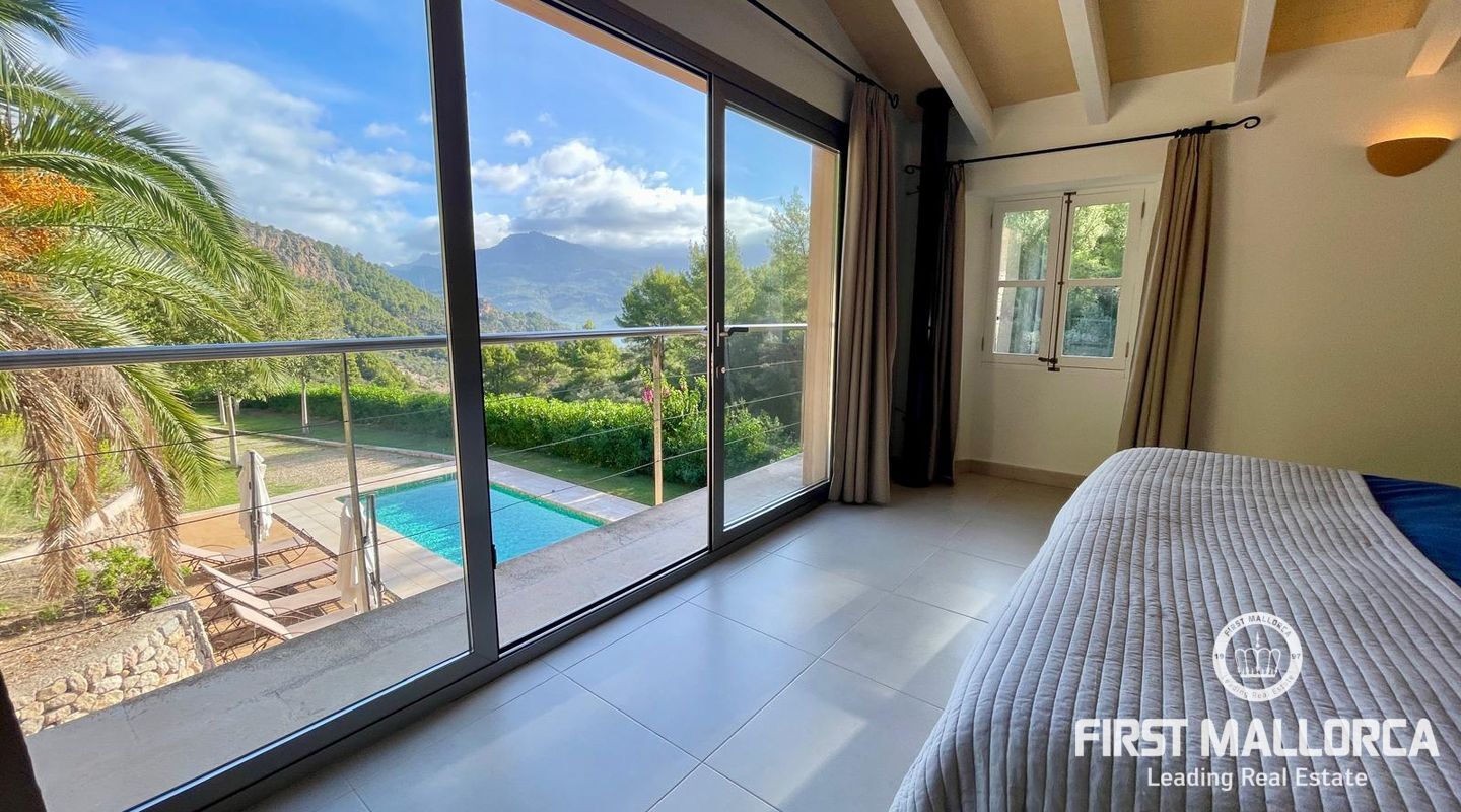 Esta encantadora casa de dos plantas dispone de cuatro dormitorios y un amplio salón-comedor de concepto abierto con estufa de pellets para las noches más acogedoras. La suite principal en la planta superior incluye una zona de estar privada, baño en suite y ofrece unas vistas impresionantes a las colinas verdes de Sóller.