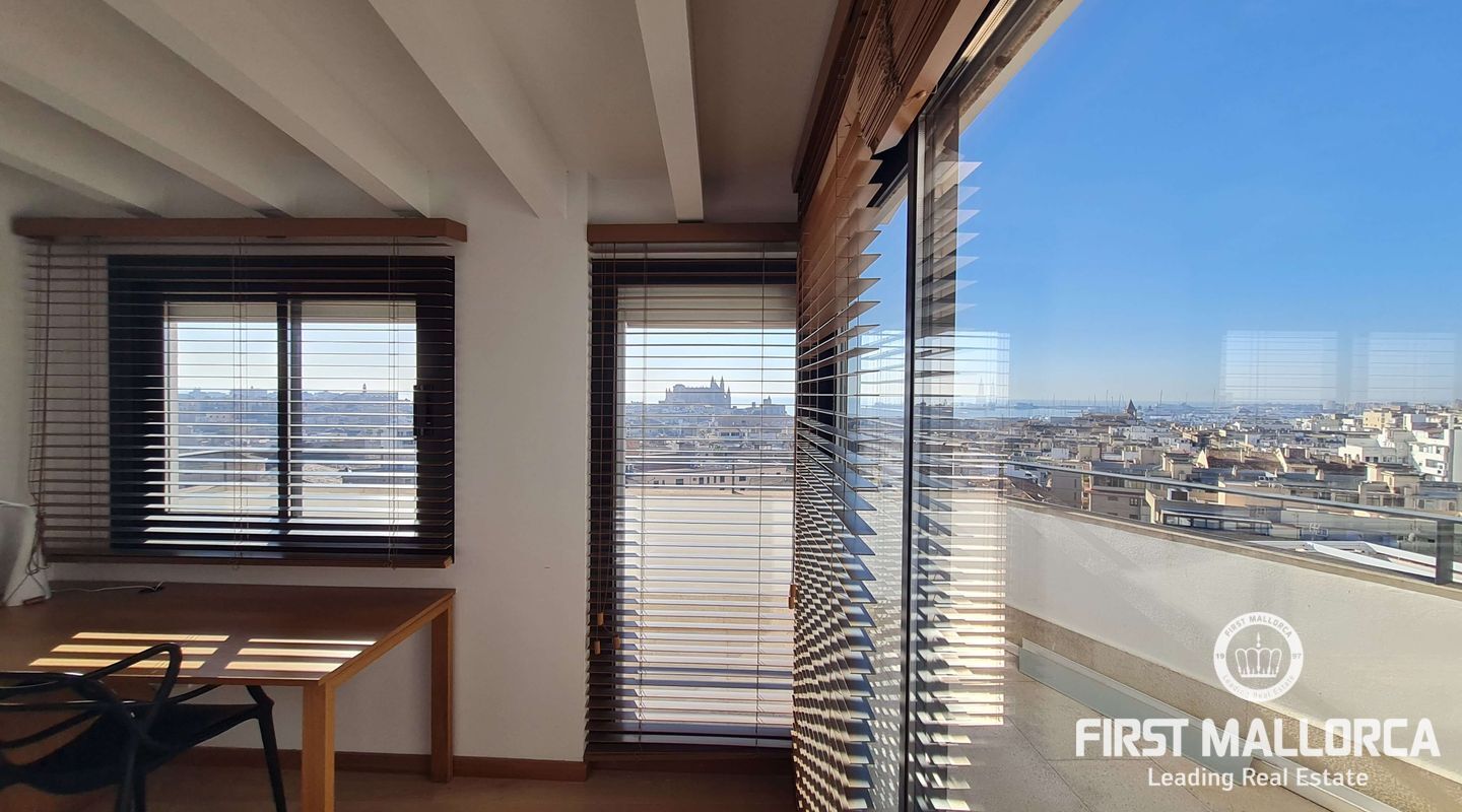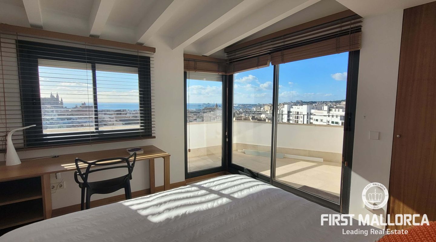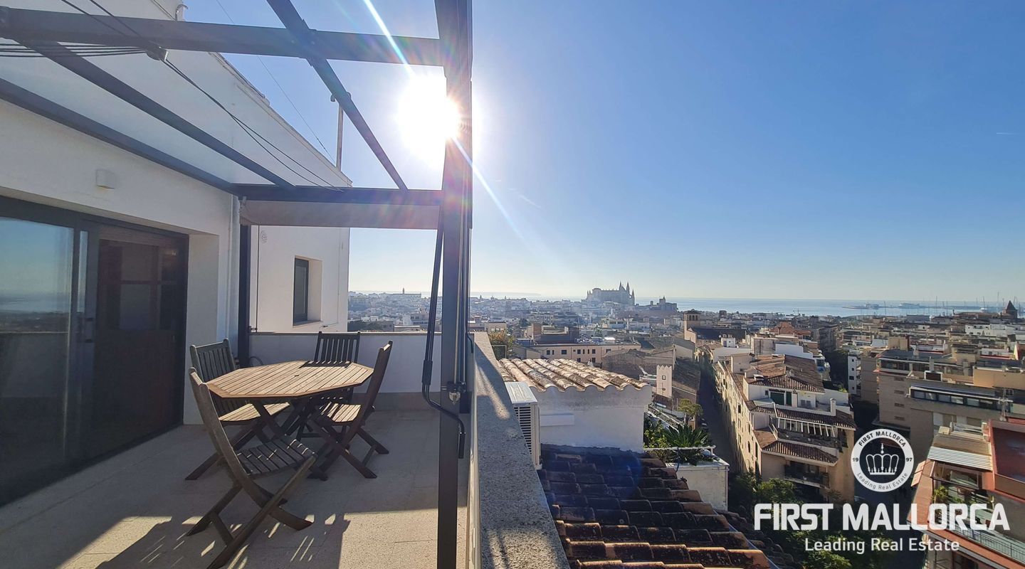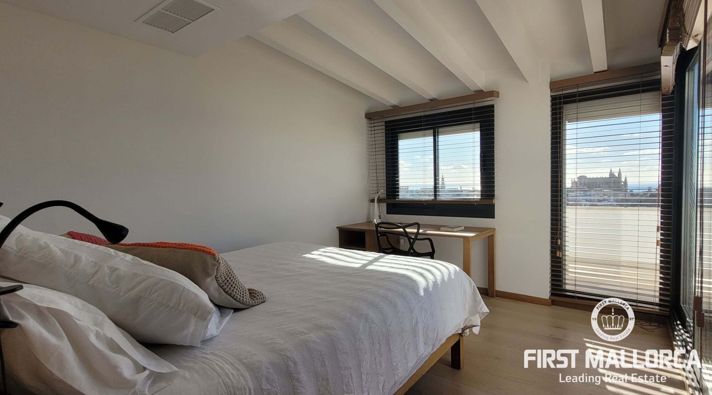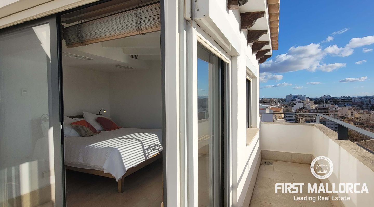 Este lujoso ático está situado en el corazón de Palma, a apenas escasos minutos a pié de la calle Jaime III, el paseo de Mallorca y la Rambla. La propiedad se caracteriza por su precioso y cuidado diseño, aparte de sus acabados de alta calidad. Goza de abundante luz natural que entra por sus amplios ventanales y al tratarse de la última planta, disfruta del privilegio de sus imponentes y despejadas vistas del casco antiguo, el mar y la sierra. El apartamento consta de un espacioso y luminoso salón-comedor, conectado a una amplia terraza con mesa y sillas, sofá y toldo. La cocina moderna proviso con electrodomésticos, posee una ventana doble que da a la bahía. Tiene tres dormitorios cómodos y con armarios empotrados de madera, de los cuales el principal es en suite, con vestidor propio, vistas a la catedral y terraza adyacente, ideal para disfrutar de una taza de café nada más al despertarse. Cabe destacar el suelo con parquet de madera natural, aíre acondicionado por conductos, descalificador de agua, calefacción y parking para un coche pequeño. La vivienda está totalmente equipada y se alquila a largo y corto plazo. Para más información no dude en contactar a su agente de First Mallorca.