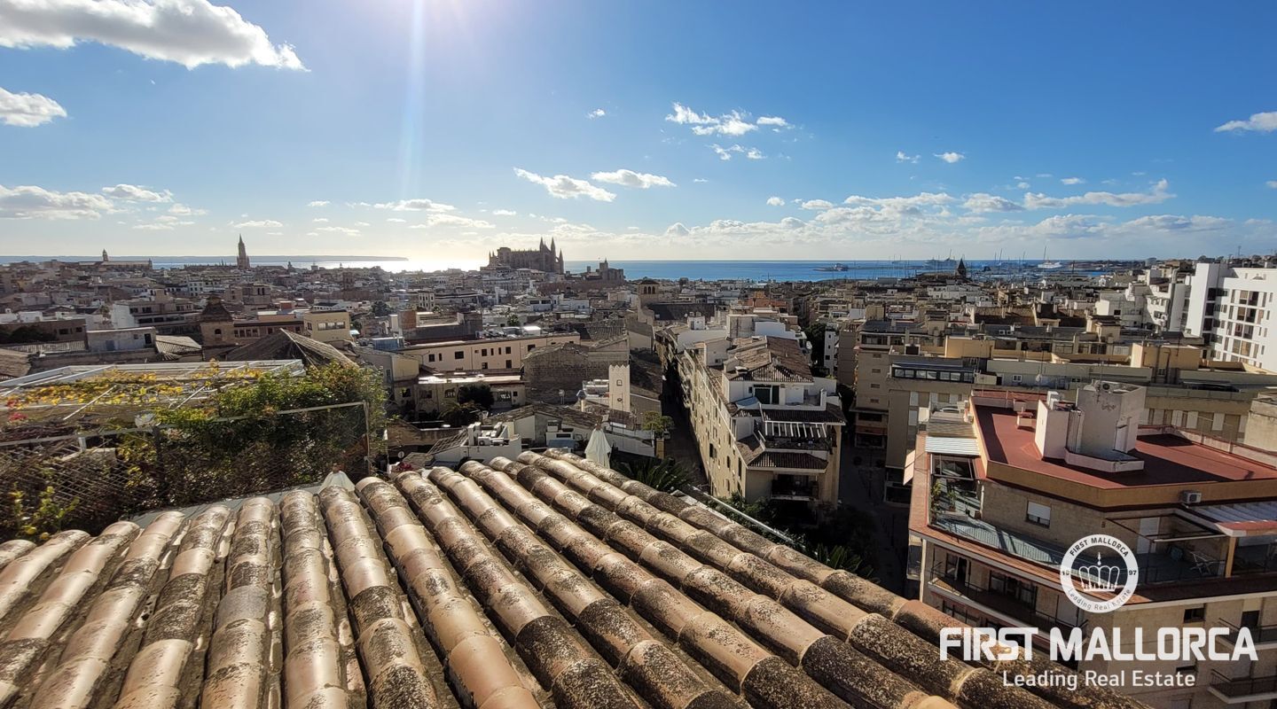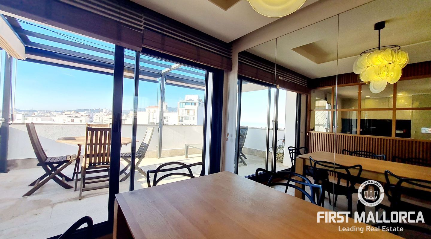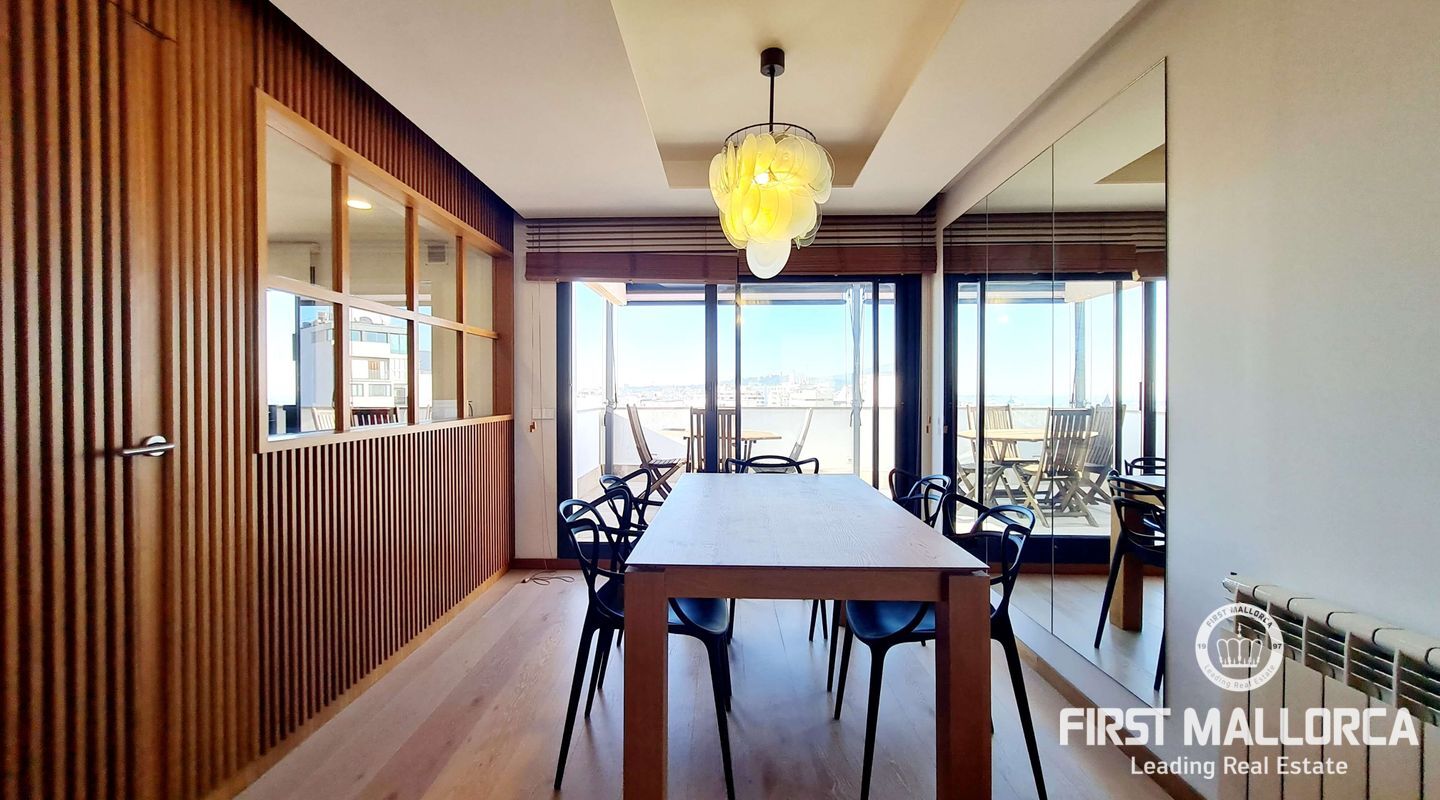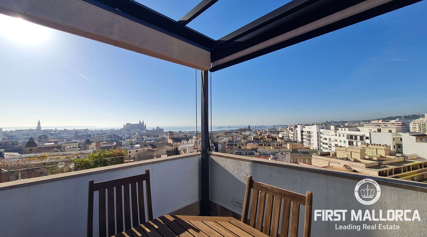 Este lujoso ático está situado en el corazón de Palma, a apenas escasos minutos a pié de la calle Jaime III, el paseo de Mallorca y la Rambla. La propiedad se caracteriza por su precioso y cuidado diseño, aparte de sus acabados de alta calidad. Goza de abundante luz natural que entra por sus amplios ventanales y al tratarse de la última planta, disfruta del privilegio de sus imponentes y despejadas vistas del casco antiguo, el mar y la sierra. El apartamento consta de un espacioso y luminoso salón-comedor, conectado a una amplia terraza con mesa y sillas, sofá y toldo. La cocina moderna proviso con electrodomésticos, posee una ventana doble que da a la bahía. Tiene tres dormitorios cómodos y con armarios empotrados de madera, de los cuales el principal es en suite, con vestidor propio, vistas a la catedral y terraza adyacente, ideal para disfrutar de una taza de café nada más al despertarse. Cabe destacar el suelo con parquet de madera natural, aíre acondicionado por conductos, descalificador de agua, calefacción y parking para un coche pequeño. La vivienda está totalmente equipada y se alquila a largo y corto plazo. Para más información no dude en contactar a su agente de First Mallorca.