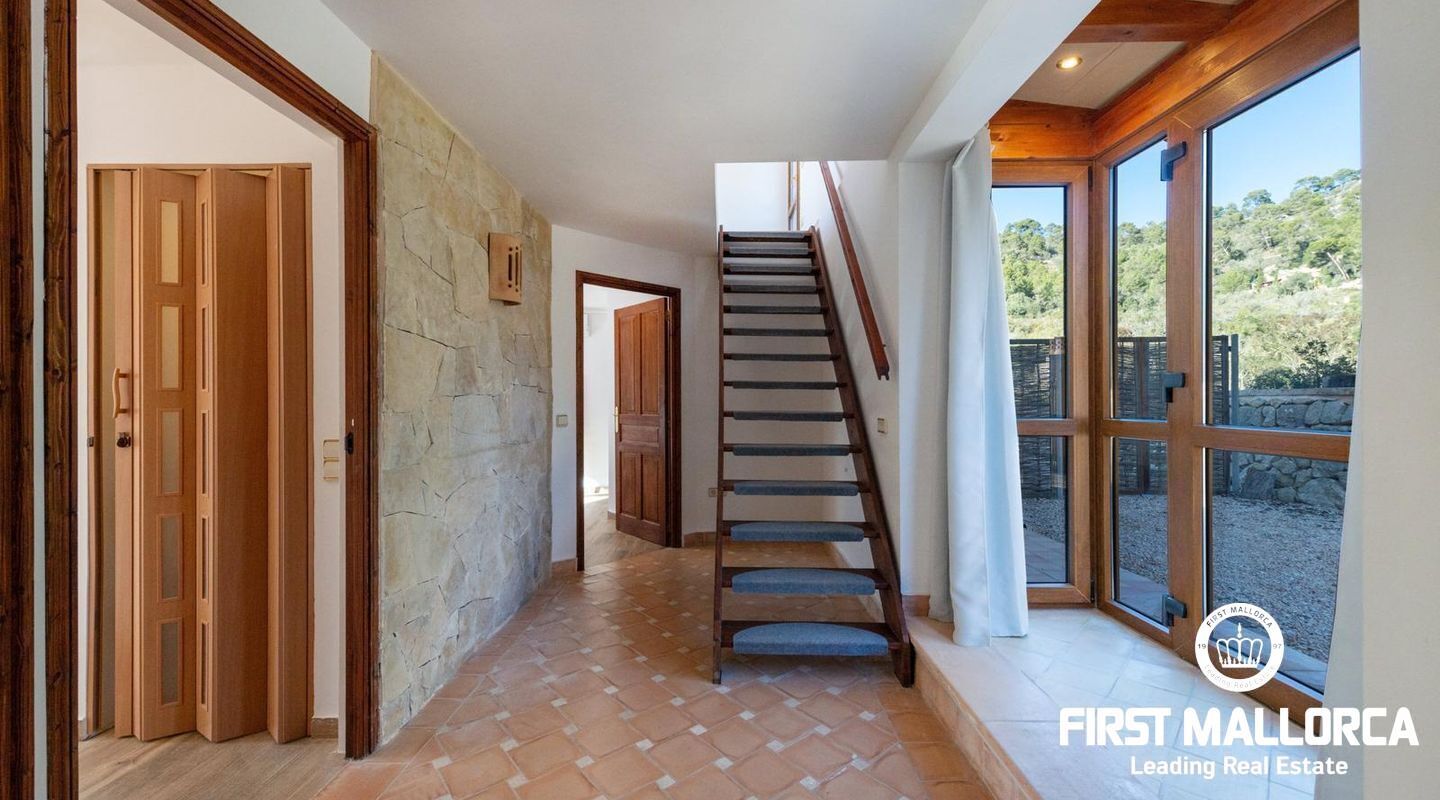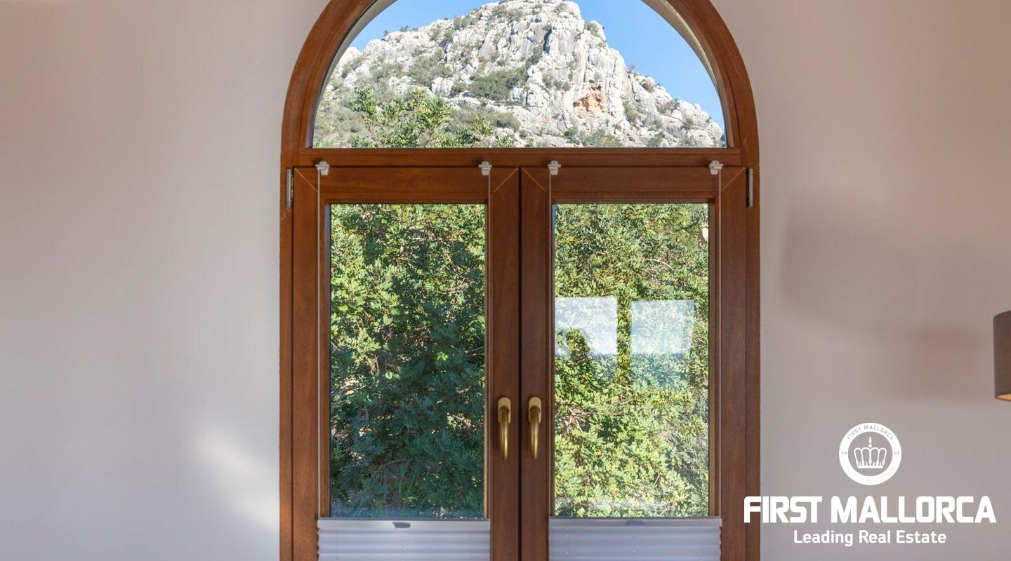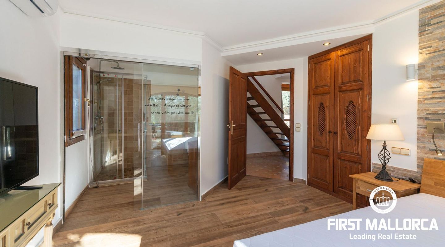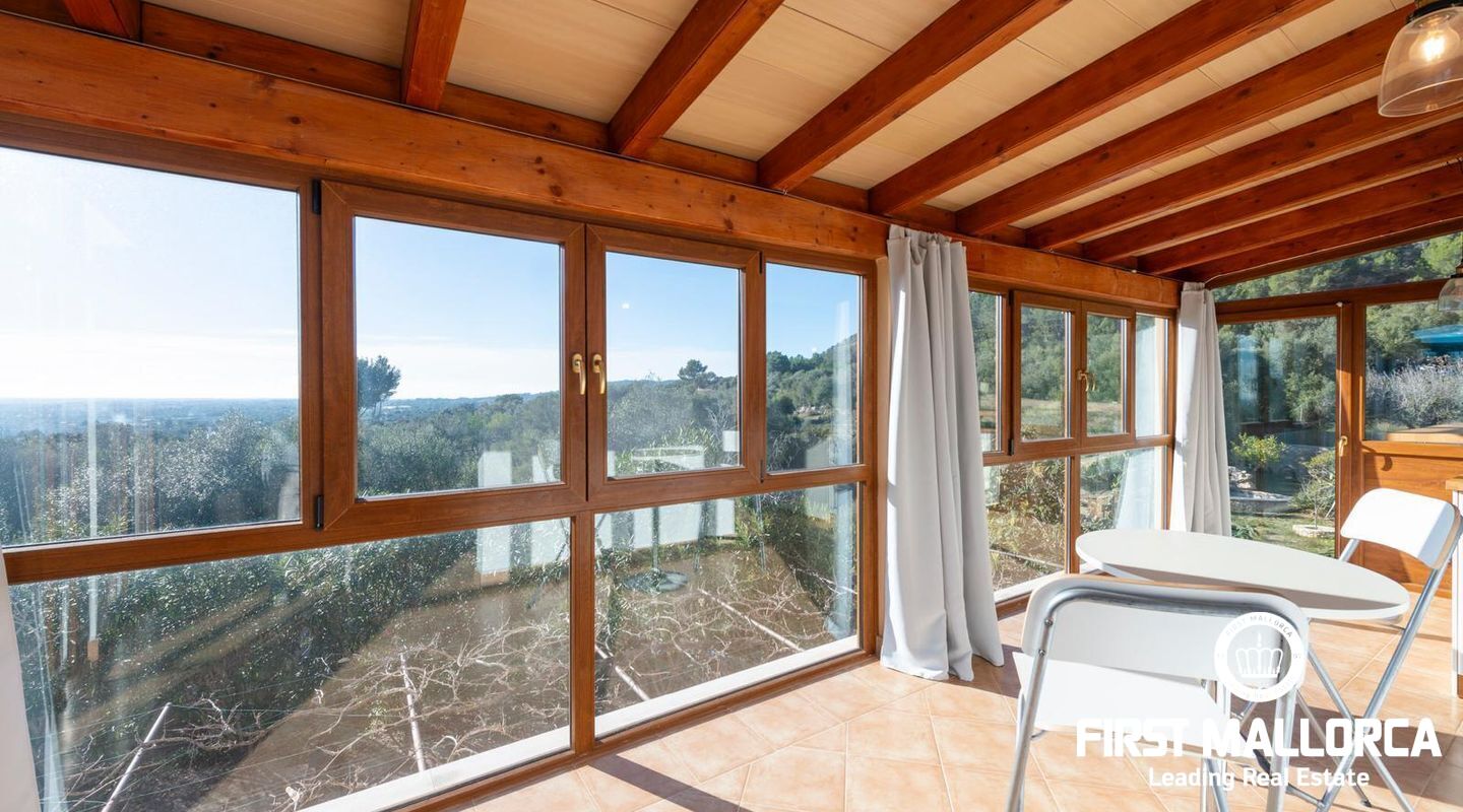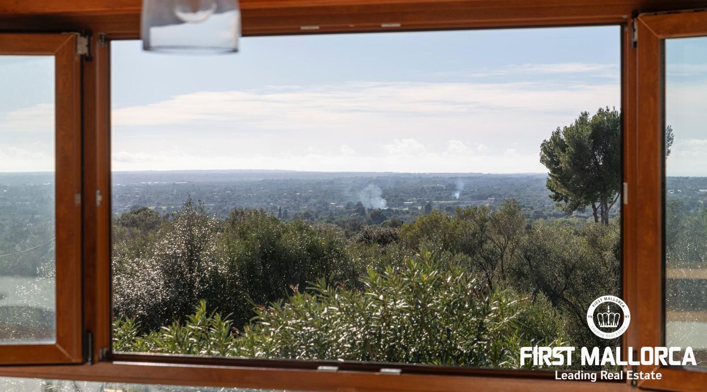 La zona exterior, cuidadosamente diseñada, es un verdadero oasis. La amplia terraza invita a relajarse mientras se disfrutan de vistas panorámicas que se extienden hasta la ciudad de Palma y el imponente Puig de ses Bruixes.