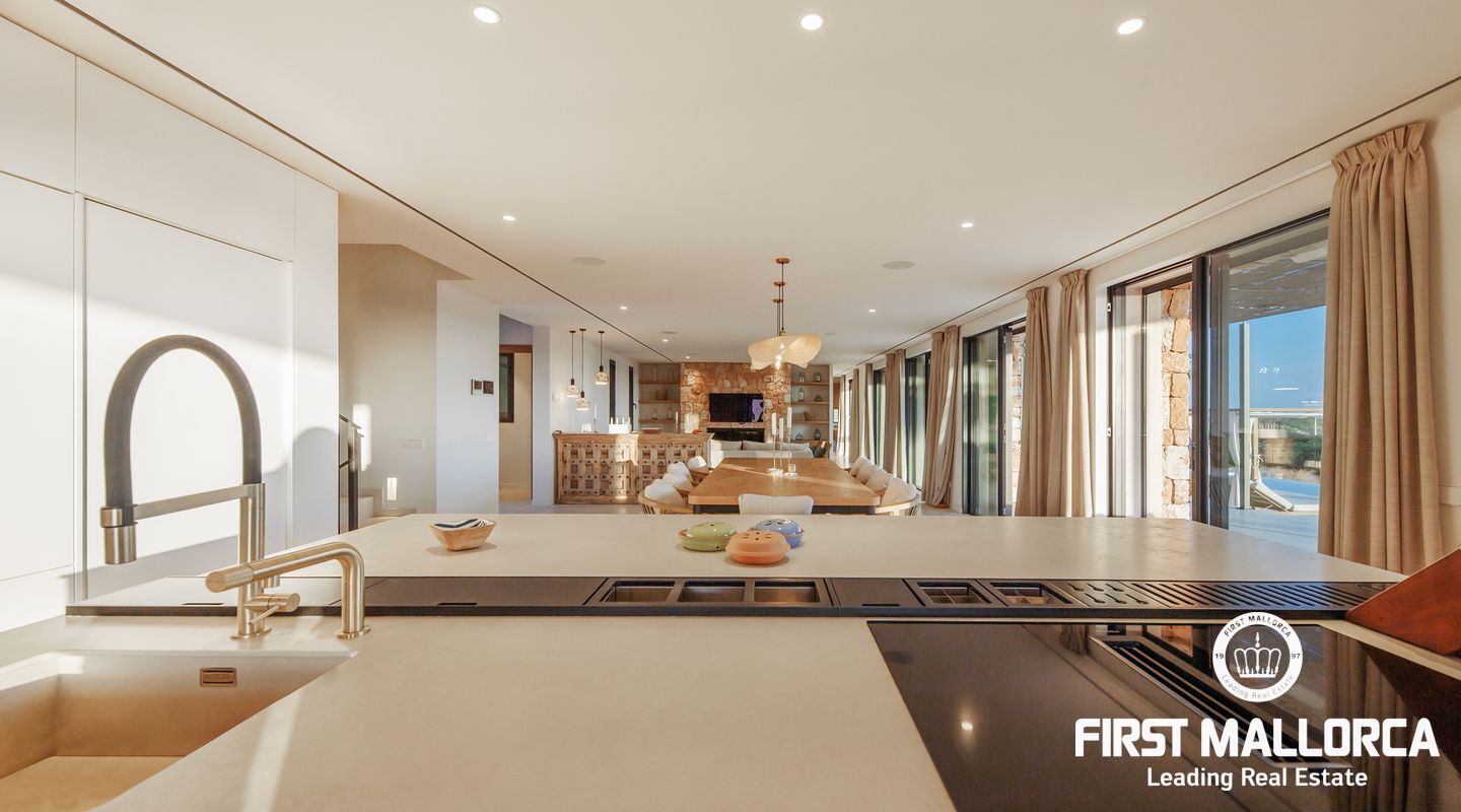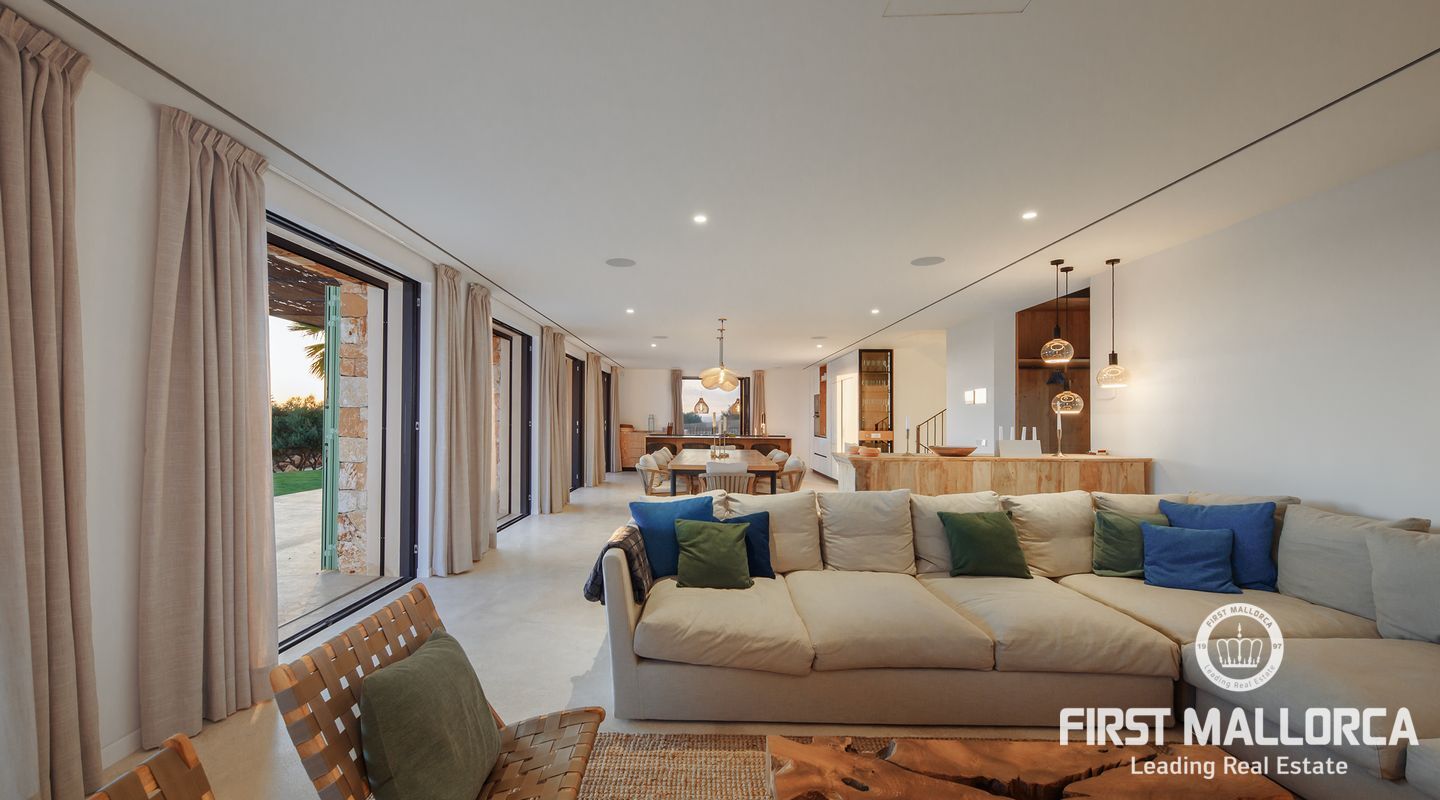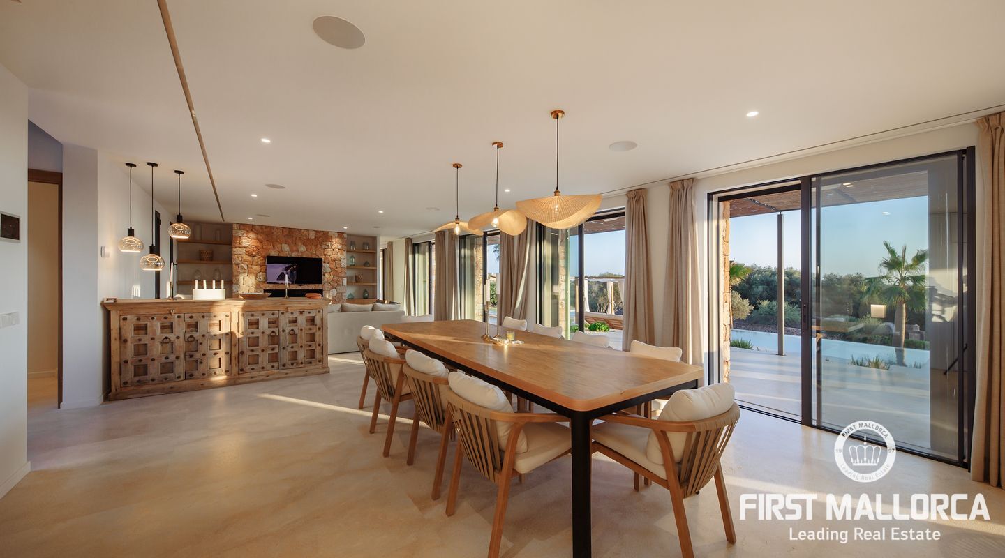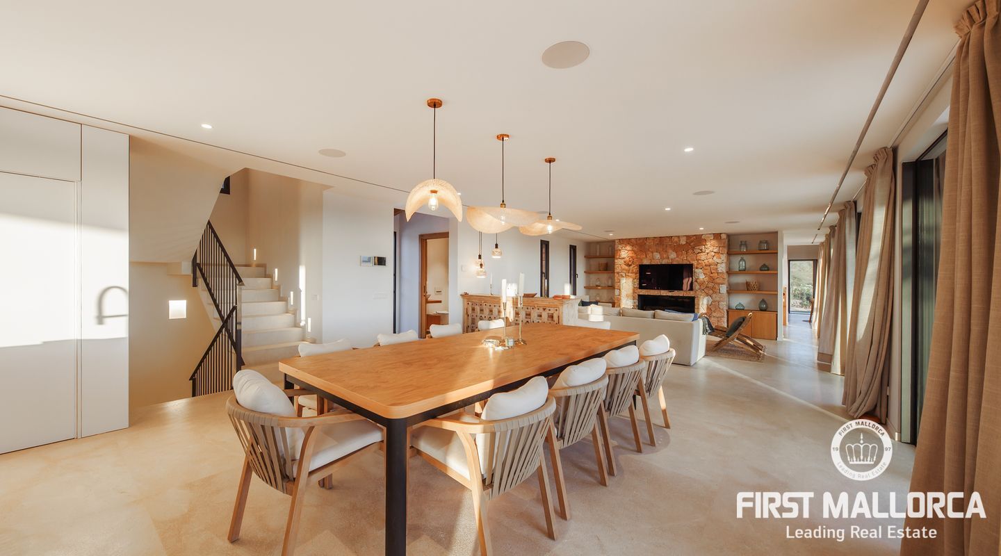 En Ses Salines se alza esta espectacular villa de nueva construcción sobre una amplia parcela de 14.090 m². Con 543 m² de elegantes espacios interiores, la vivienda combina diseño moderno, confort y privacidad. En la planta baja, un gran espacio abierto integra salón, comedor y cocina, junto con lavandería, dos porches cubiertos y un aseo de cortesía.