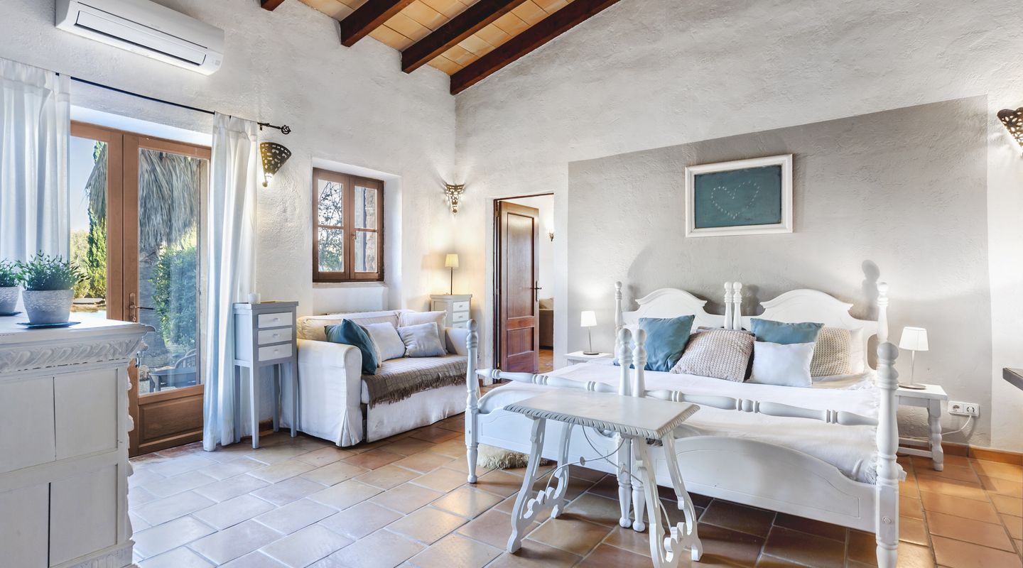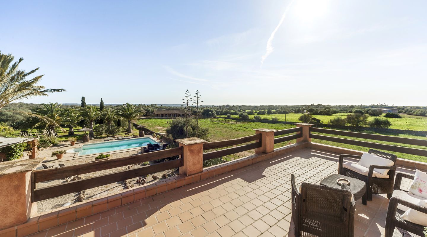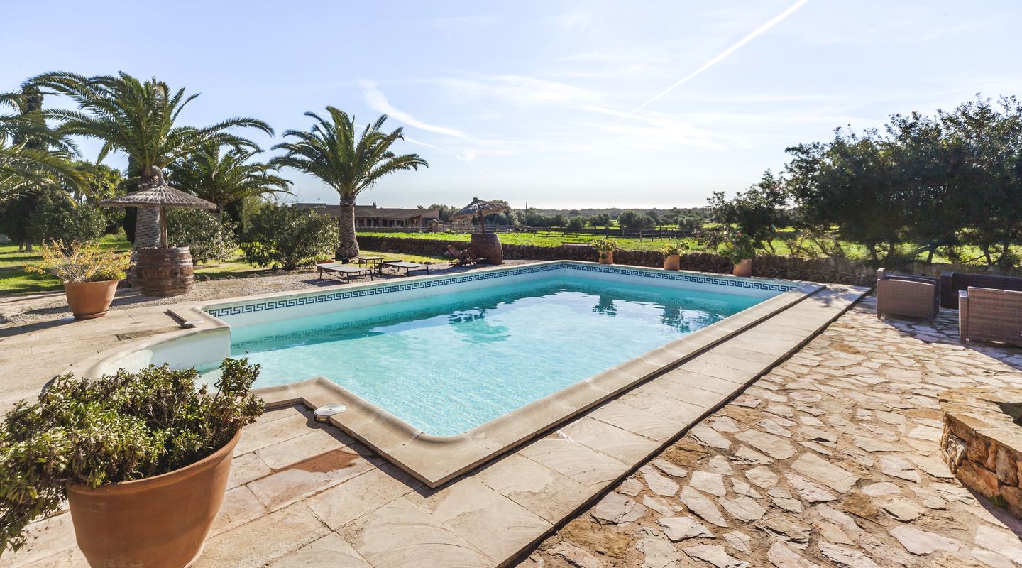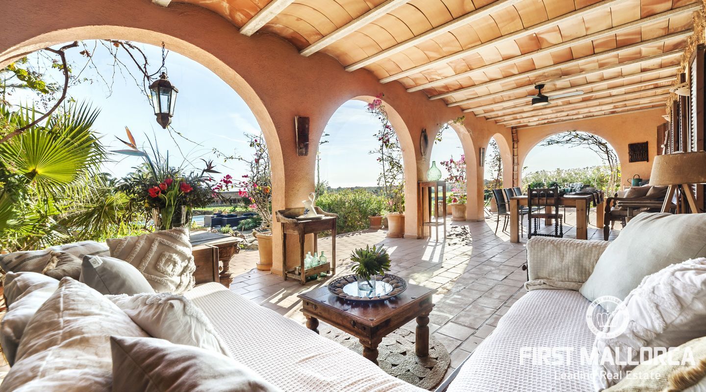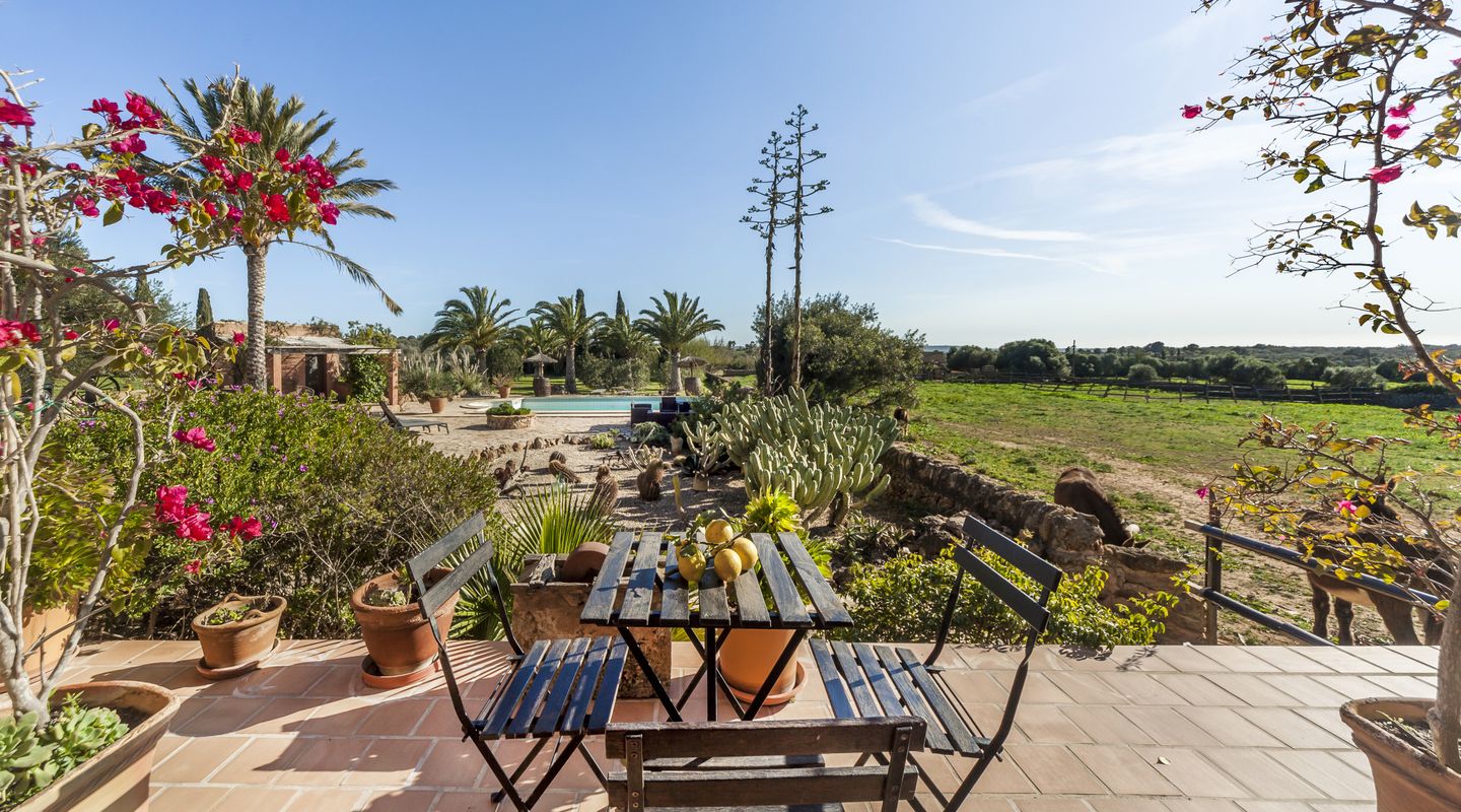 En el exterior, la finca invita a la relajación con una gran terraza y piscina privada, ideal para disfrutar del sol mallorquín. Impresionantes vistas panorámicas al paisaje rural mallorquín ofrecen una sensación constante de paz y conexión con la naturaleza. Además, el exuberante jardín mediterráneo, decorado con palmeras, buganvillas, cactus y adelfas, aporta color y frescura al entorno. Para los amantes de los animales, la propiedad dispone de una zona ecuestre con establos y la compañía de diversos animales que refuerzan su atmósfera auténticamente rural.
