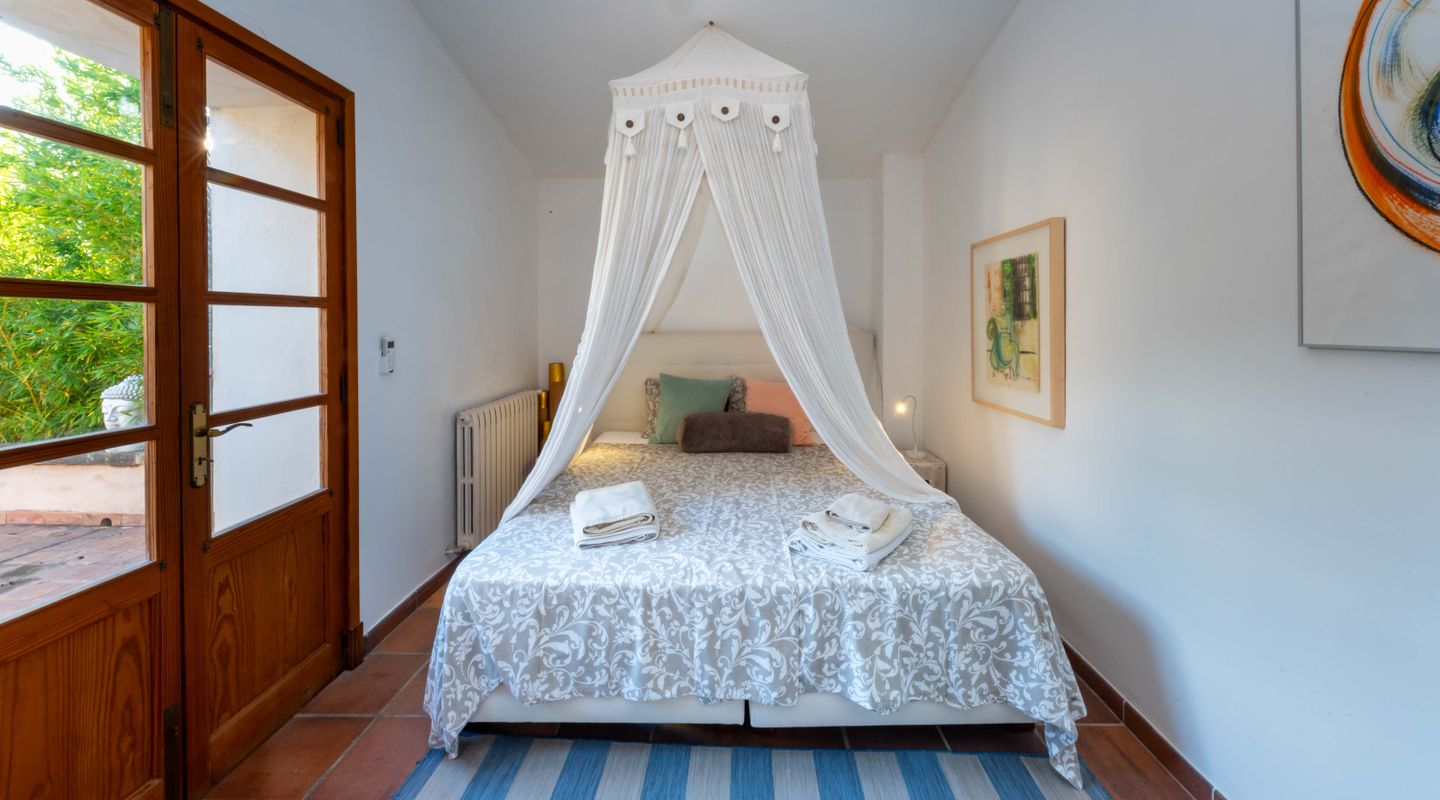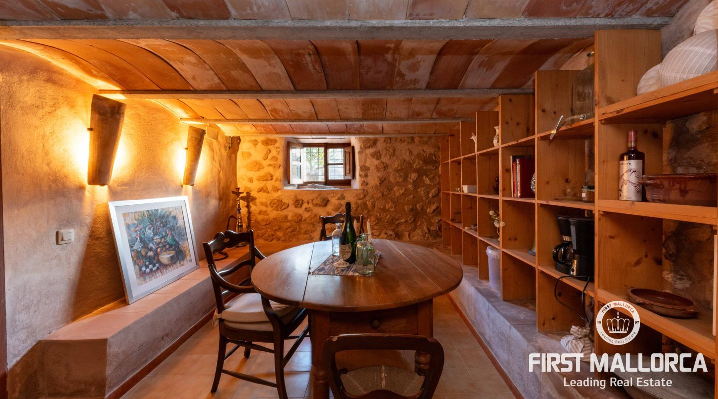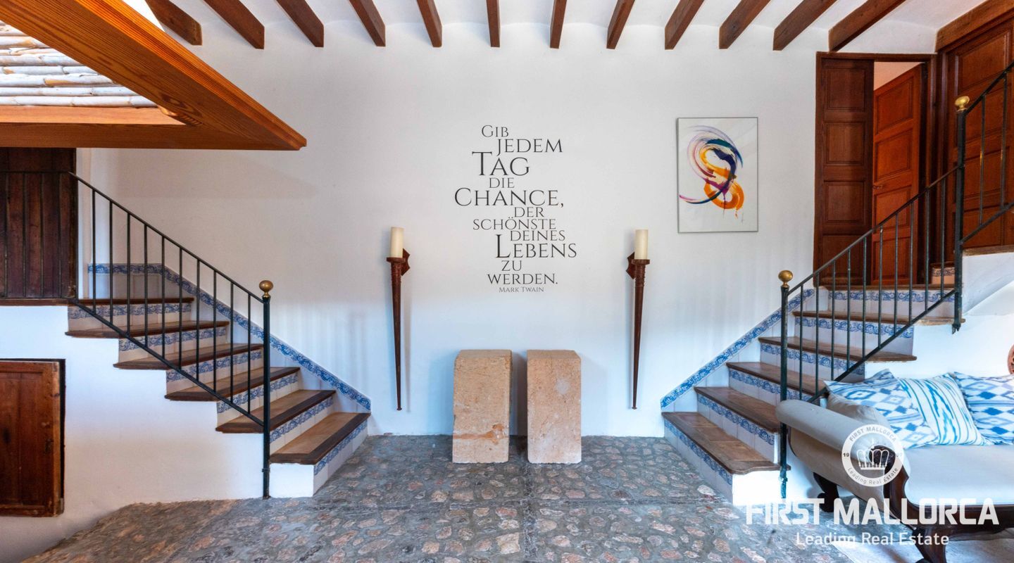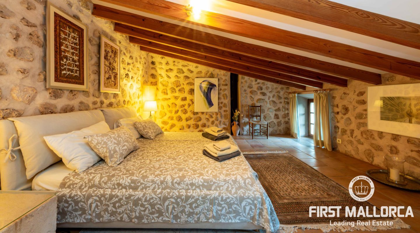 La finca combina tradición y confort con elegancia: cinco dormitorios dobles, algunos con baño en suite y acceso a terrazas privadas, un luminoso salón de estilo invernadero y un gran comedor, junto a una cocina moderna que se abre a amplias zonas exteriores. La piscina, los espacios chill-out, los jardines, los árboles frutales y la fuente crean un entorno perfecto para relajarse y disfrutar del auténtico estilo de vida mallorquín.