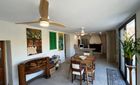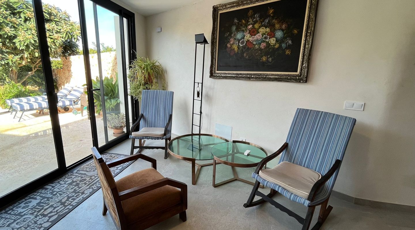 El exterior de la propiedad es un auténtico oasis: un jardín cuidado con naranjos y limoneros, creando un ambiente fresco y aromático, junto con una piscina privada donde disfrutar del sol y la tranquilidad de la zona. Este espacio invita a pasar largas jornadas al aire libre, organizar comidas, reuniones o simplemente disfrutar del entorno natural.
