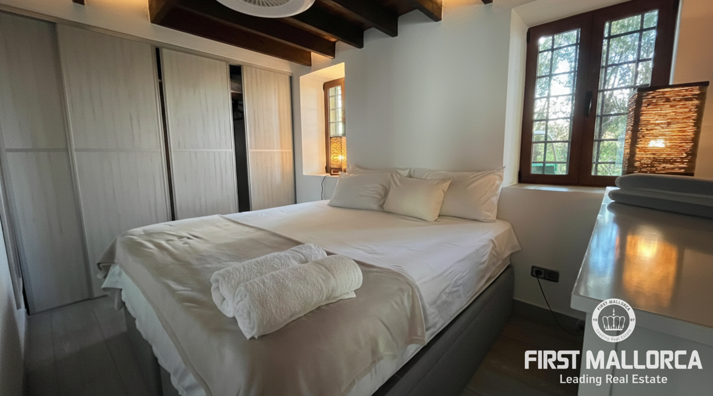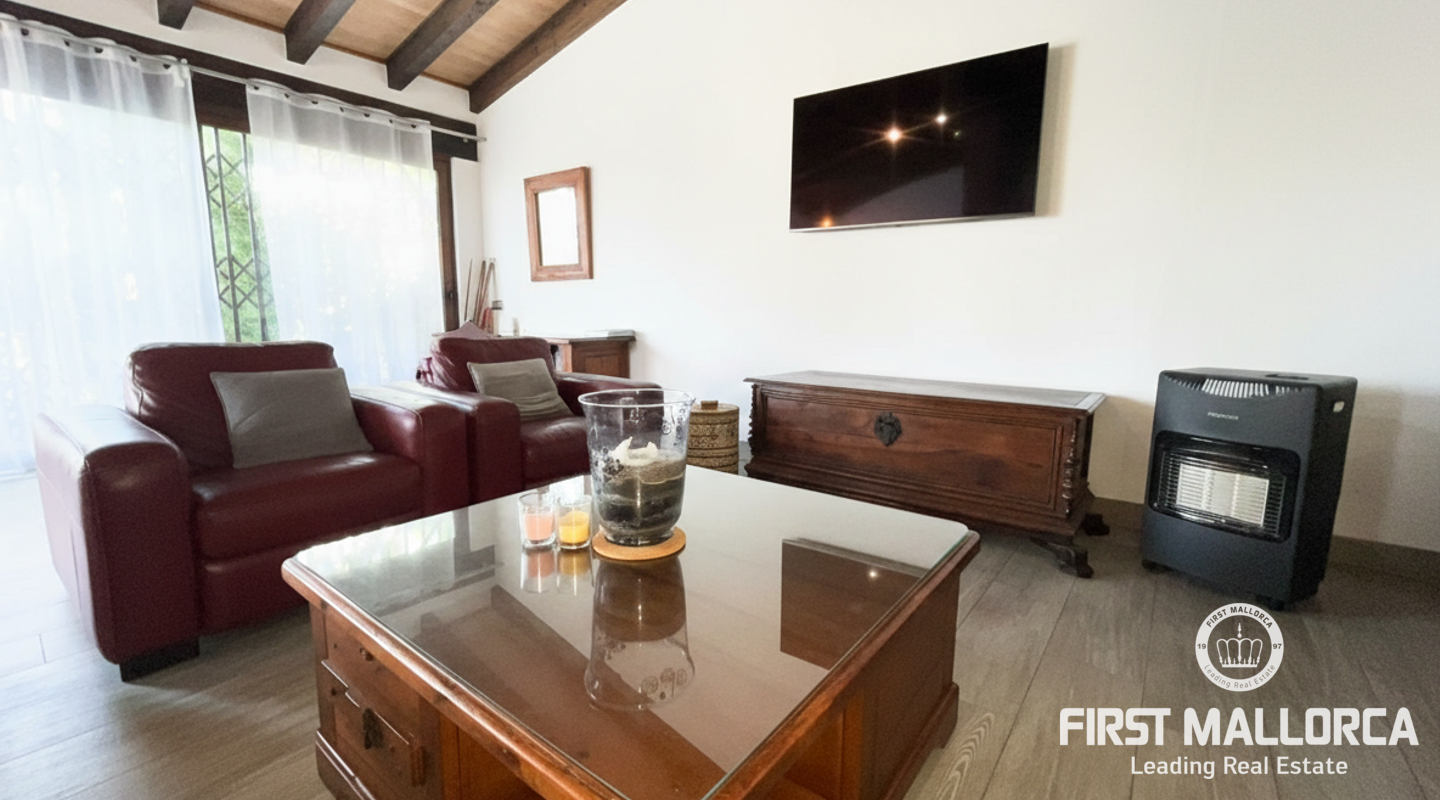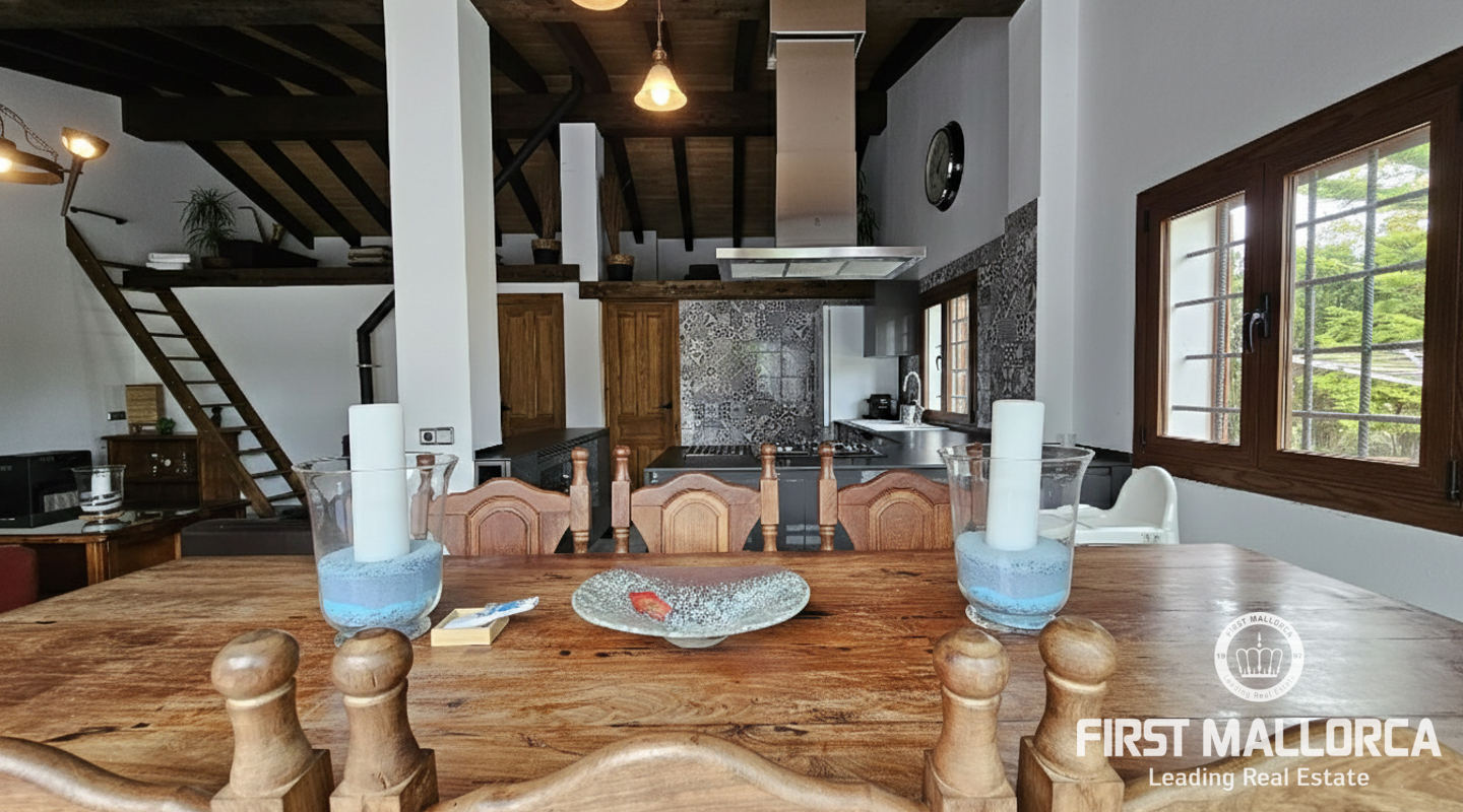 El interior ofrece un ambiente cálido y luminoso gracias a su cocina abierta al comedor, ideal para disfrutar de comidas con familia o amigos, y a la chimenea, que aporta un toque acogedor durante las noches. Desde el salón se accede al jardín y la piscina privada, el lugar perfecto para disfrutar del sol mallorquín y relajarse durante unas vacaciones inolvidables.