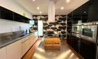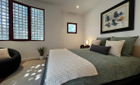 Planta baja: recibidor, salón principal, cocina moderna con isla, dos habitaciones, baños en suite, lavandería y baño de cortesía.