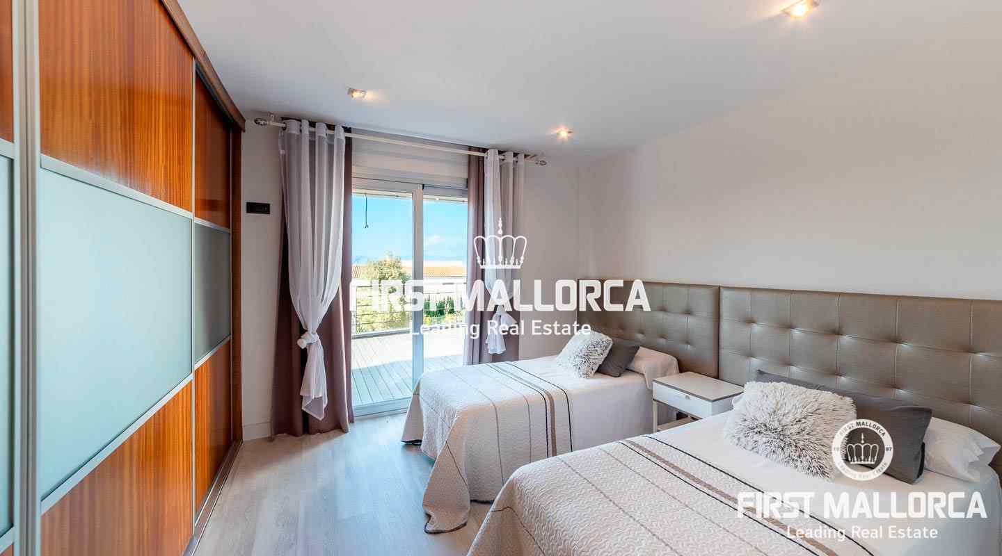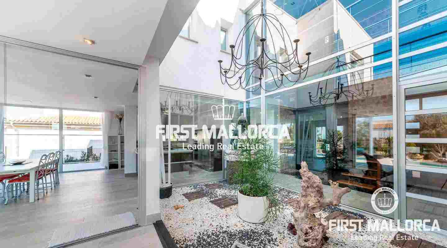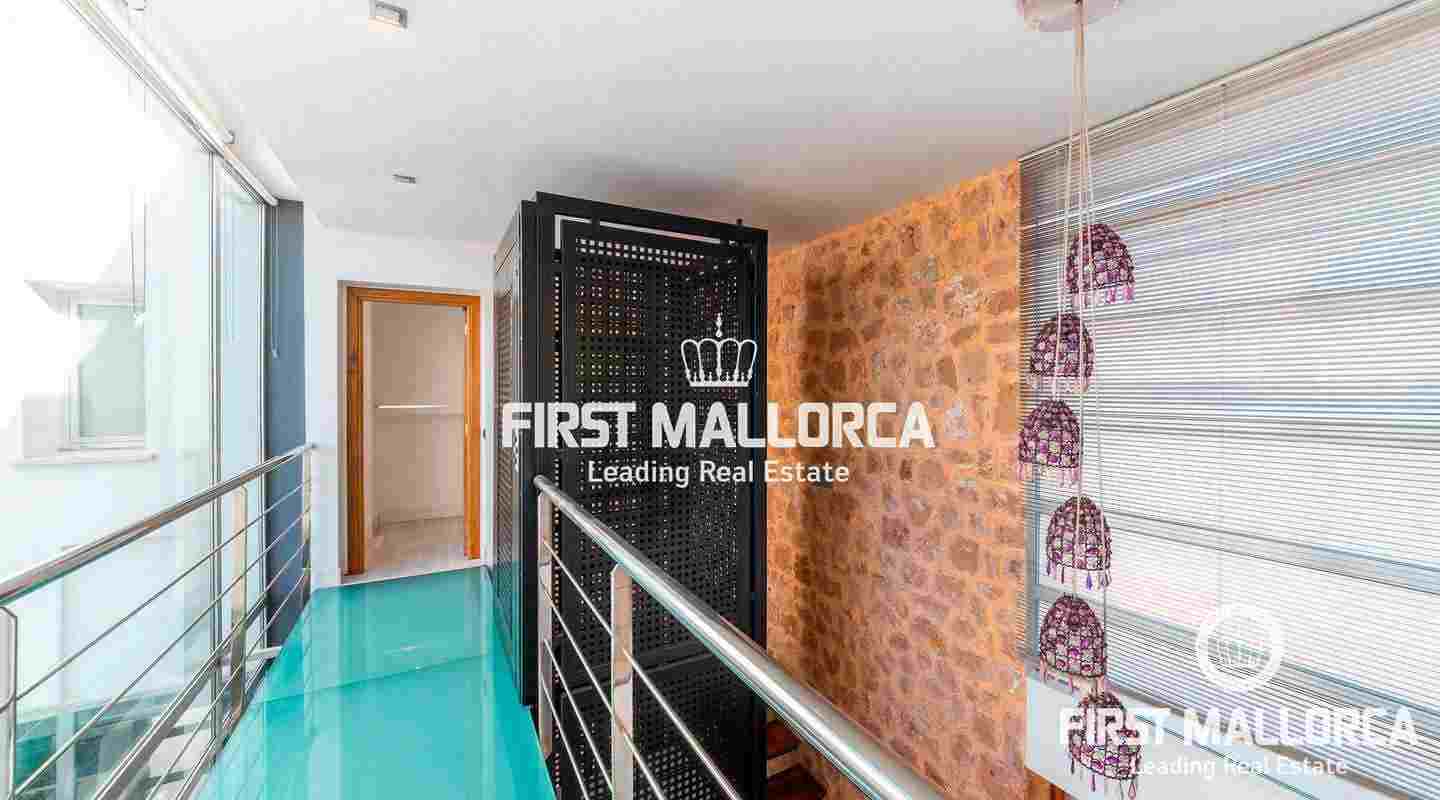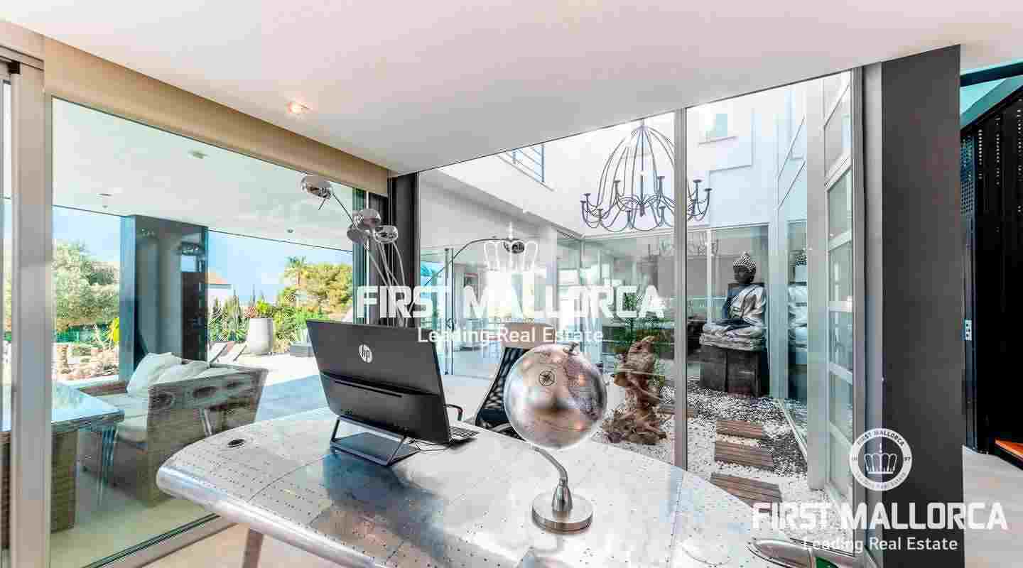 La planta baja consta de un salón abierto, separado del comedor y de la cocina americana por un patio acristalado. Además hay un dormitorio y un baño. La planta superior cuenta con el dormitorio principal con baño en suite y vestidor, otros 2 dormitorios y un baño. Todas las habitaciones tienen acceso a la terraza, que ofrece hermosas vistas panorámicas hasta la bahía de Palma.