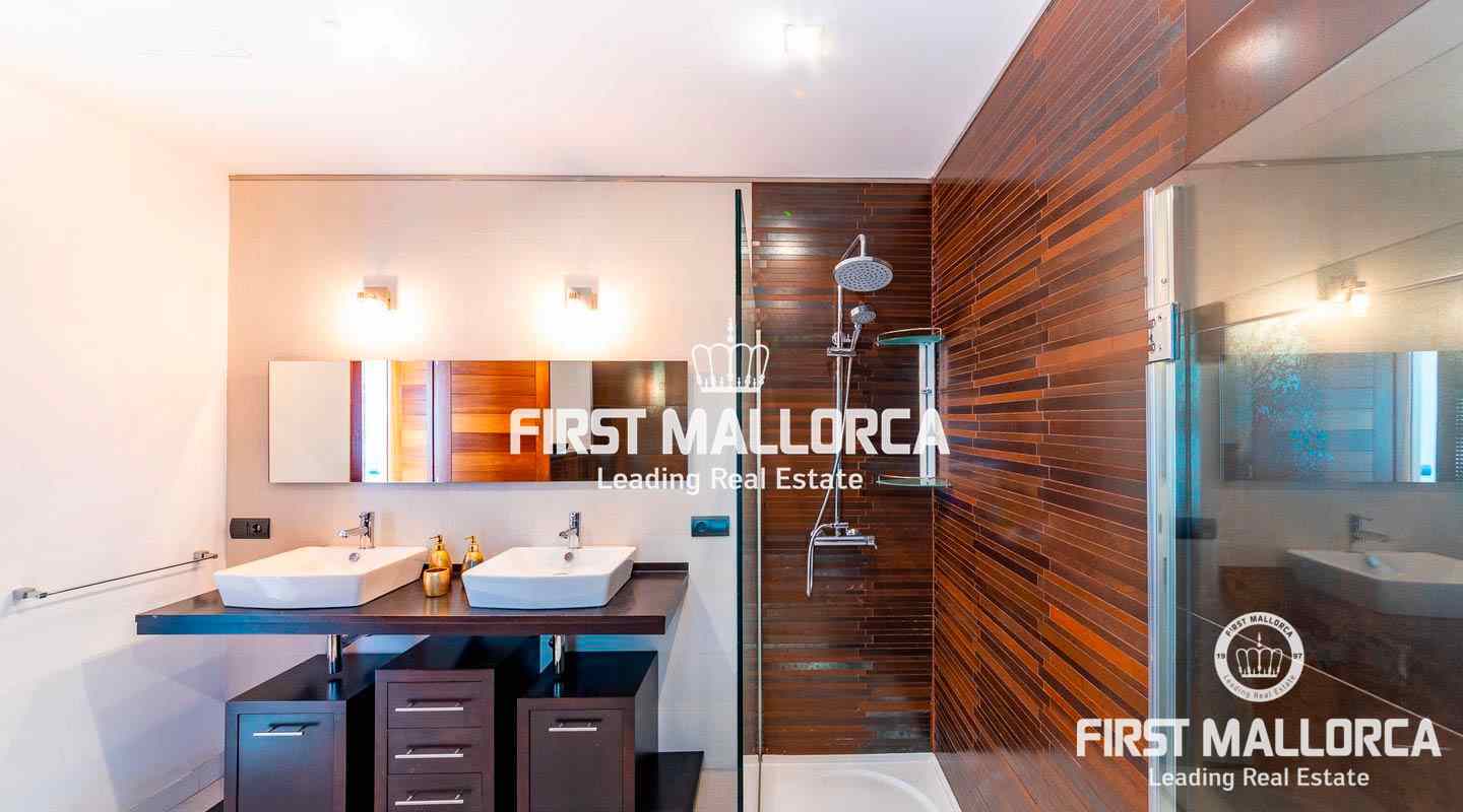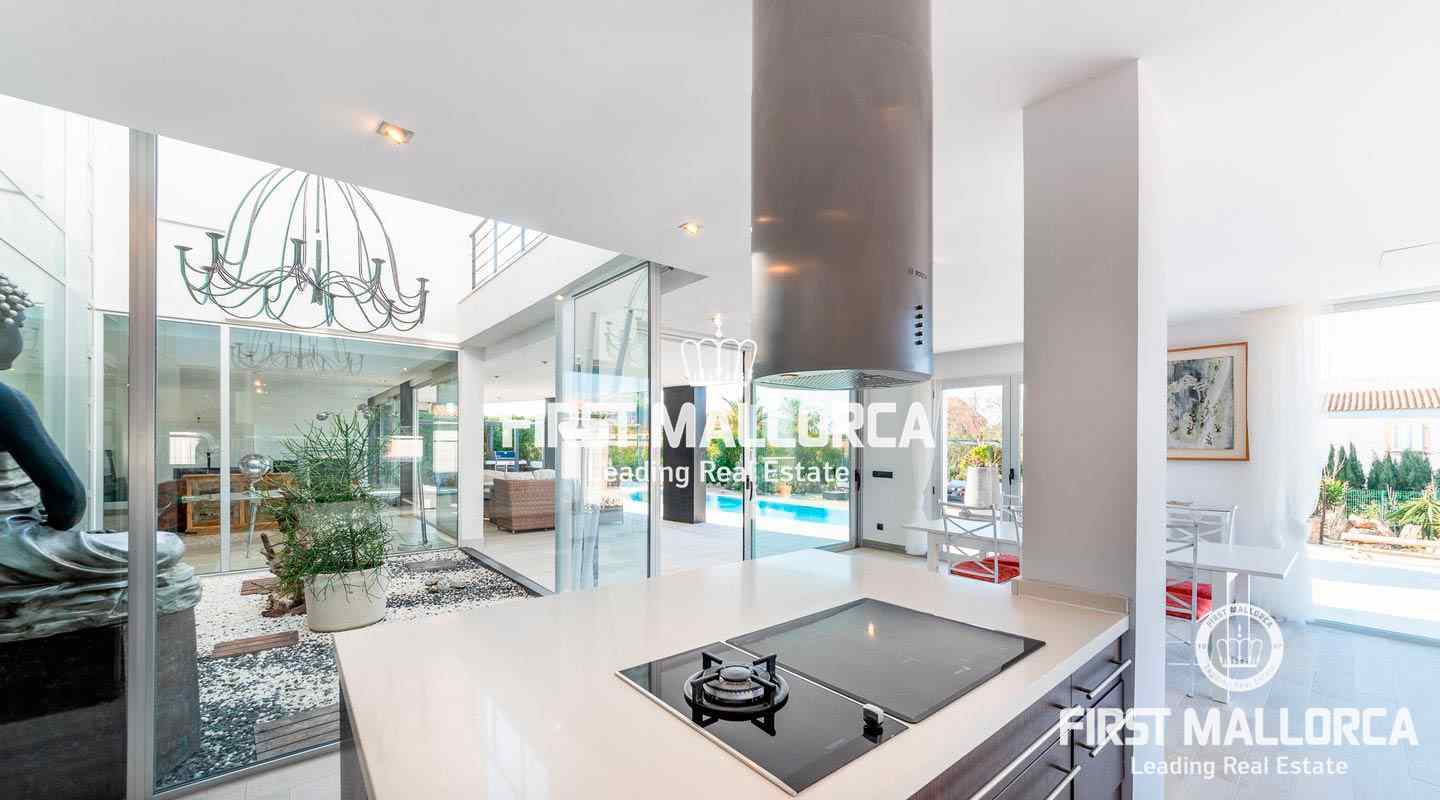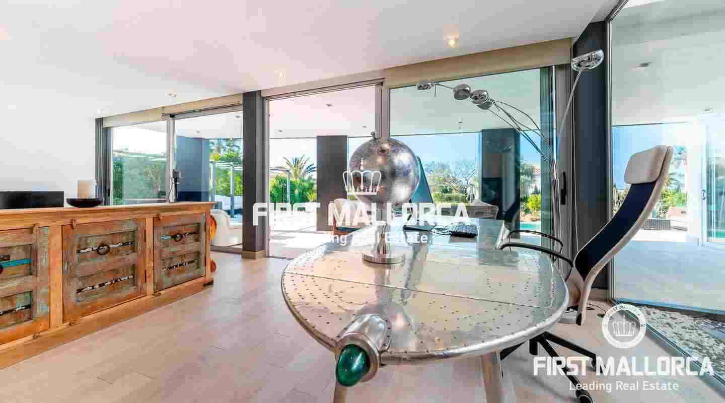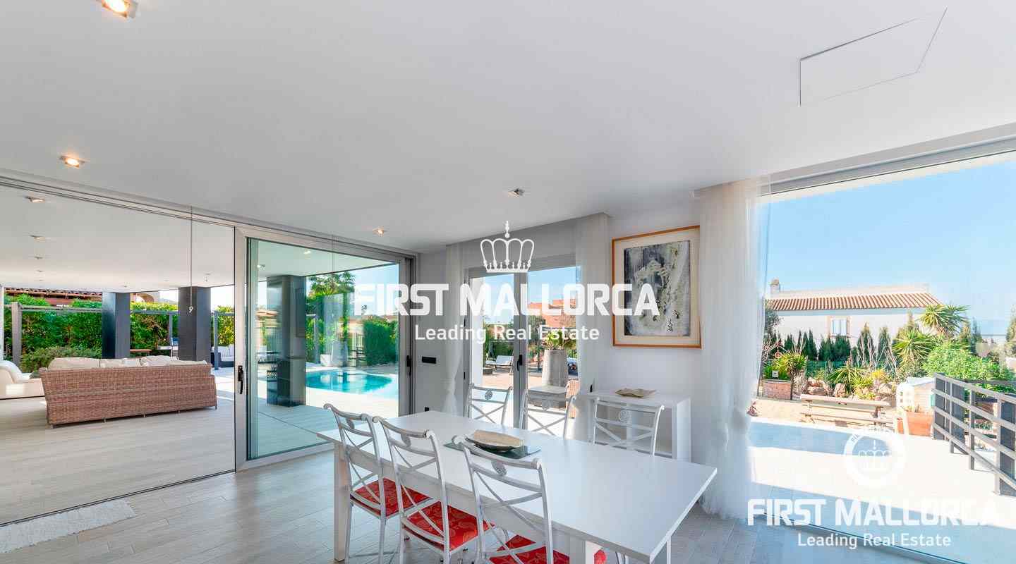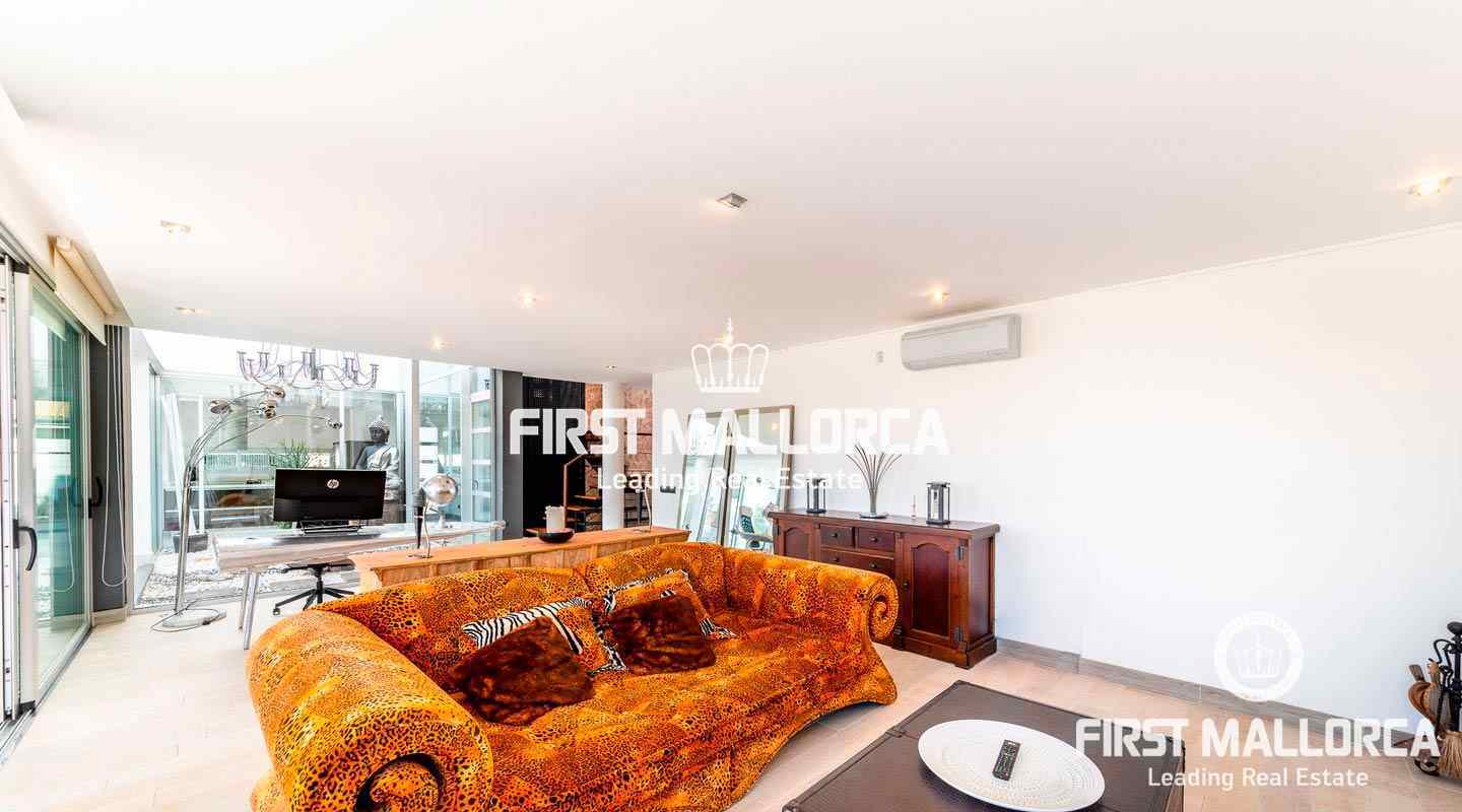 La planta baja consta de un salón abierto, separado del comedor y de la cocina americana por un patio acristalado. Además hay un dormitorio y un baño. La planta superior cuenta con el dormitorio principal con baño en suite y vestidor, otros 2 dormitorios y un baño. Todas las habitaciones tienen acceso a la terraza, que ofrece hermosas vistas panorámicas hasta la bahía de Palma.
