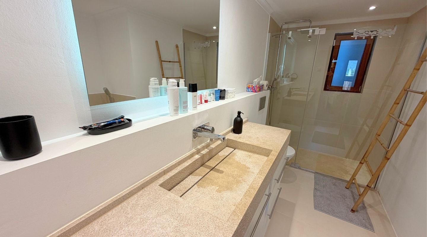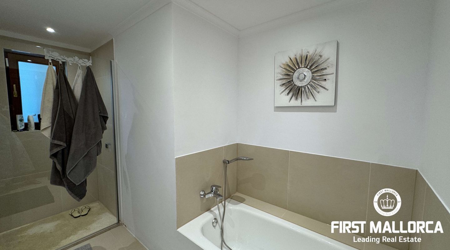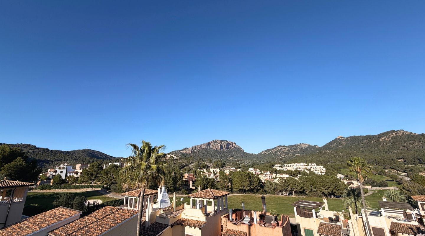 La sala de estar y comedor de planta abierta está en el primer piso. Esto tiene una cocina moderna equipada con una isla de cocina. Este nivel es muy luminoso a través de los ventanales altos y grandes y tiene una vista maravillosa sobre el campo de golf y hasta la Sierra de Tramuntana. También hay acceso a la azotea, desde la que se tiene una maravillosa vista panorámica sobre los tejados de Camp de Mar, el campo de golf y el mar. Una cocina al aire libre le invita a disfrutar del estilo de vida mediterráneo al aire libre. En la planta baja hay 2 dormitorios, cada uno con su propio baño y una terraza adicional. El área de la piscina privada, rodeada de vegetación, se encuentra frente a la casa y ofrece suficiente espacio para tumbonas o una sala de estar.