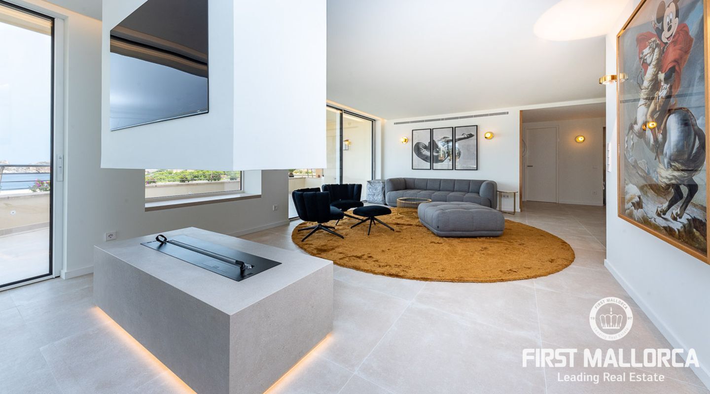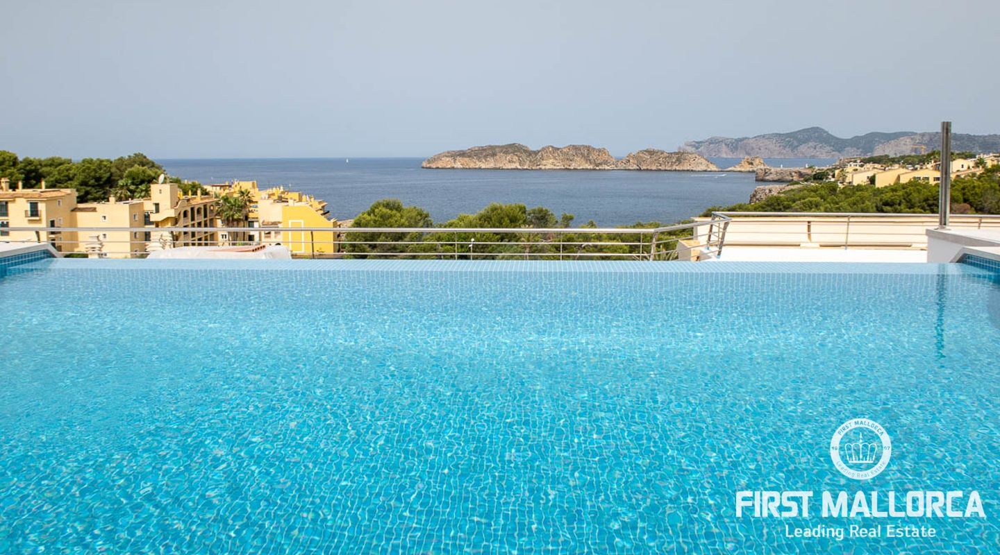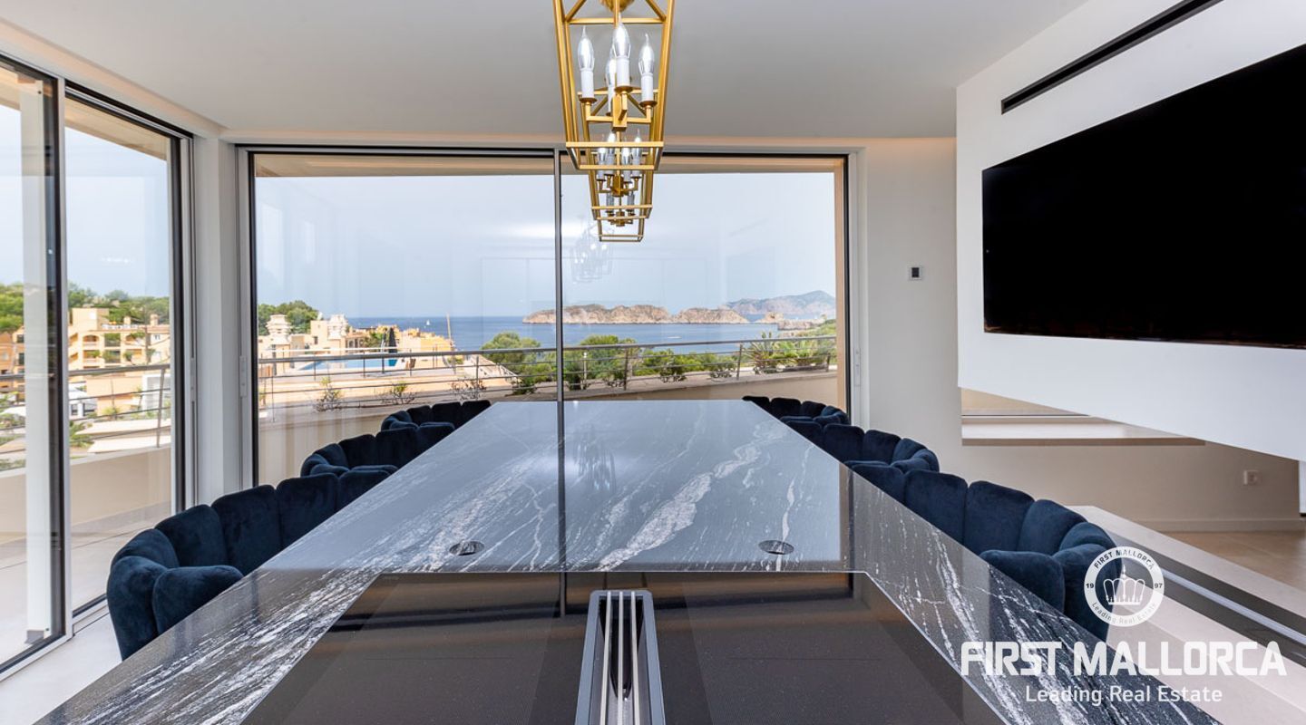 Este ático de alta calidad, llave en mano, idealmente situado en una comunidad cerrada, ofrece fantásticas vistas panorámicas de 180 grados sobre las islas Malgrat y el mar Mediterráneo. El salón-comedor abierto tiene una gran terraza cubierta, perfecta para comer al aire libre durante todo el año. La cocina abierta de alta calidad tiene una terraza adyacente orientada al este y está equipada con electrodomésticos de alta gama. La cocina abierta sólo está dividida por una parte de una chimenea de bioetanol abierta. La distribución de 157m2 consta de un total de tres dormitorios y dos baños. La suite principal con vistas al mar ofrece un vestidor y un amplio y moderno cuarto de baño. Un punto culminante especial de la propiedad es la gran terraza en la azotea de 144 m2 con una piscina privada de 30m2, una cocina de verano, zona de comedor y una zona chill out con chimenea. Hay dos plazas de aparcamiento subterráneo, que vienen con la propiedad. Calefacción por suelo radiante, aire acondicionado, lavadero independiente, totalmente amueblado.