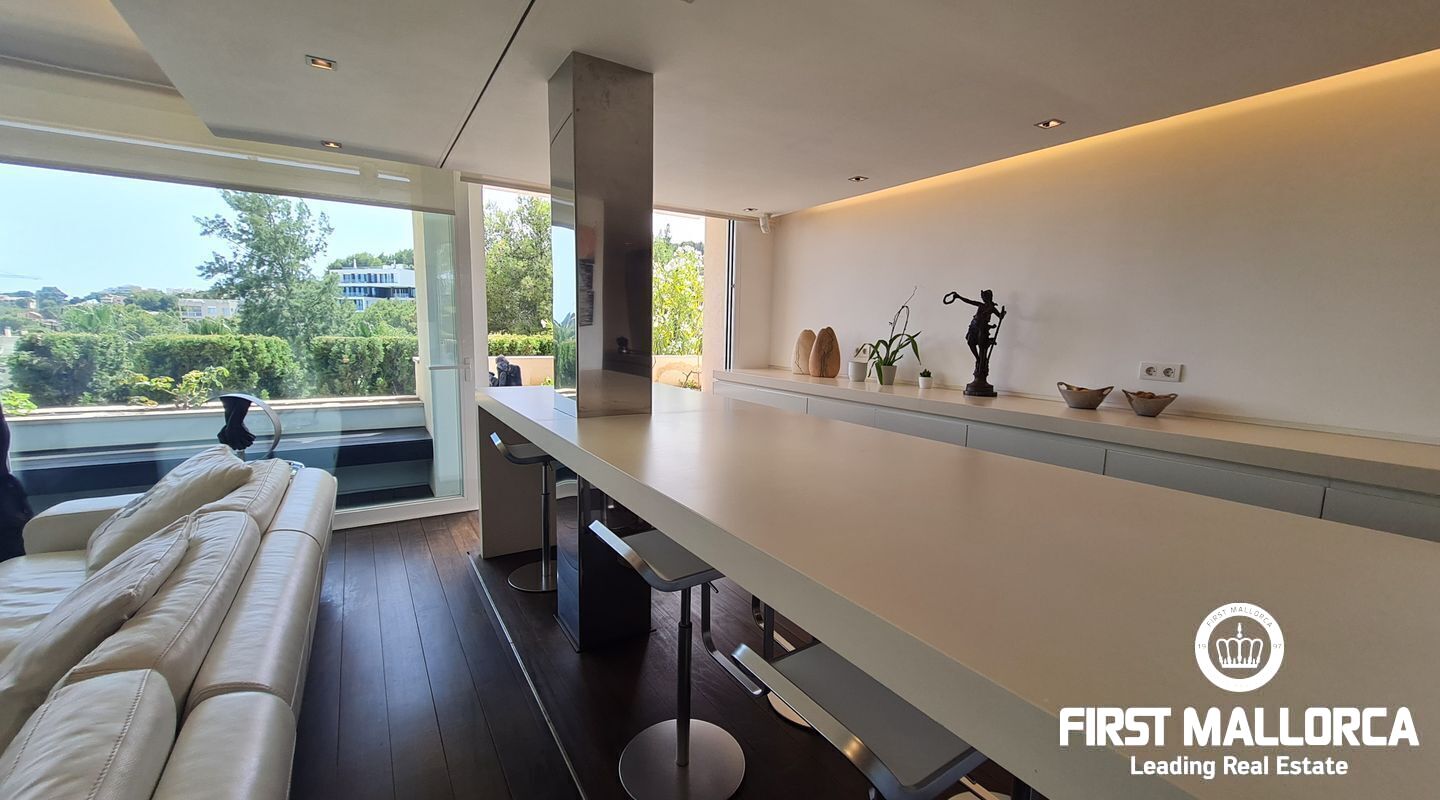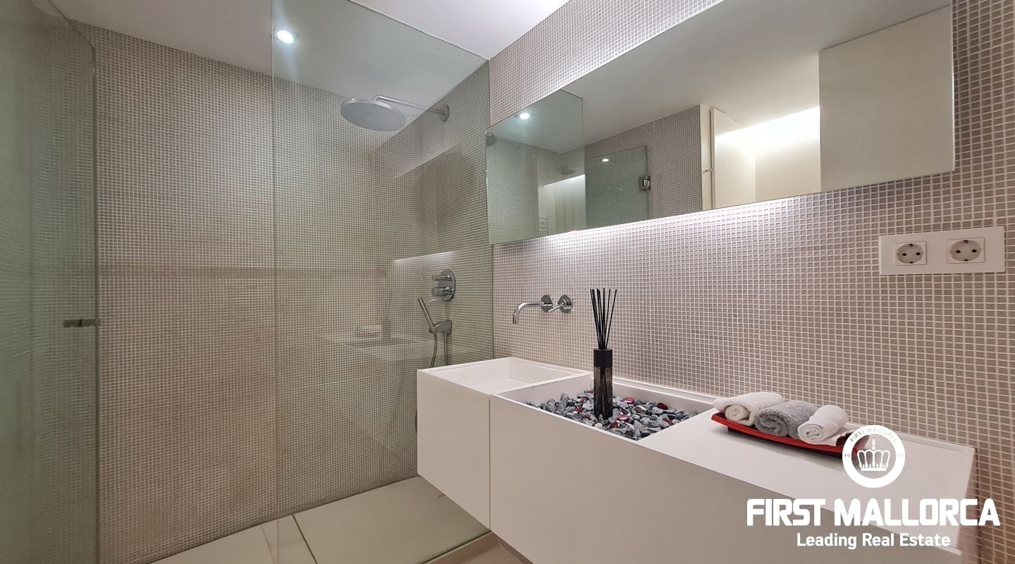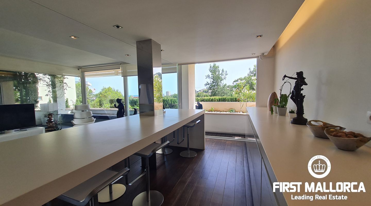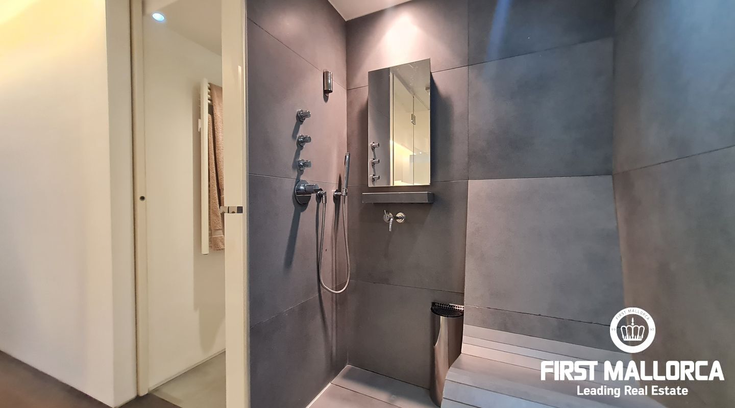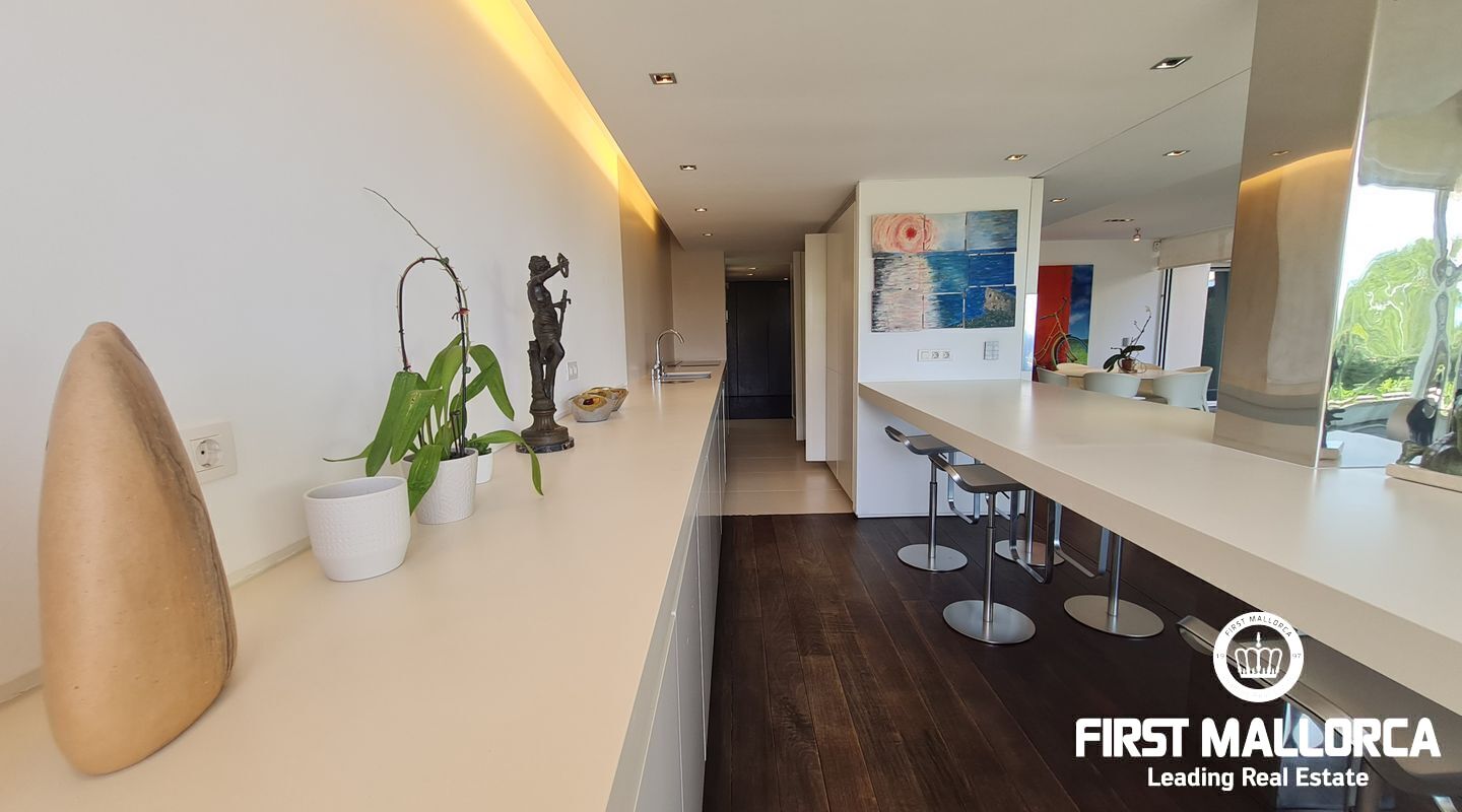 Este apartamento muy singular goza de un ambiente maravilloso y vistas parciales al mar a través de las verdes vistas de Cas Catala. El interior de diseño invita a relajarse y descansar en un oasis privado dentro de una comunidad muy pequeña con piscina y ascensor a todos los niveles. La propiedad fue reformada hace varios años y está en excelentes condiciones con la siguiente distribución que comprende un luminoso salón con zona de comedor y grandes puertas de cristal que dan a la terraza. La cocina moderna tiene un lavadero adyacente con mucho almacenaje y además hay 2 dormitorios y 2 baños, el principal es una habitación muy generosa con dos vestidores, un baño lujoso con sensación de spa, una ducha sauna turca, una bañera grande y vistas a la terraza.