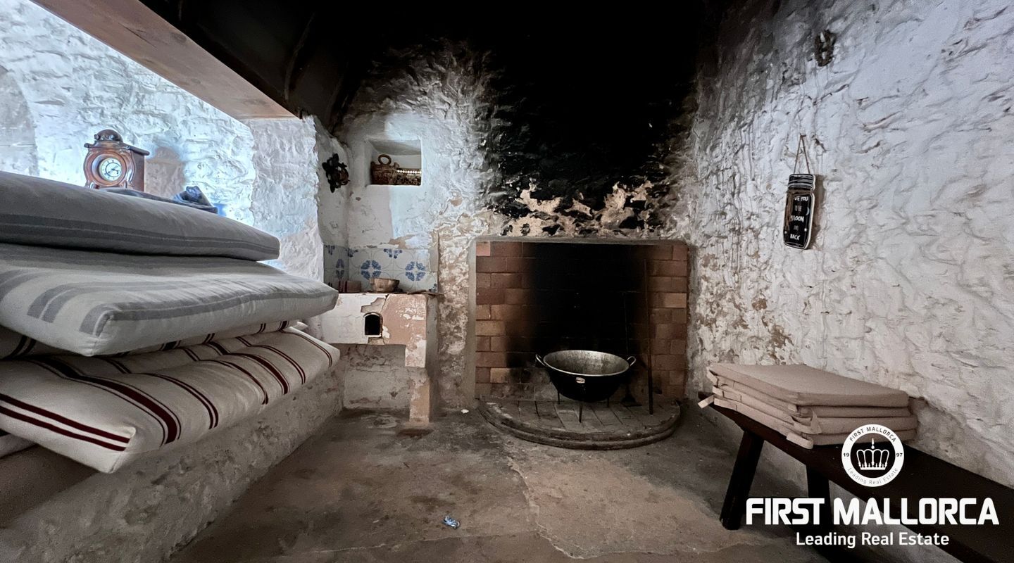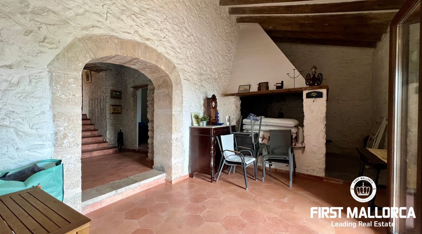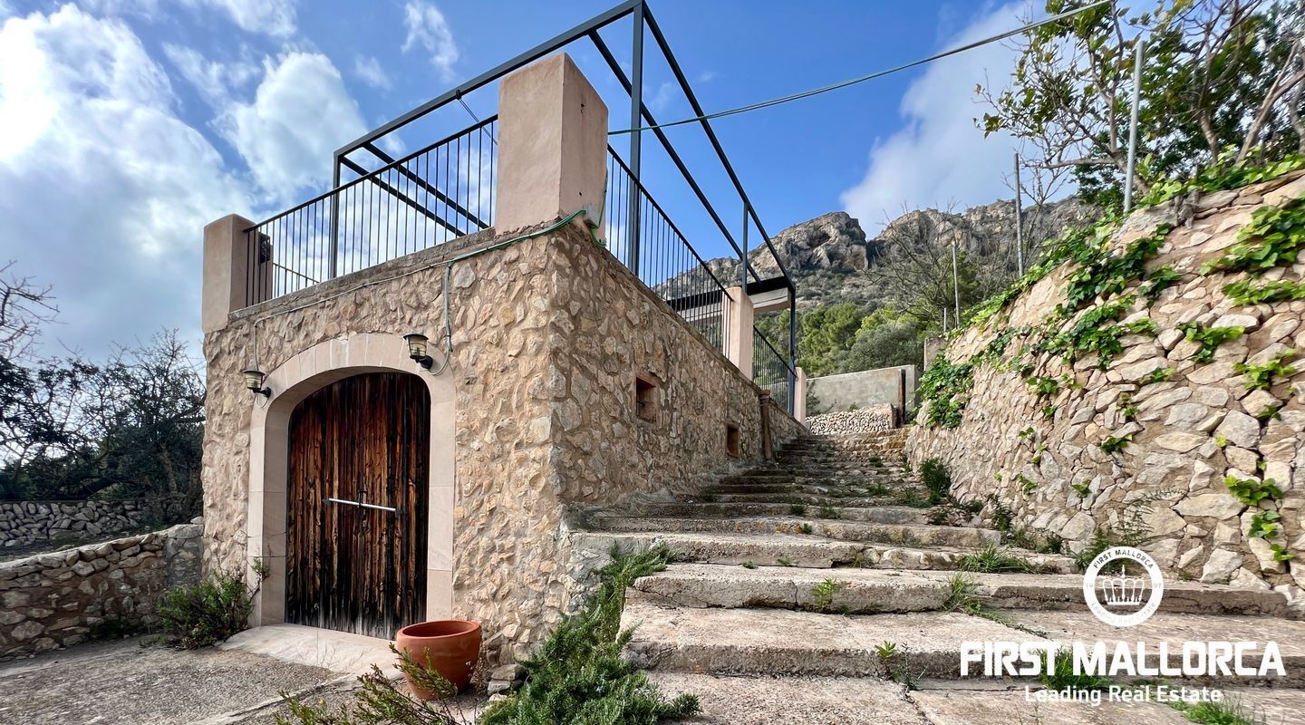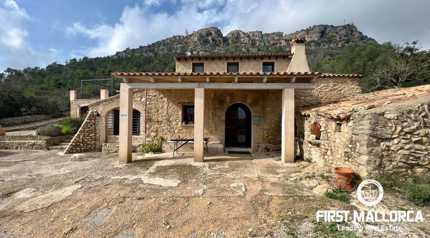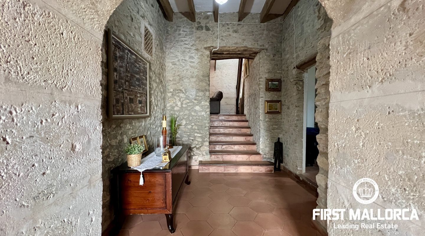 Ubicada al pie del Puig de Randa, la finca está rodeada de naturaleza y ofrece vistas panorámicas de las montañas. El terreno de 23.000 m² incluye una casa de 200 m² distribuida en dos plantas. La vivienda cuenta con un amplio vestíbulo, un salón con chimenea, una sala de lectura separada, tres dormitorios, un baño y una cocina equipada. Las paredes de piedra tradicionales, vigas expuestas y luz natural crean un ambiente cálido y acogedor.