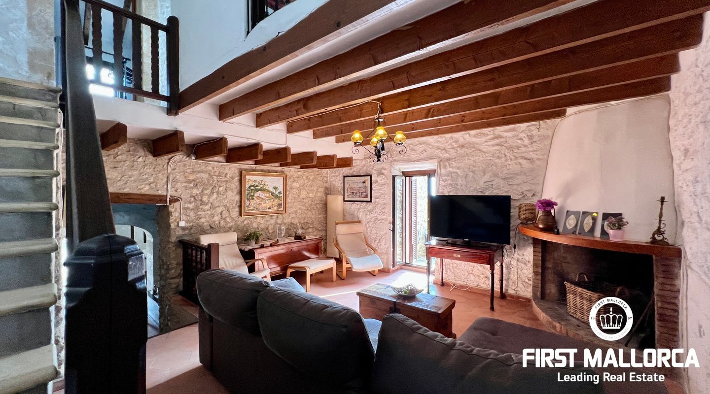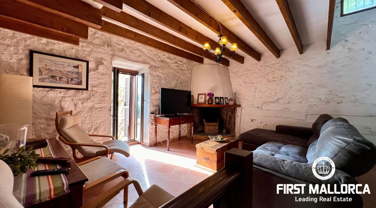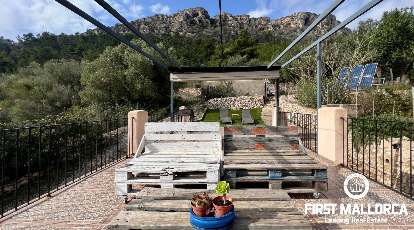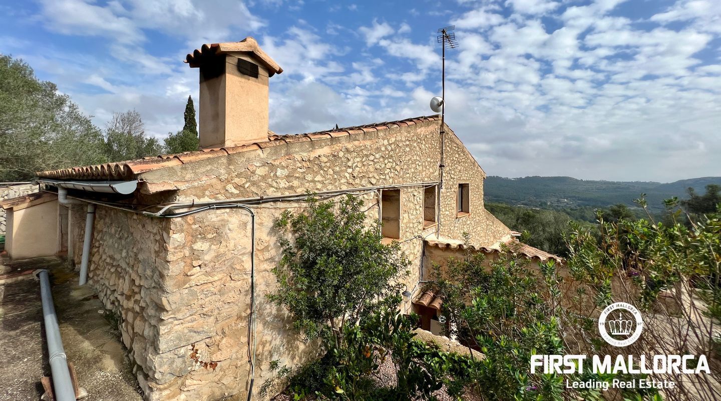 Ubicada al pie del Puig de Randa, la finca está rodeada de naturaleza y ofrece vistas panorámicas de las montañas. El terreno de 23.000 m² incluye una casa de 200 m² distribuida en dos plantas. La vivienda cuenta con un amplio vestíbulo, un salón con chimenea, una sala de lectura separada, tres dormitorios, un baño y una cocina equipada. Las paredes de piedra tradicionales, vigas expuestas y luz natural crean un ambiente cálido y acogedor.