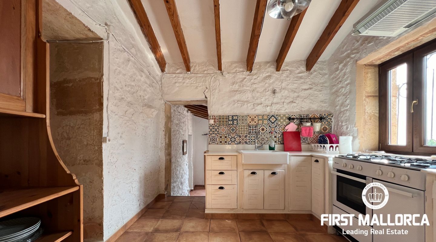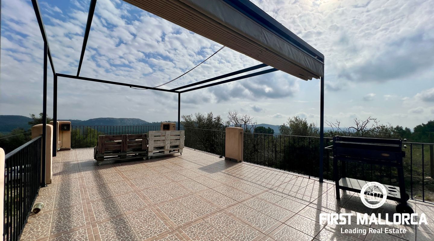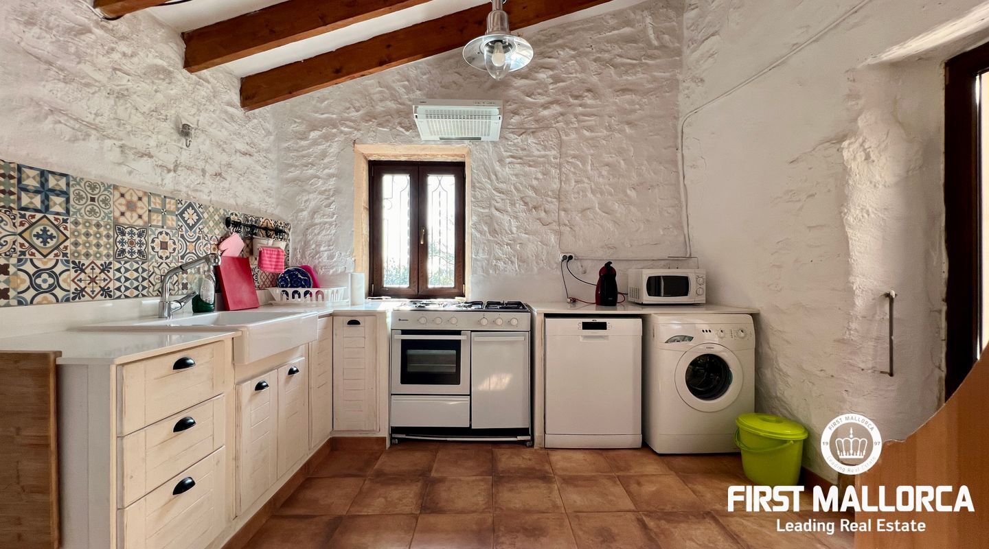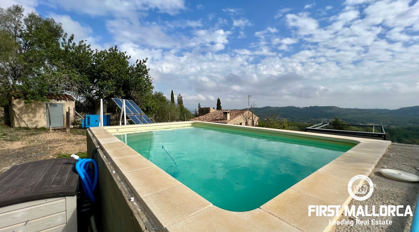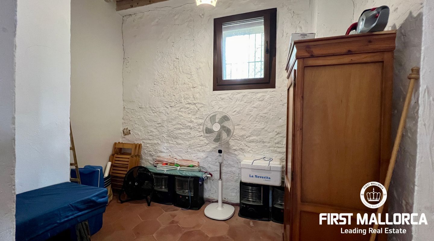 Ubicada al pie del Puig de Randa, la finca está rodeada de naturaleza y ofrece vistas panorámicas de las montañas. El terreno de 23.000 m² incluye una casa de 200 m² distribuida en dos plantas. La vivienda cuenta con un amplio vestíbulo, un salón con chimenea, una sala de lectura separada, tres dormitorios, un baño y una cocina equipada. Las paredes de piedra tradicionales, vigas expuestas y luz natural crean un ambiente cálido y acogedor.