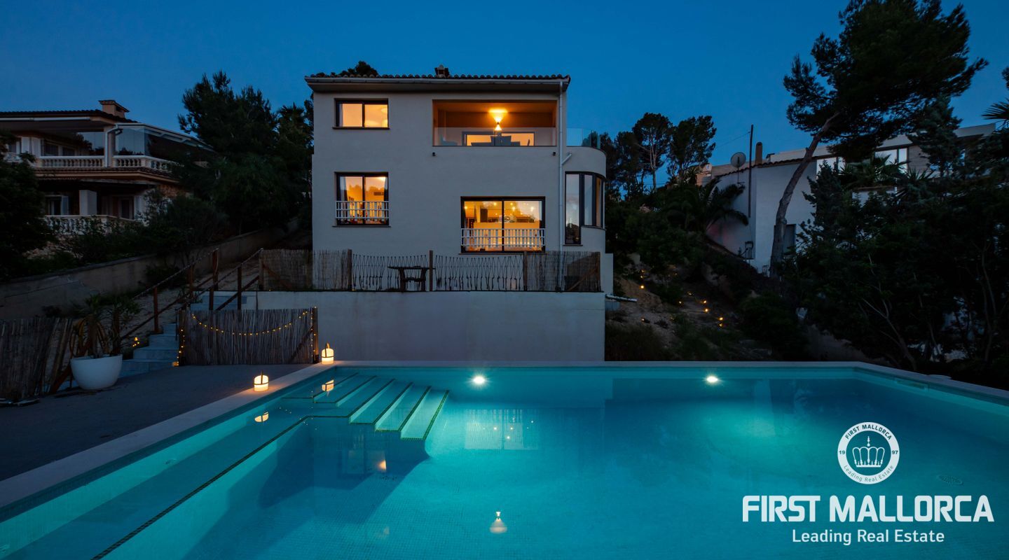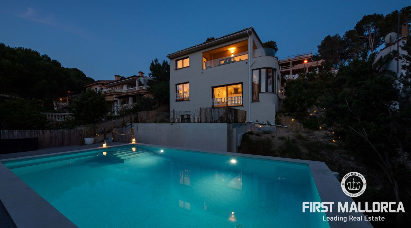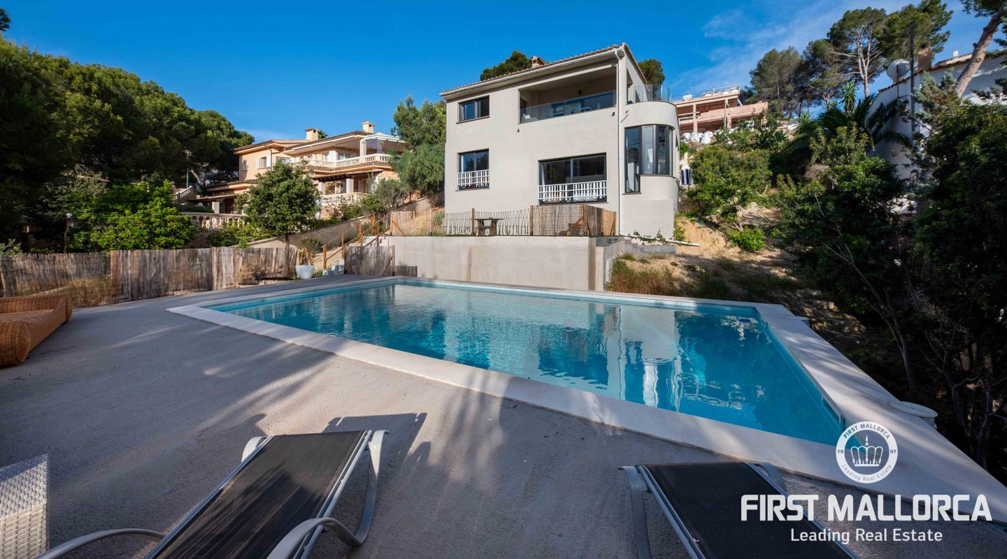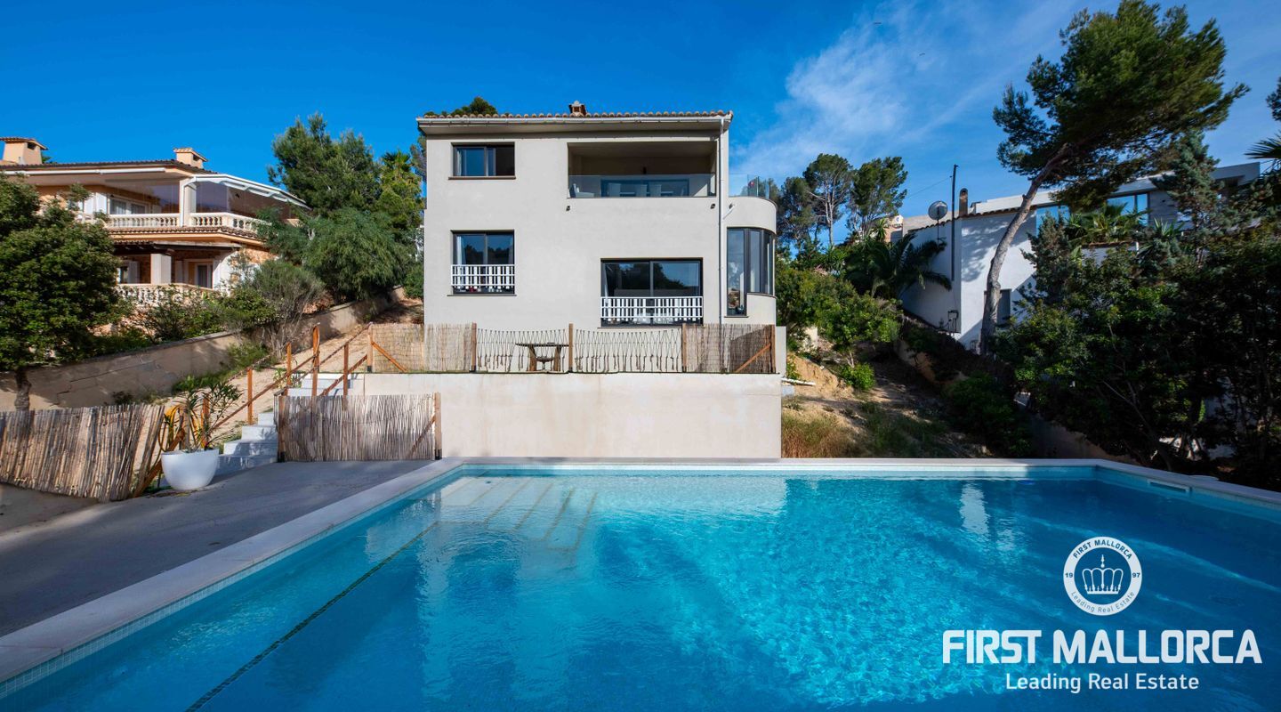 Esta moderna villa en Costa de la Calma fue completamente renovada en 2022. Se ingresa a la casa en la planta baja y se accede a la sala de estar y comedor de planta abierta con cocina abierta. El salón da a la gran terraza con vistas panorámicas al mar. La escalera conduce a los otros 3 dormitorios con 3 baños en suite. El dormitorio principal con amplio vestidor y baños de buen tamaño con vistas al mar y al despacho. dos dormitorios tienen vistas panorámicas al mar. Delante de la casa hay algunos árboles frutales maduros, en la parte trasera hay una amplia zona de piscina con posibilidades de jardín, barbacoa y otras actividades. Hay un apartamento de invitados con cocina al lado de la piscina. La villa está a un minuto a pie de la playa, lo que la convierte en un destino de vacaciones perfecto. Hay un amplio garaje, 2 trasteros y un aseo para invitados. Costa de la Calma es un lugar tranquilo en el municipio de Calvià. Se encuentra en el suroeste de Mallorca con numerosos puertos deportivos, campos de golf, escuelas internacionales, hermosas bahías y excelente infraestructura. también está a 20 min en coche de Palma y 25 min del aeropuerto.